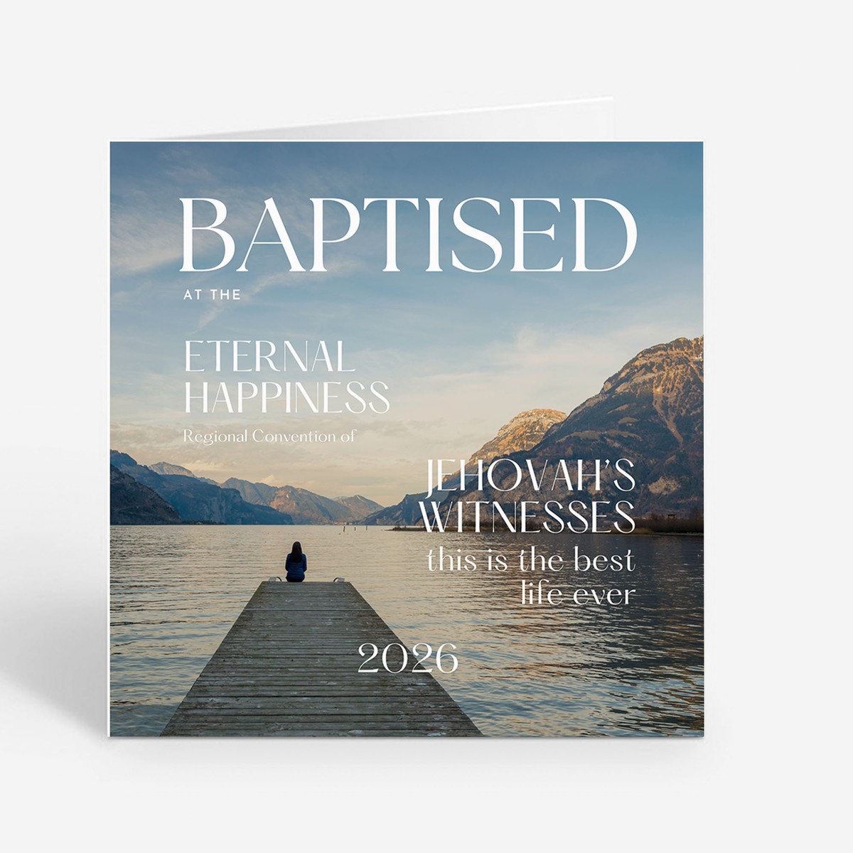 This peaceful greeting card features a serene lakeside scene with soft mountain views and gentle reflections, paired with the words “Baptised at the Eternal Happiness Regional Convention 2026”.