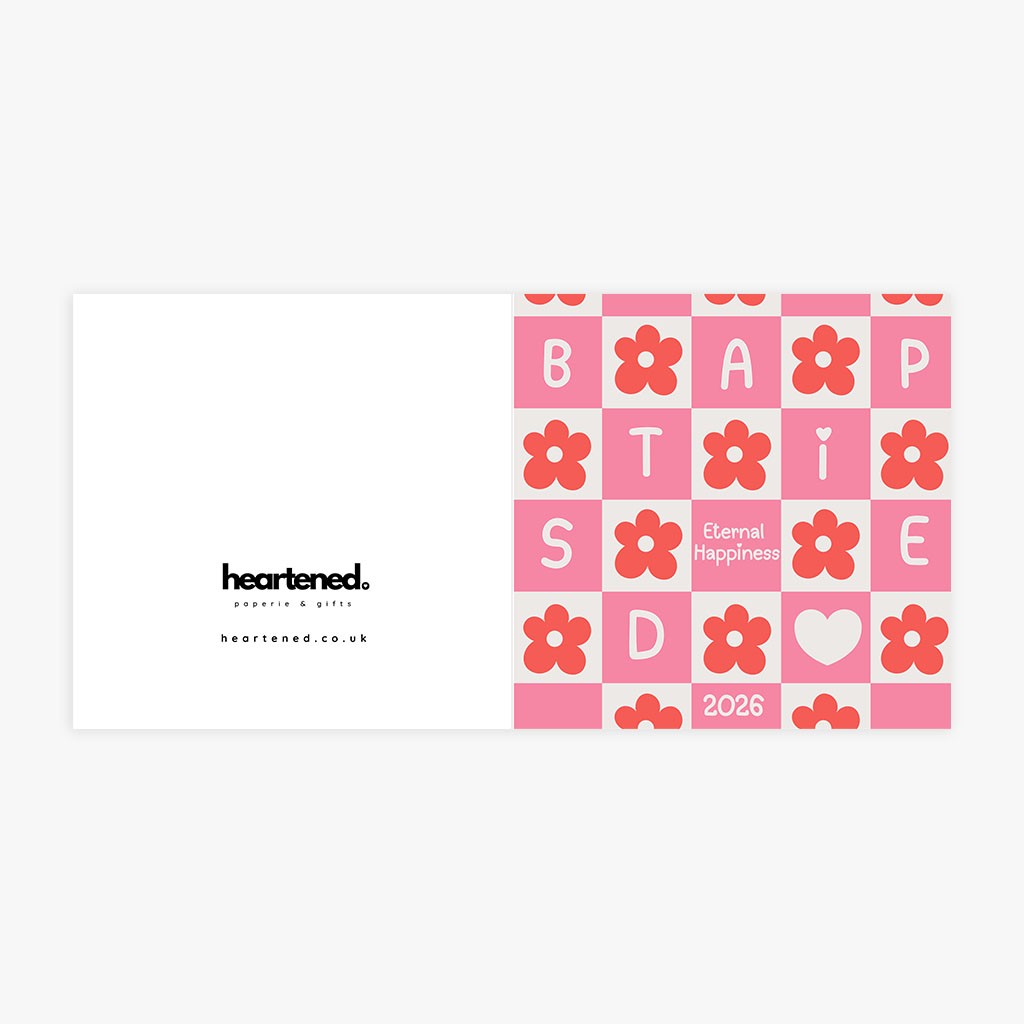 This joyful greeting card features a soft pink checkerboard design with bold floral accents and the uplifting words “Baptised – Eternal Happiness 2026”.