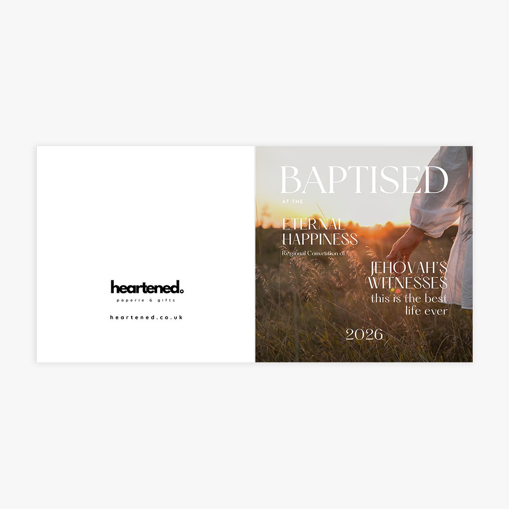 This beautiful greeting card features a warm sunset scene with golden light across a peaceful field, paired with the words “Baptised at the Eternal Happiness Regional Convention 2026”.