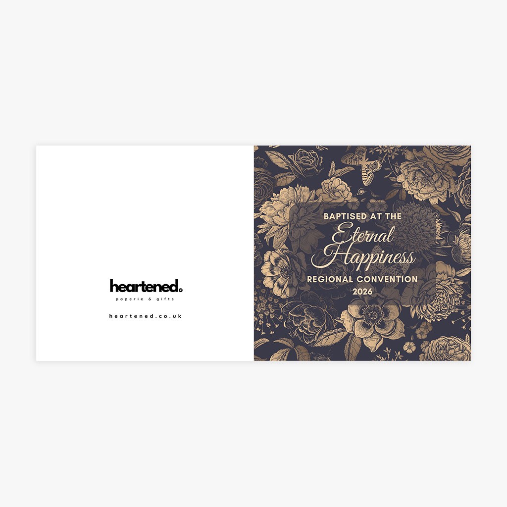 This beautifully detailed greeting card features an elegant floral illustration in dark and warm neutral tones, with the wording “Baptised at the Eternal Happiness Regional Convention 2026”.