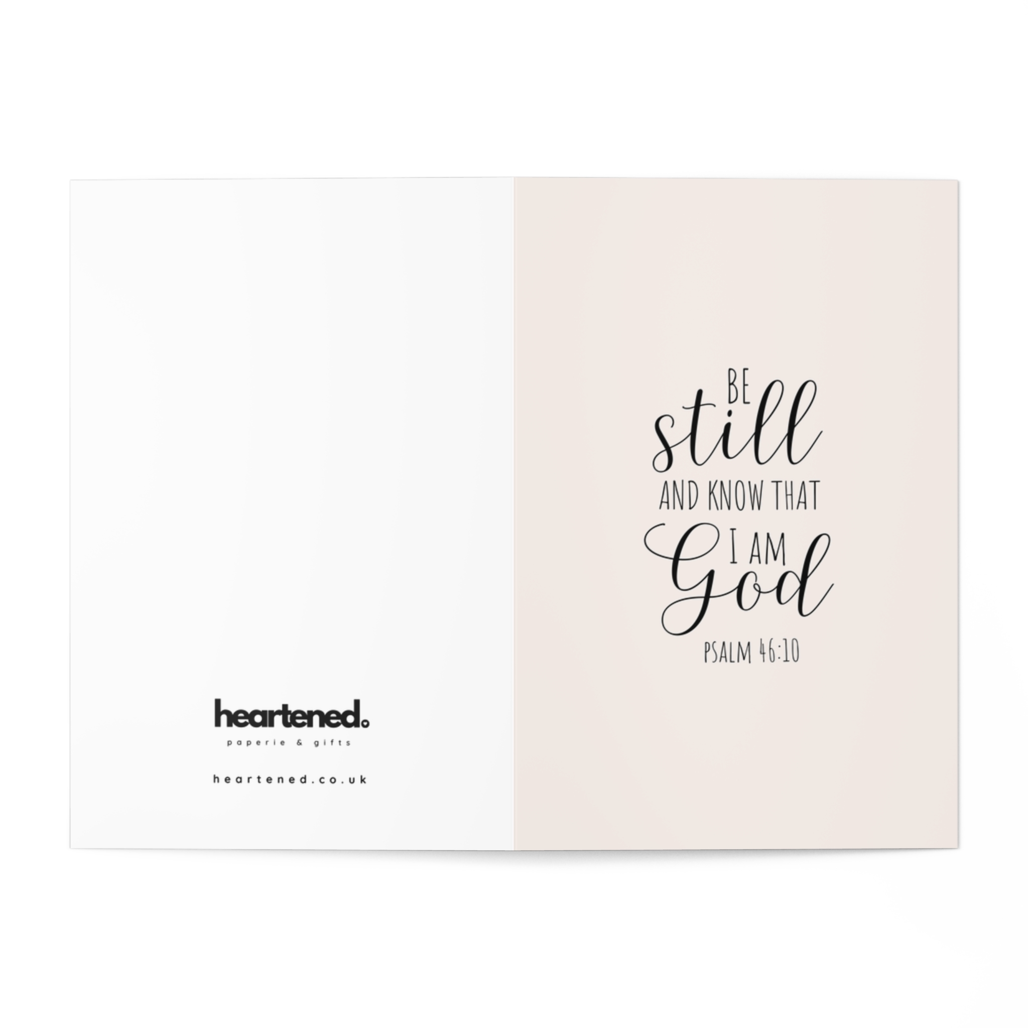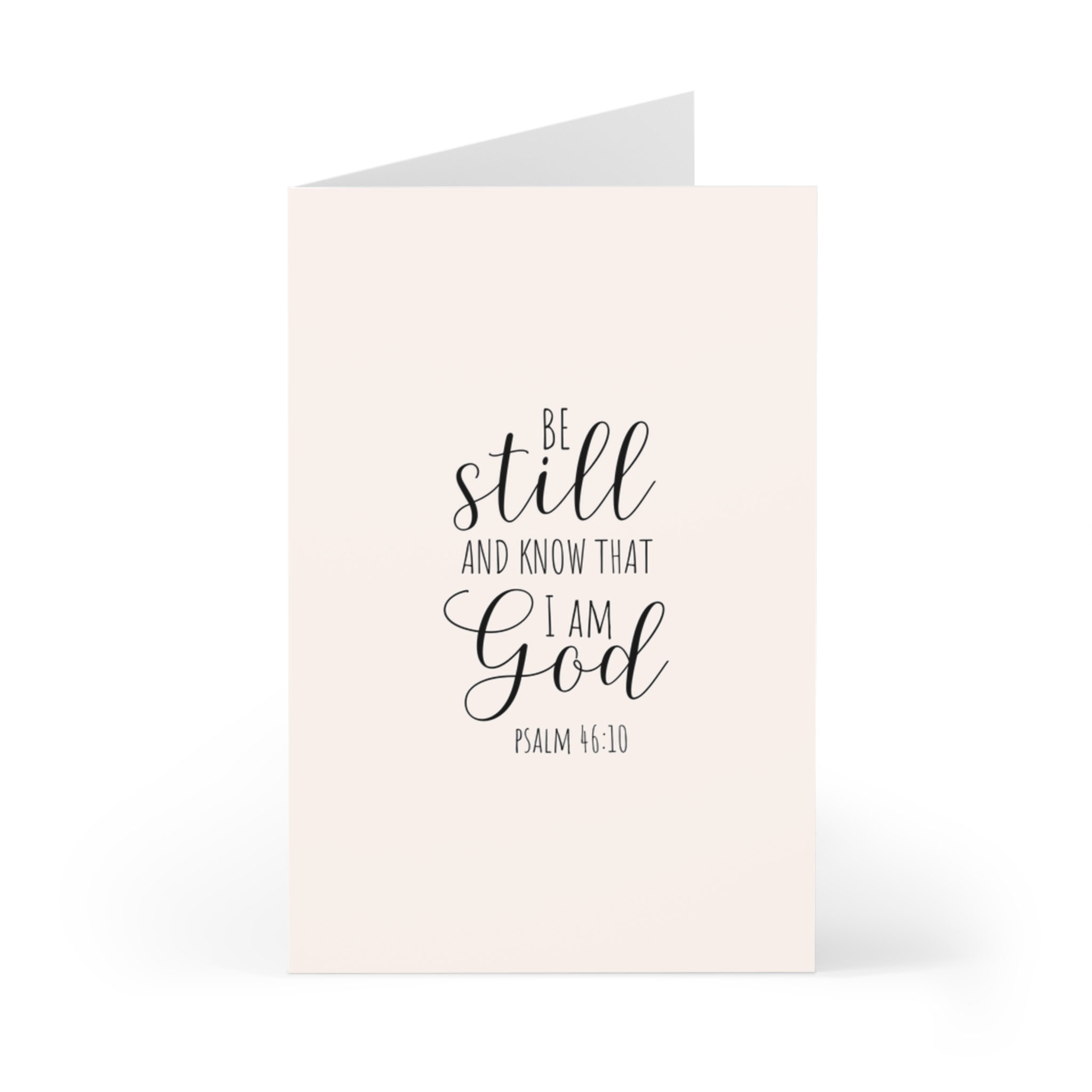 This elegant greeting card features the comforting words “Be still and know that I am God” from Psalm 46:10, set in a soft, minimal design.