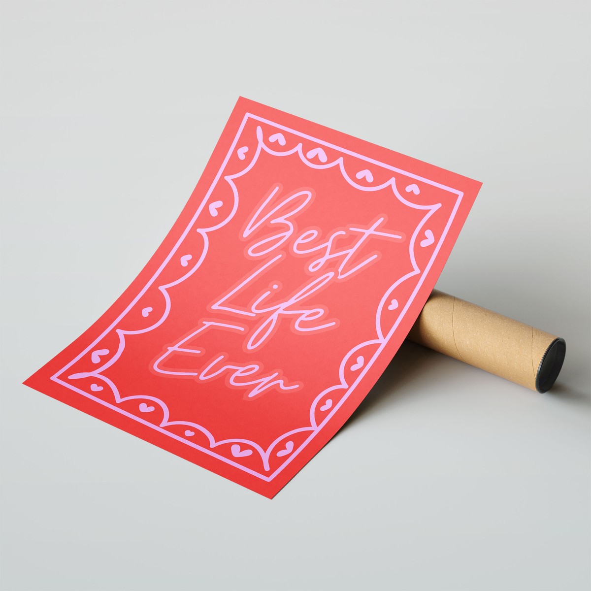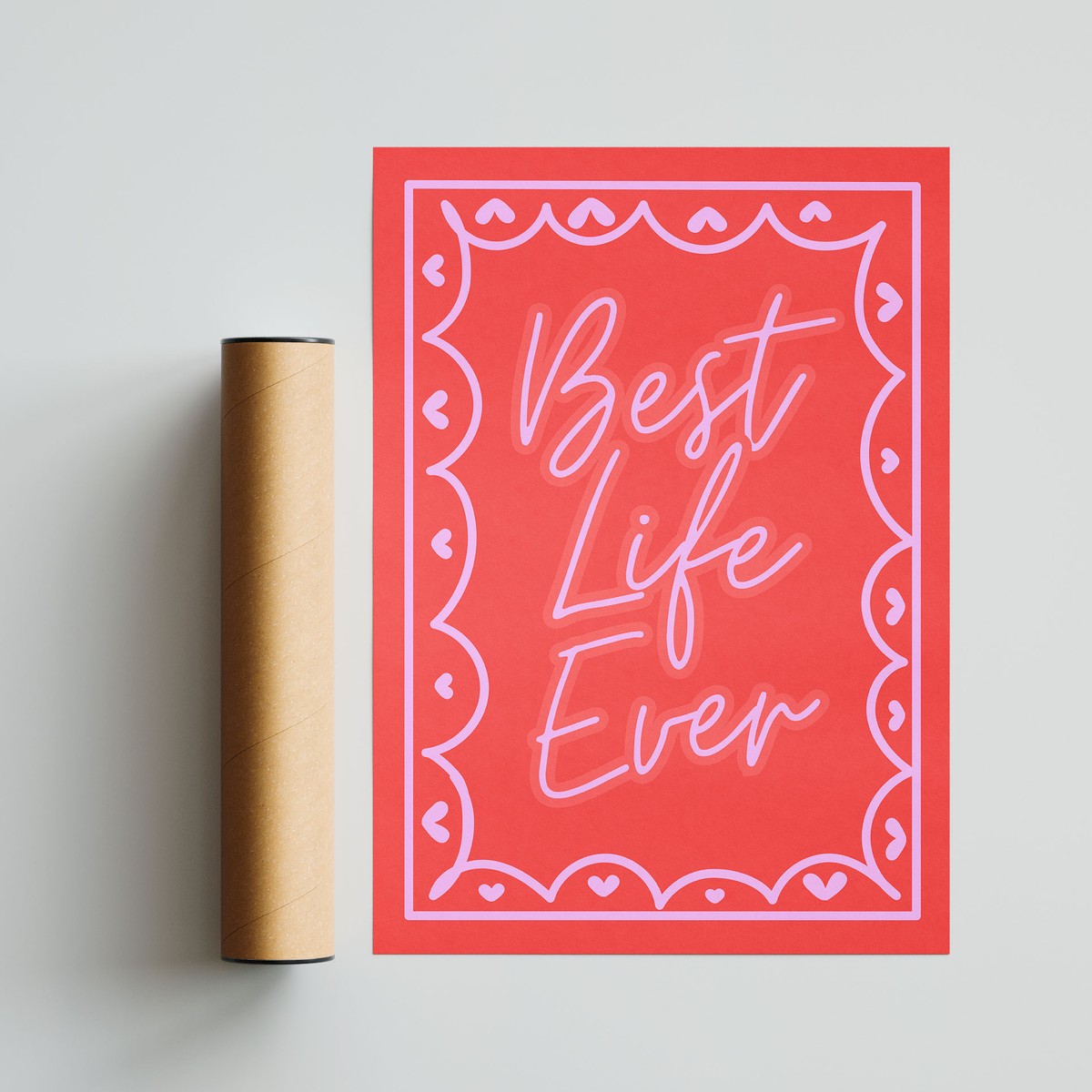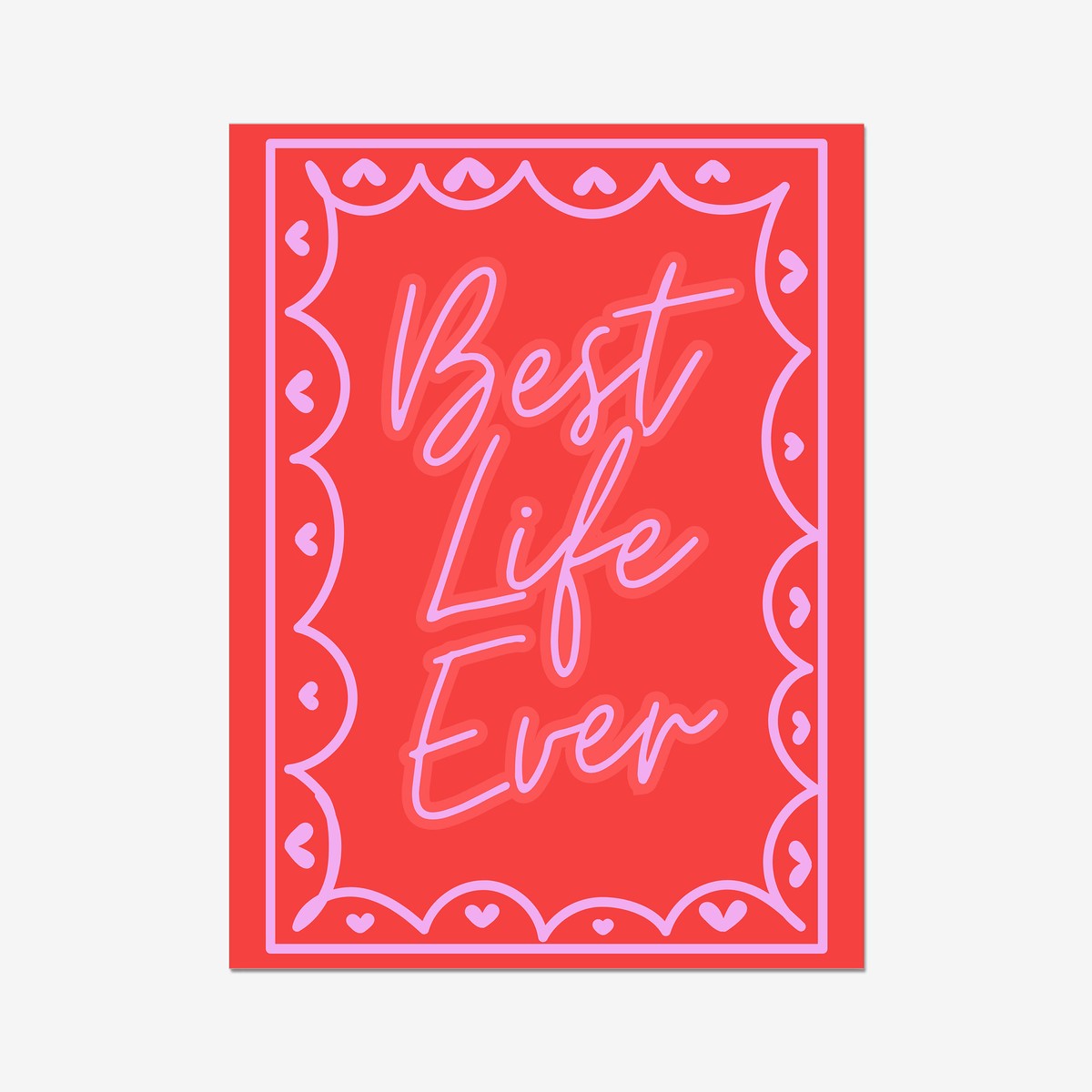 A bold and uplifting typographic print featuring the phrase “Best Life Ever” in a decorative hand-lettered style. A vibrant piece designed to bring positivity and joy to any space.