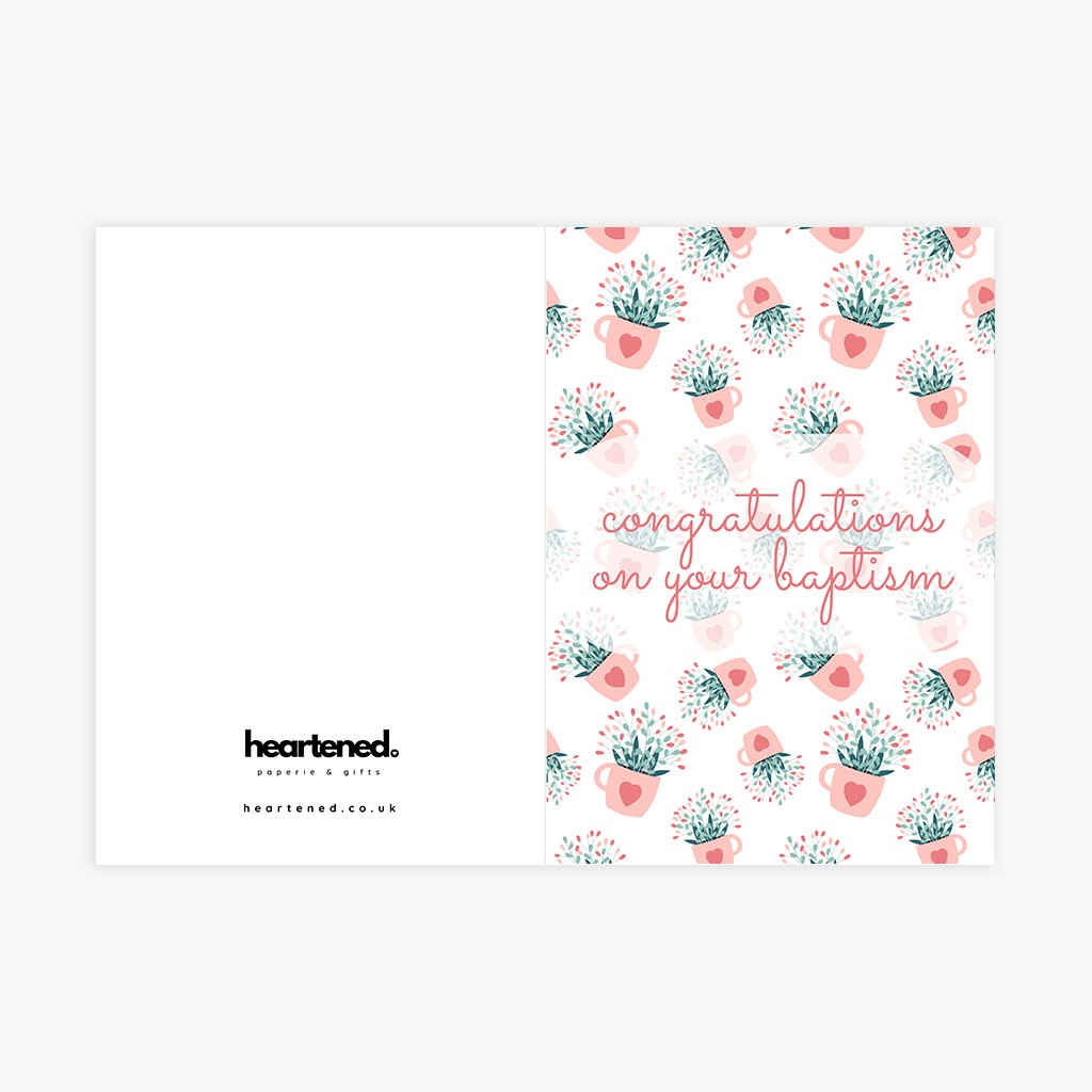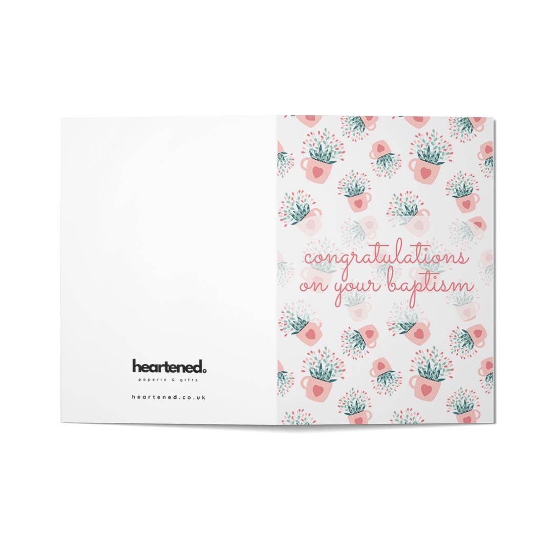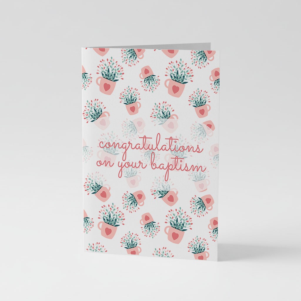 Celebrate a meaningful step in faith with this sweet “Congratulations on Your Baptism” greeting card. The design features a delicate repeating pattern of small cups and floral sprigs in soft pink and green tones, creating a gentle and joyful look perfect for such a special occasion.