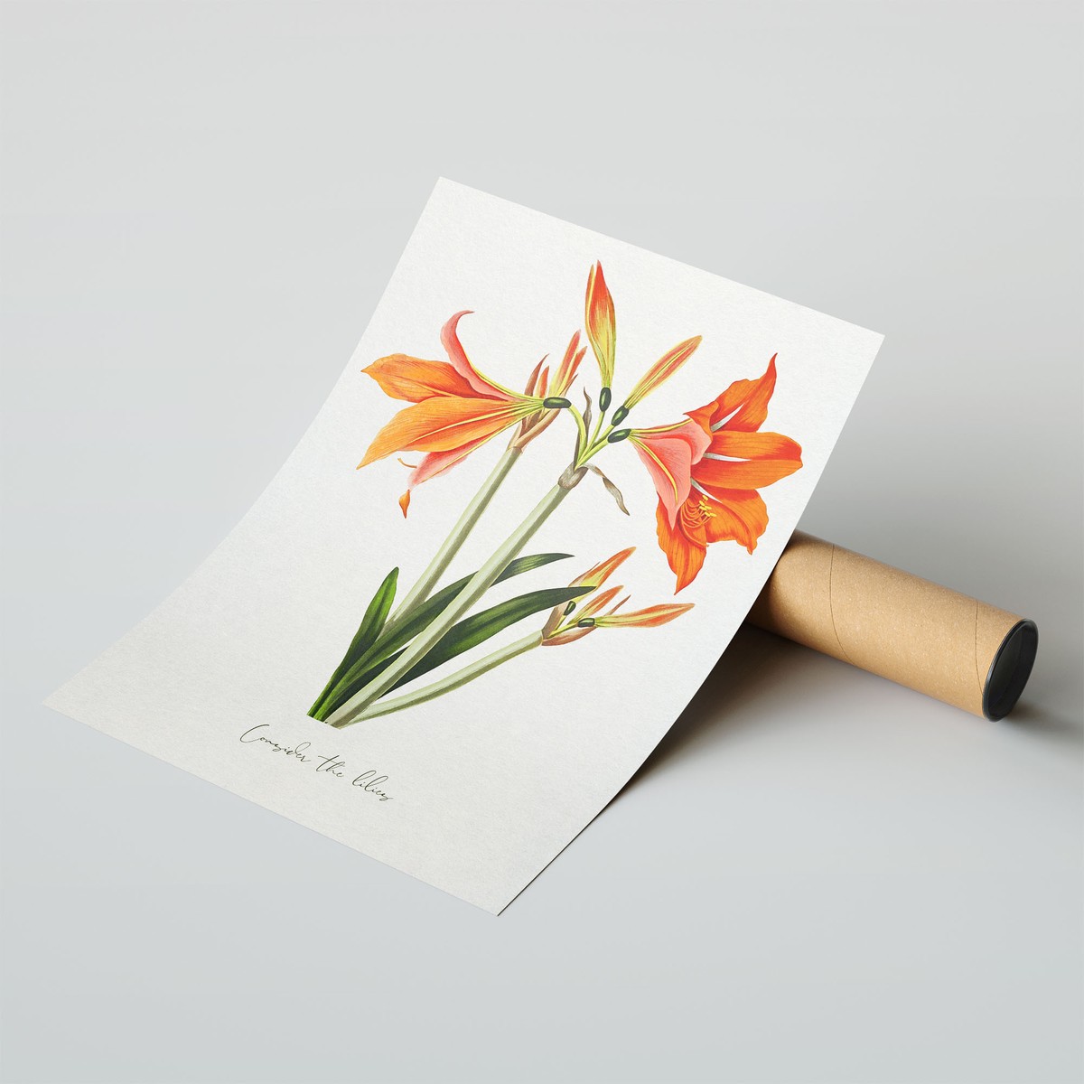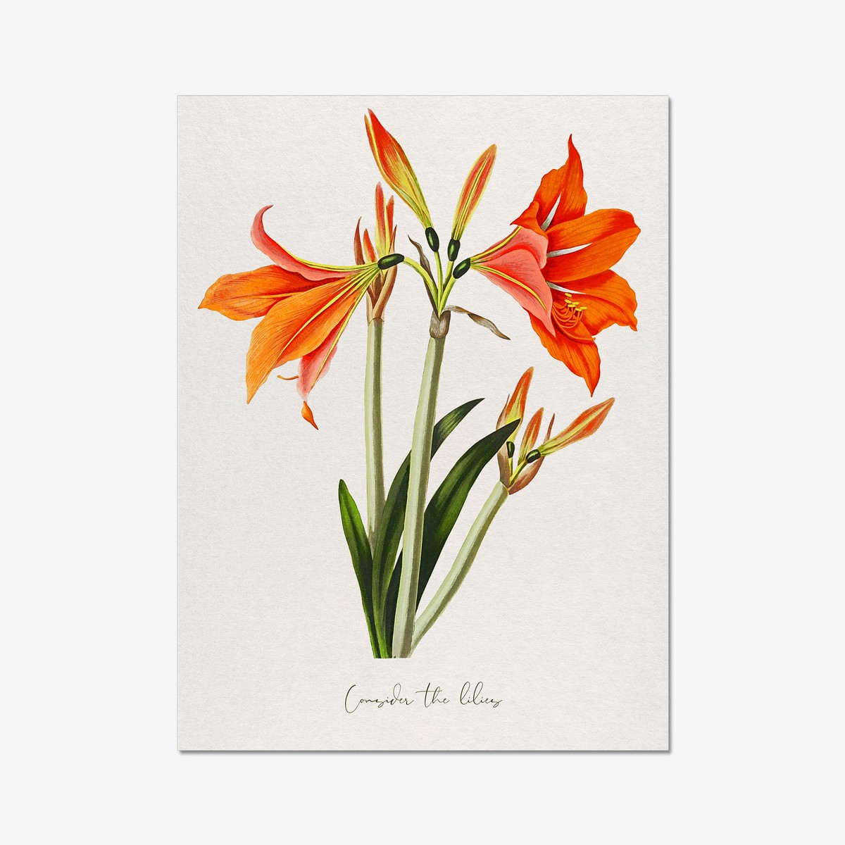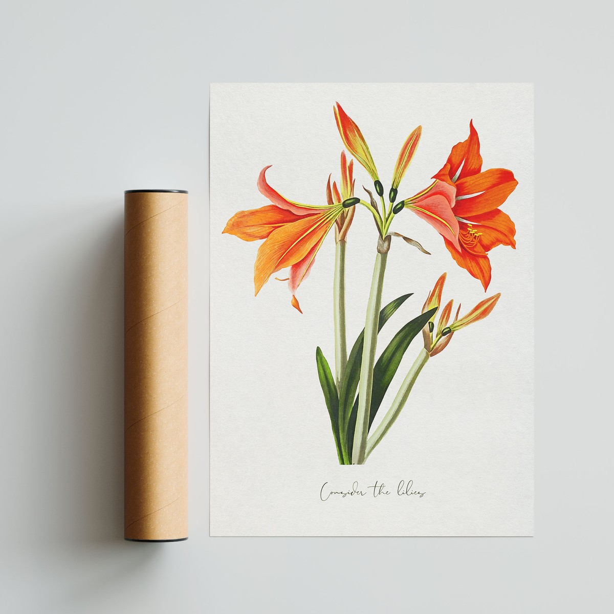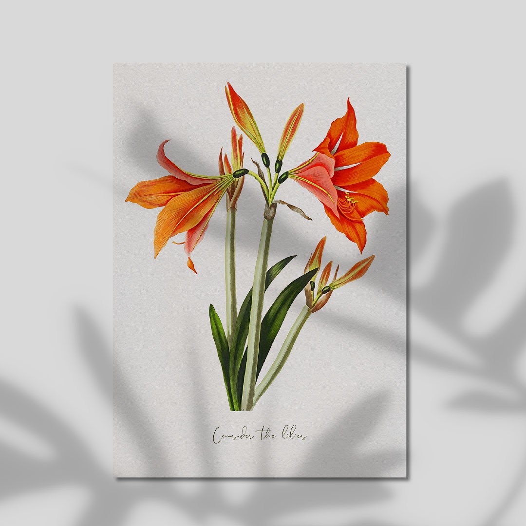 A delicate botanical illustration featuring vibrant orange lilies, scripture “Consider the lillies”, perfect for adding a fresh, nature-inspired touch to your home.