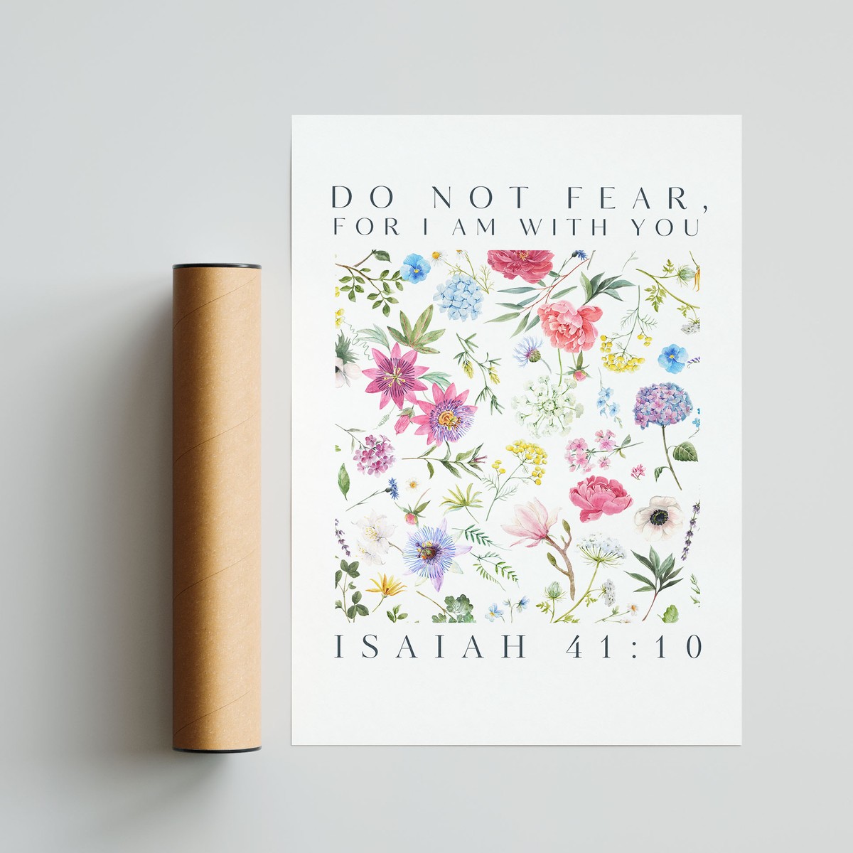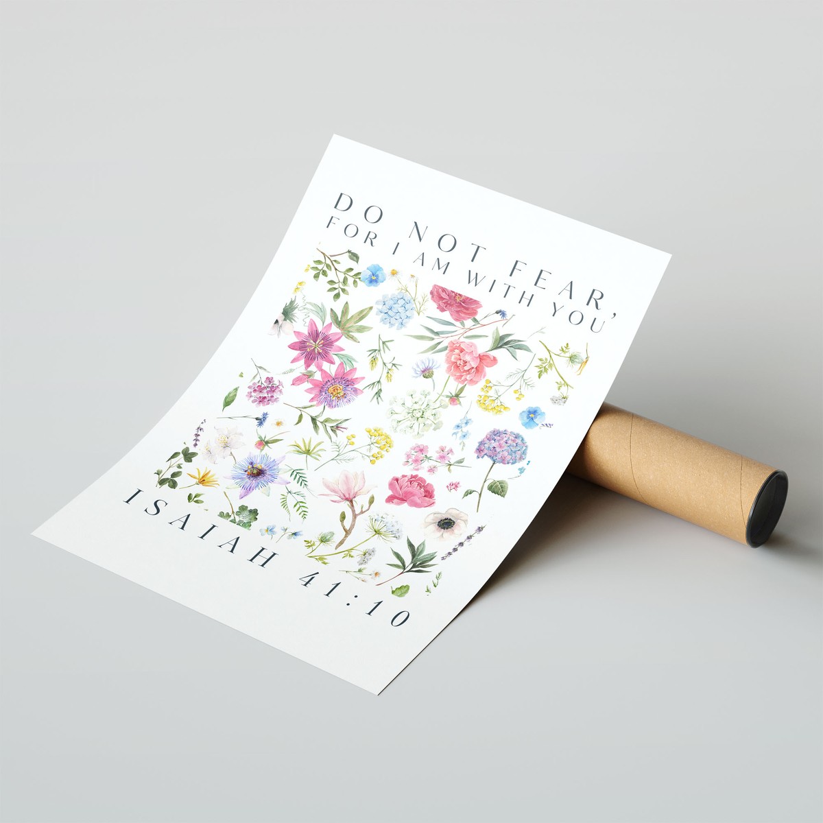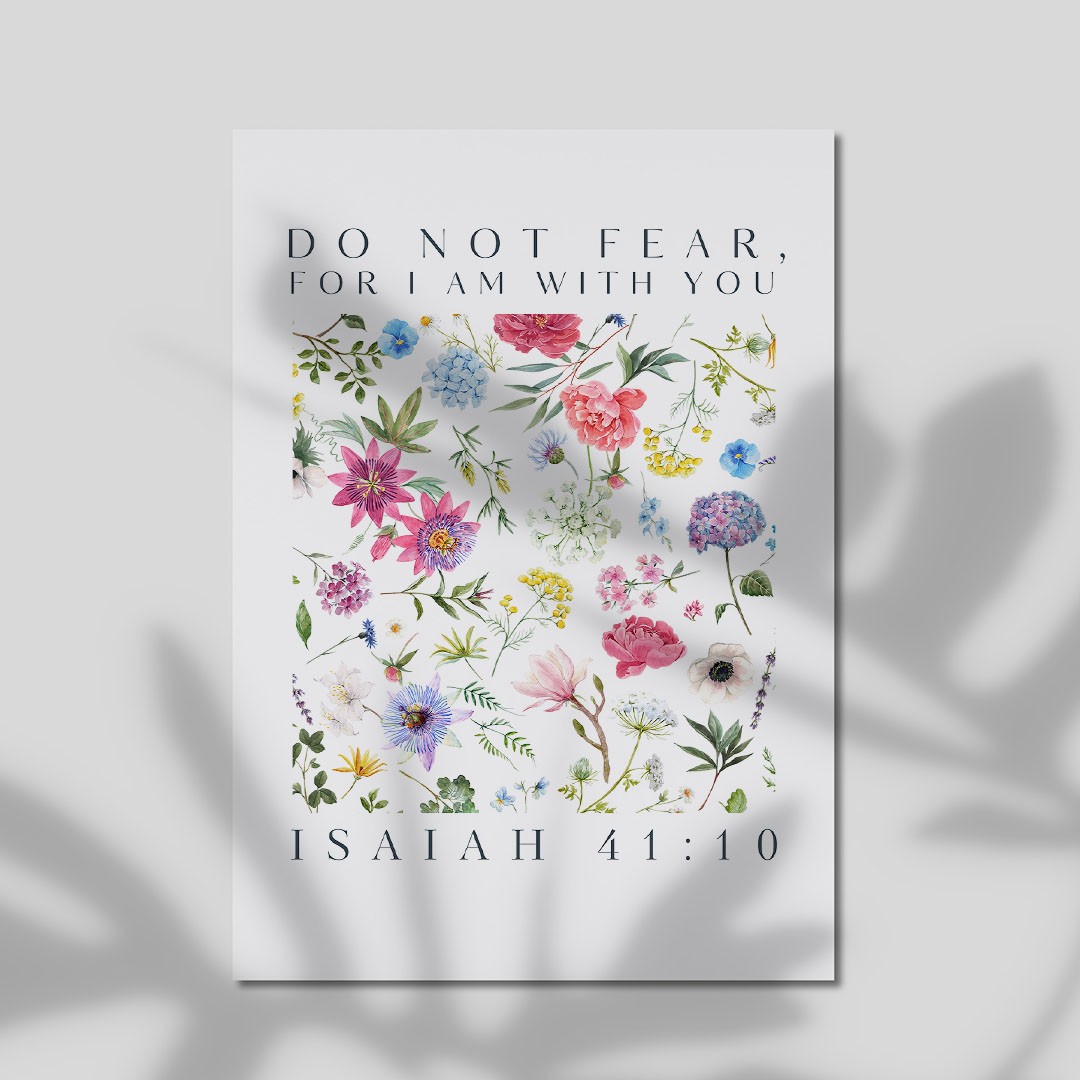 A calming botanical wall art print featuring the reassuring words “Do not fear, for I am with you” – Isaiah 41:10. The soft floral design adds a light, uplifting feel while keeping the focus on this powerful message of comfort and strength.