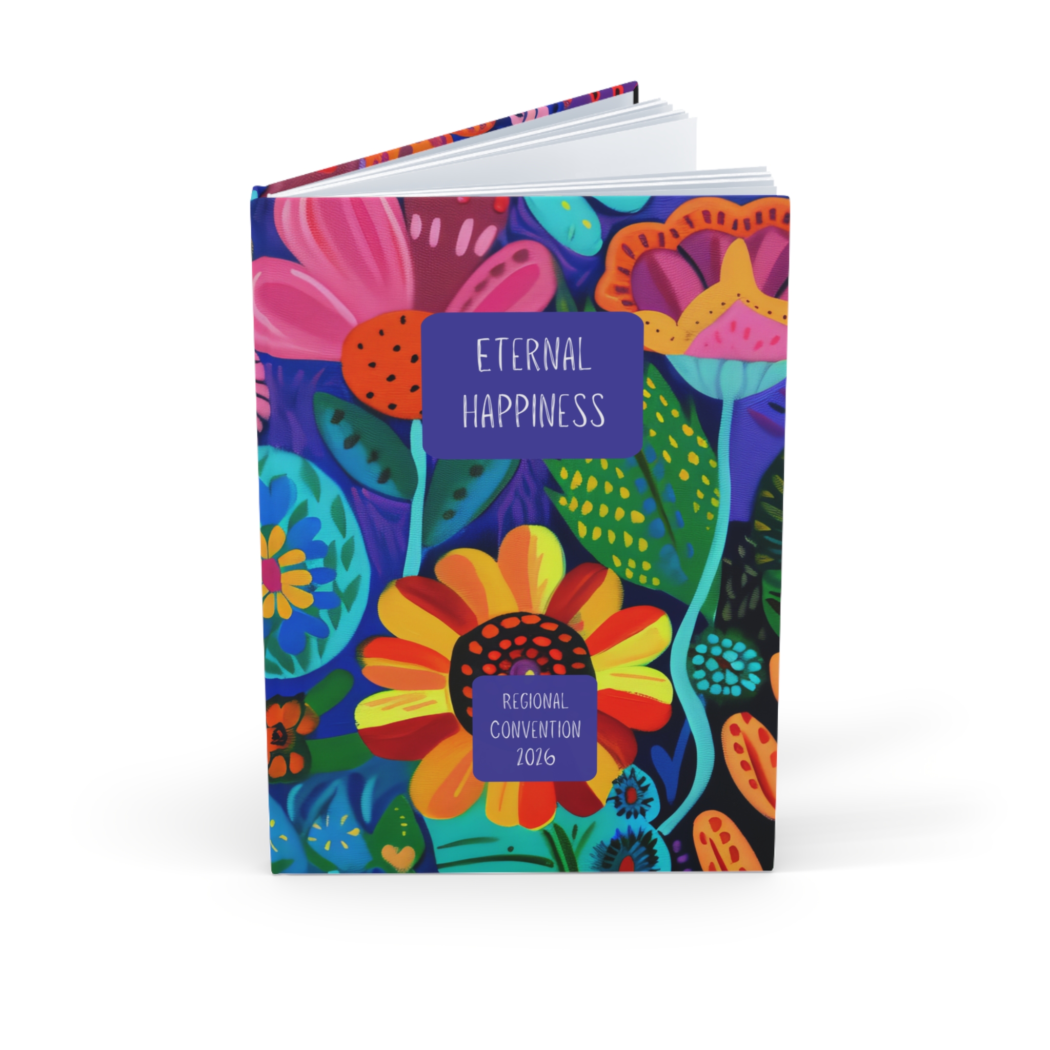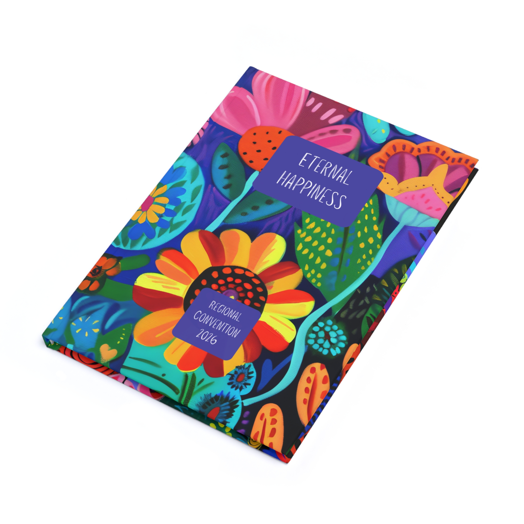 This A5 hardback journal features a vibrant floral design filled with bold colours and playful botanical patterns, inspired by the Eternal Happiness 2026 Regional Convention.