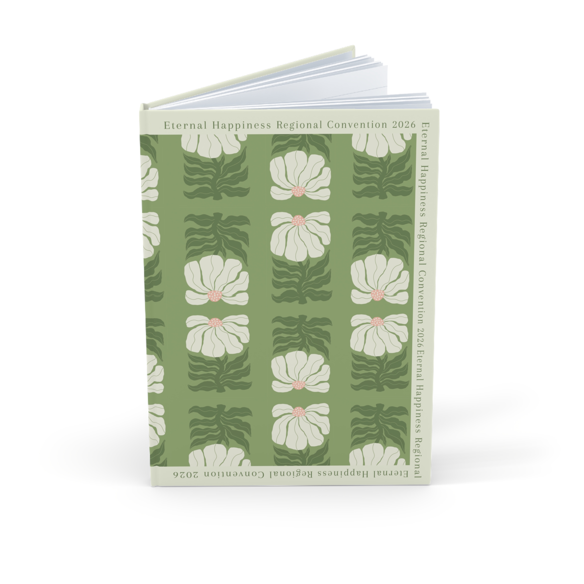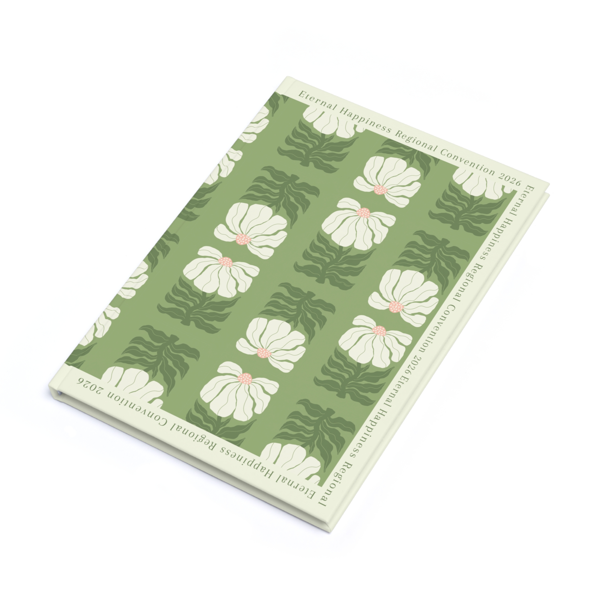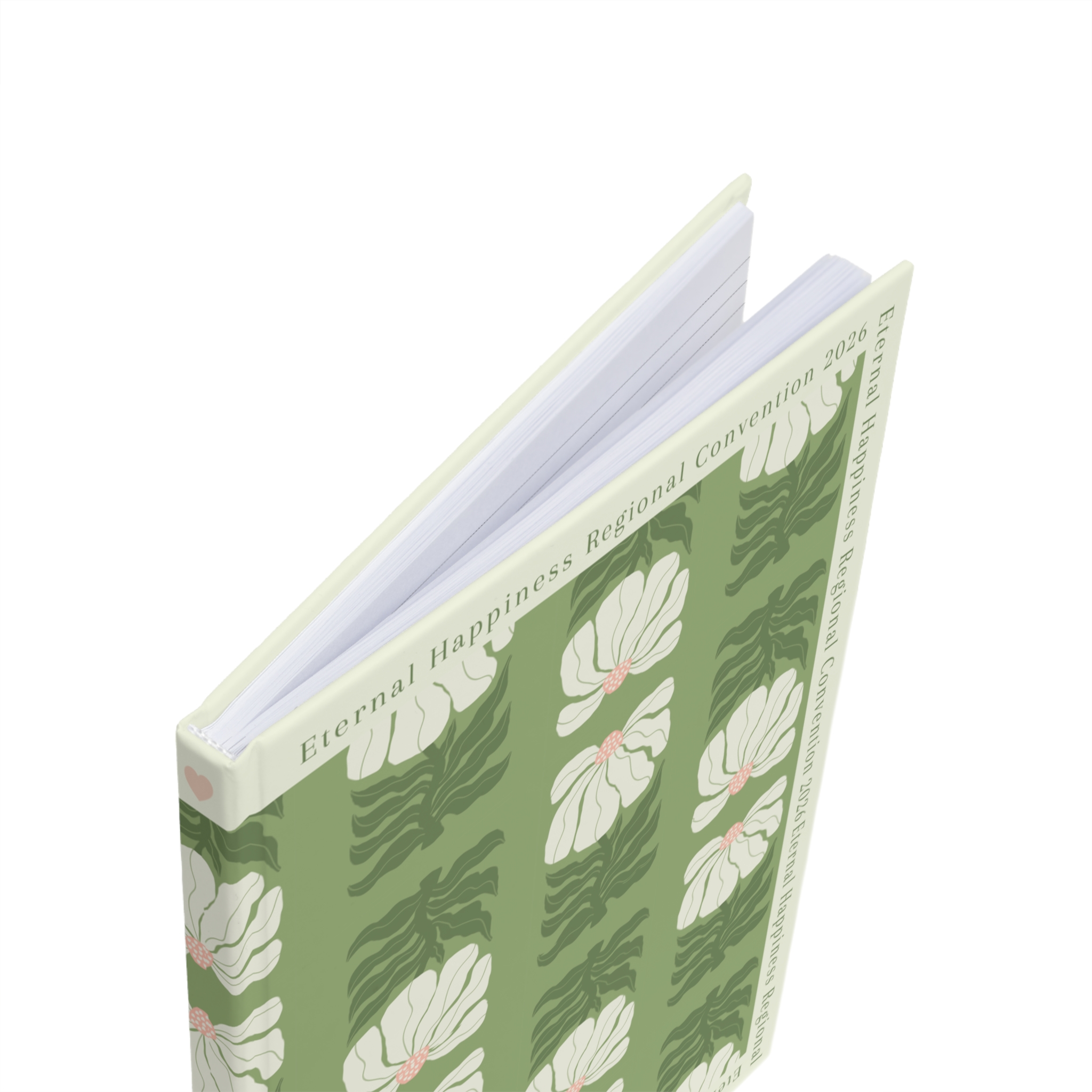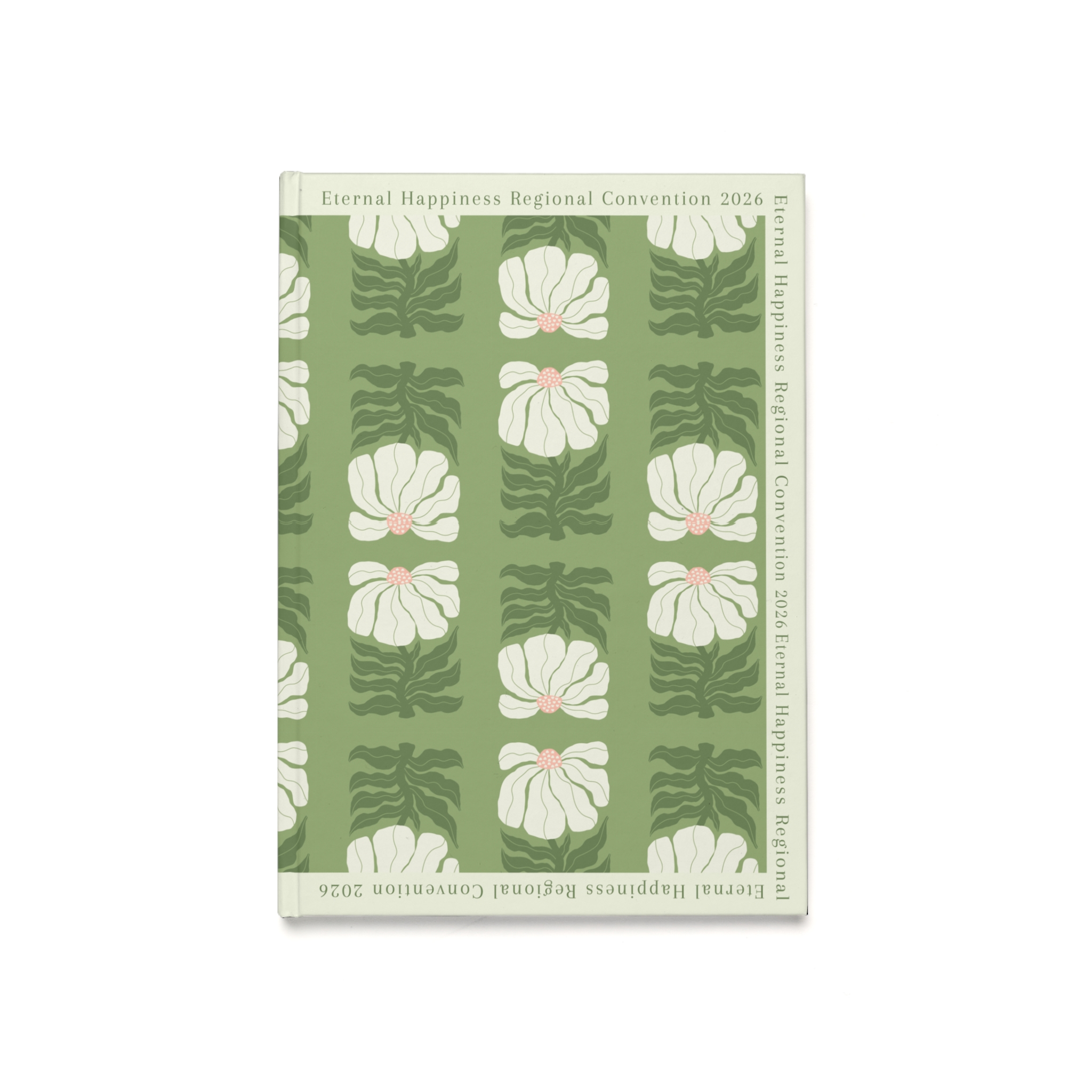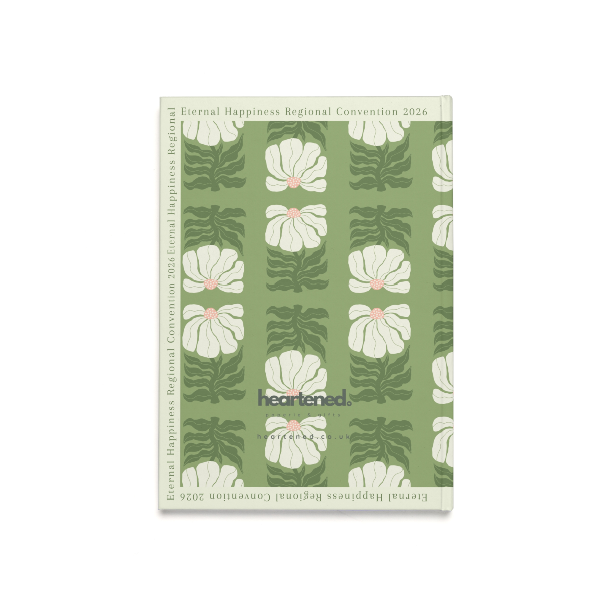 This A5 hardback journal features a fresh green botanical design with a repeating floral pattern, inspired by the Eternal Happiness 2026 Regional Convention.