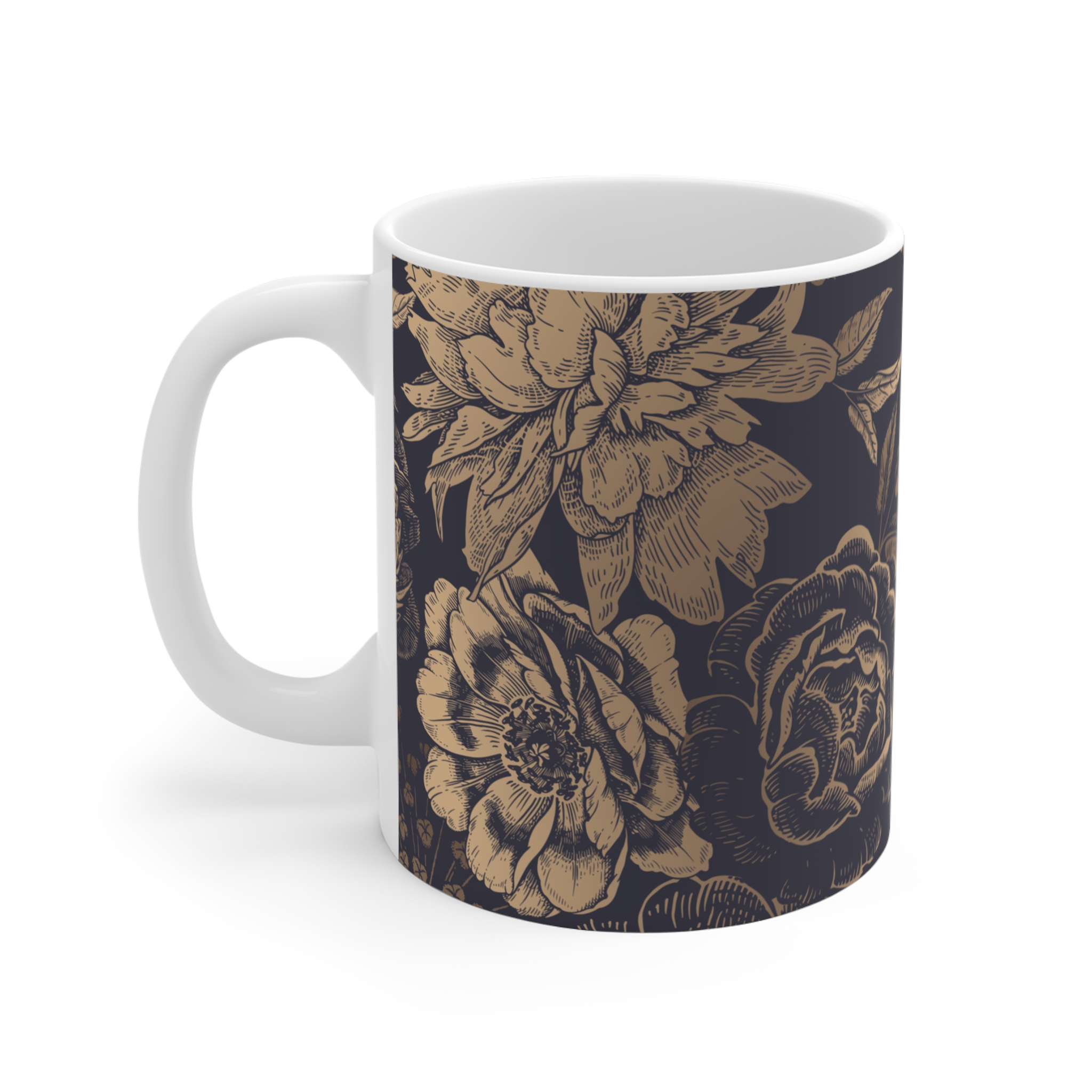 Featuring intricate floral artwork in rich, deep tones, this mug has a timeless, almost heritage-inspired feel.