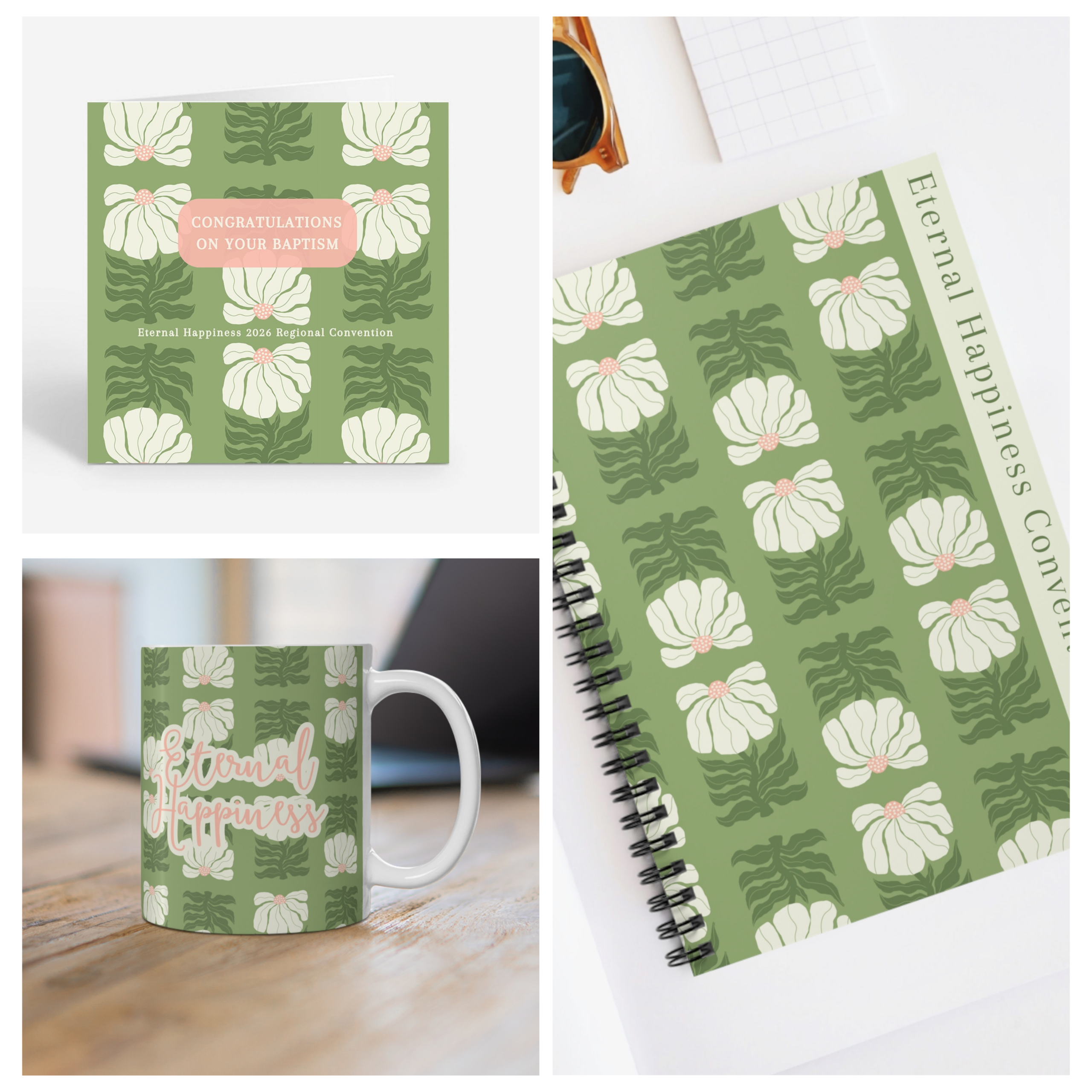 A beautifully soft and calming gift set featuring a delicate floral pattern in gentle green tones. Designed for the Eternal Happiness Regional Convention 2026, this coordinated set includes a greeting card, mug, and spiral notebook—perfect for celebrating meaningful moments.