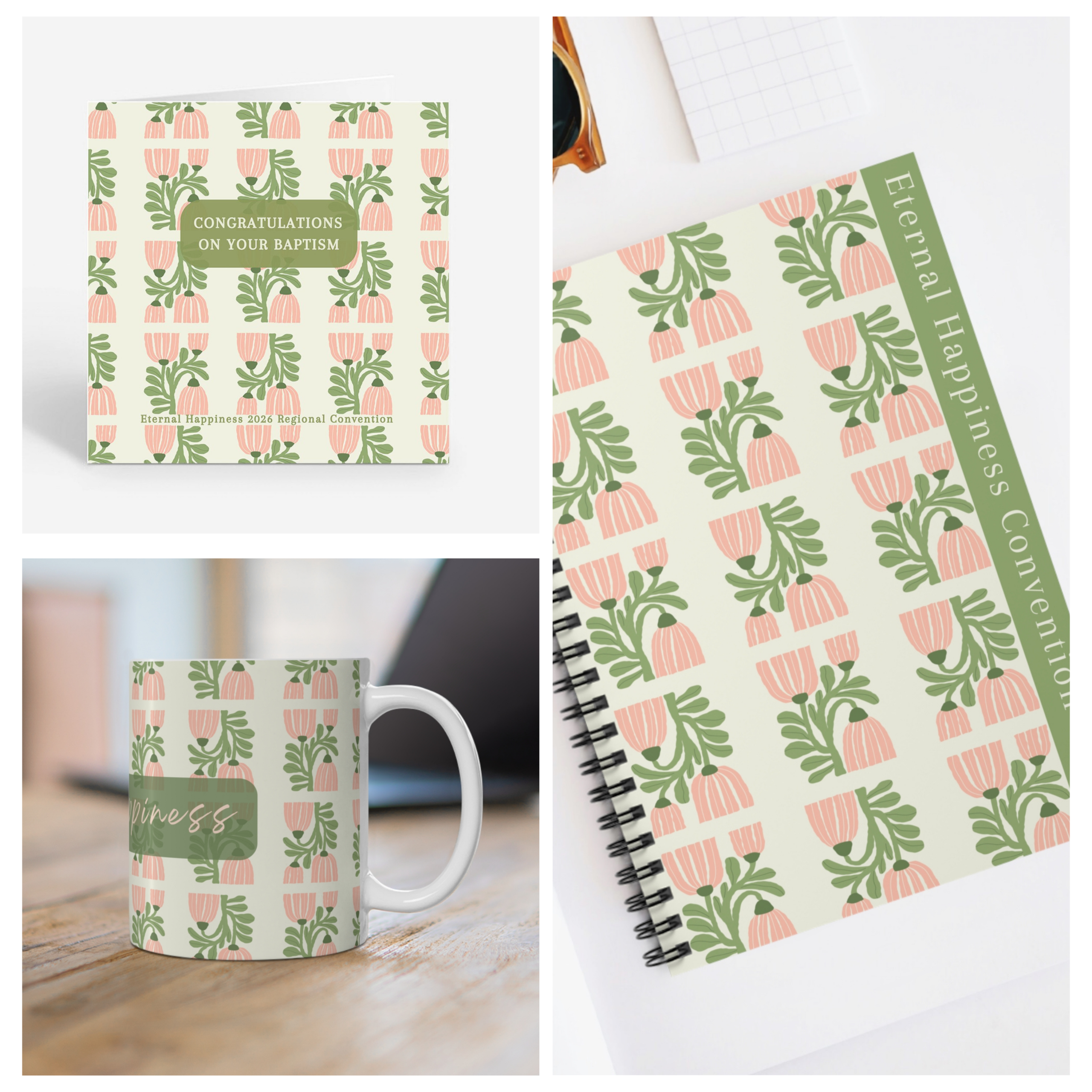 A gentle and elegant gift set featuring a soft botanical pattern in warm peach and green tones. Created for the Eternal Happiness Regional Convention 2026, this coordinated set includes a greeting card, mug, and spiral notebook.