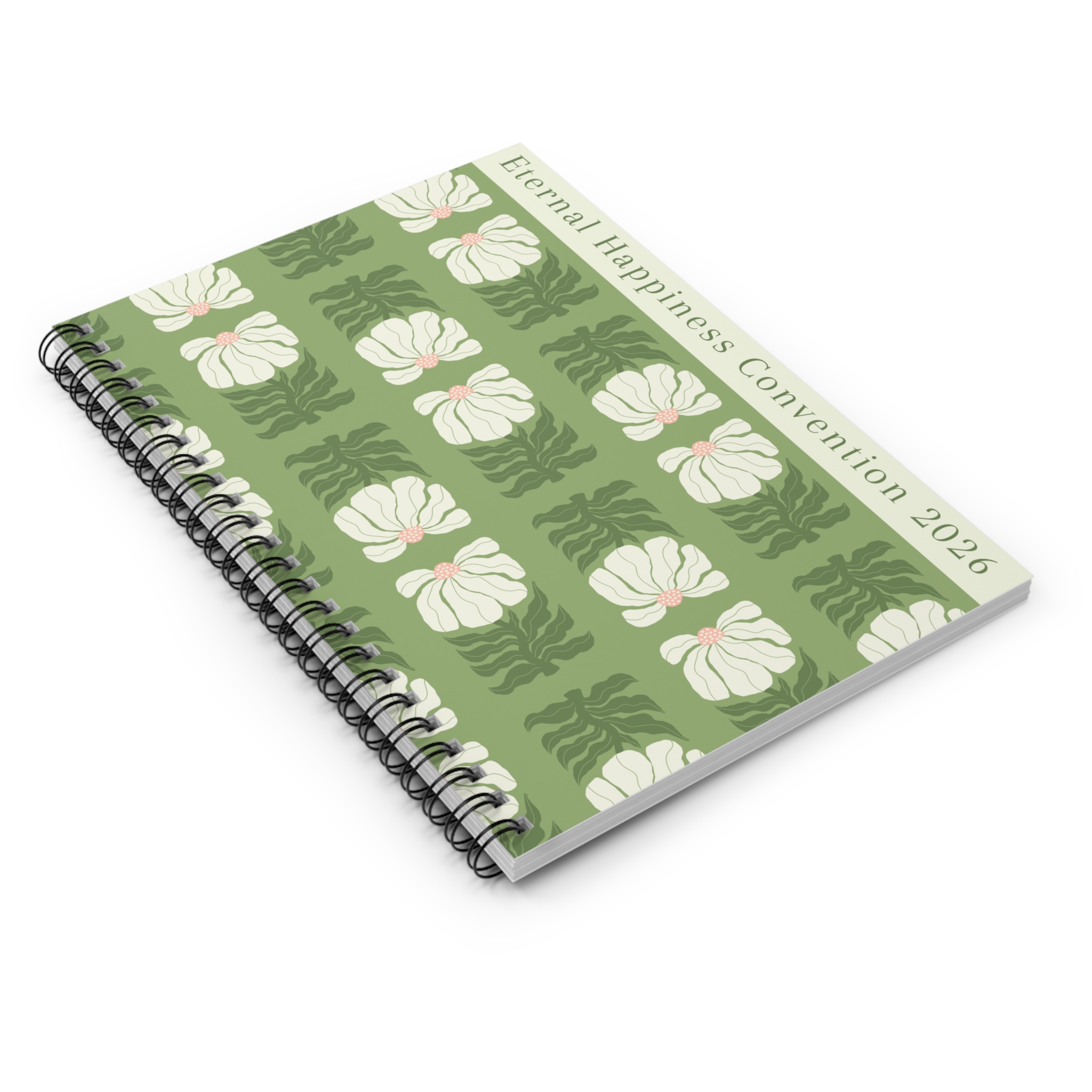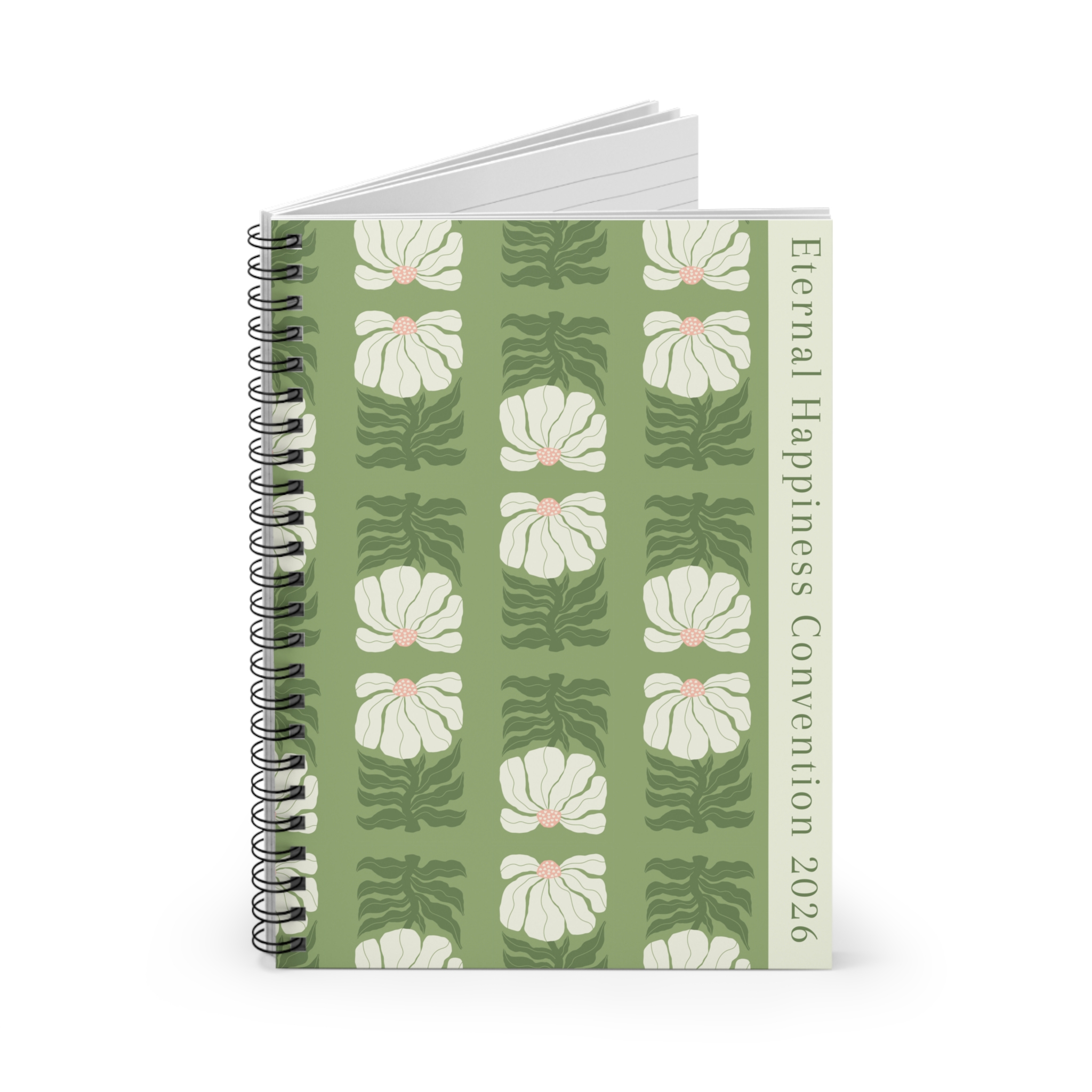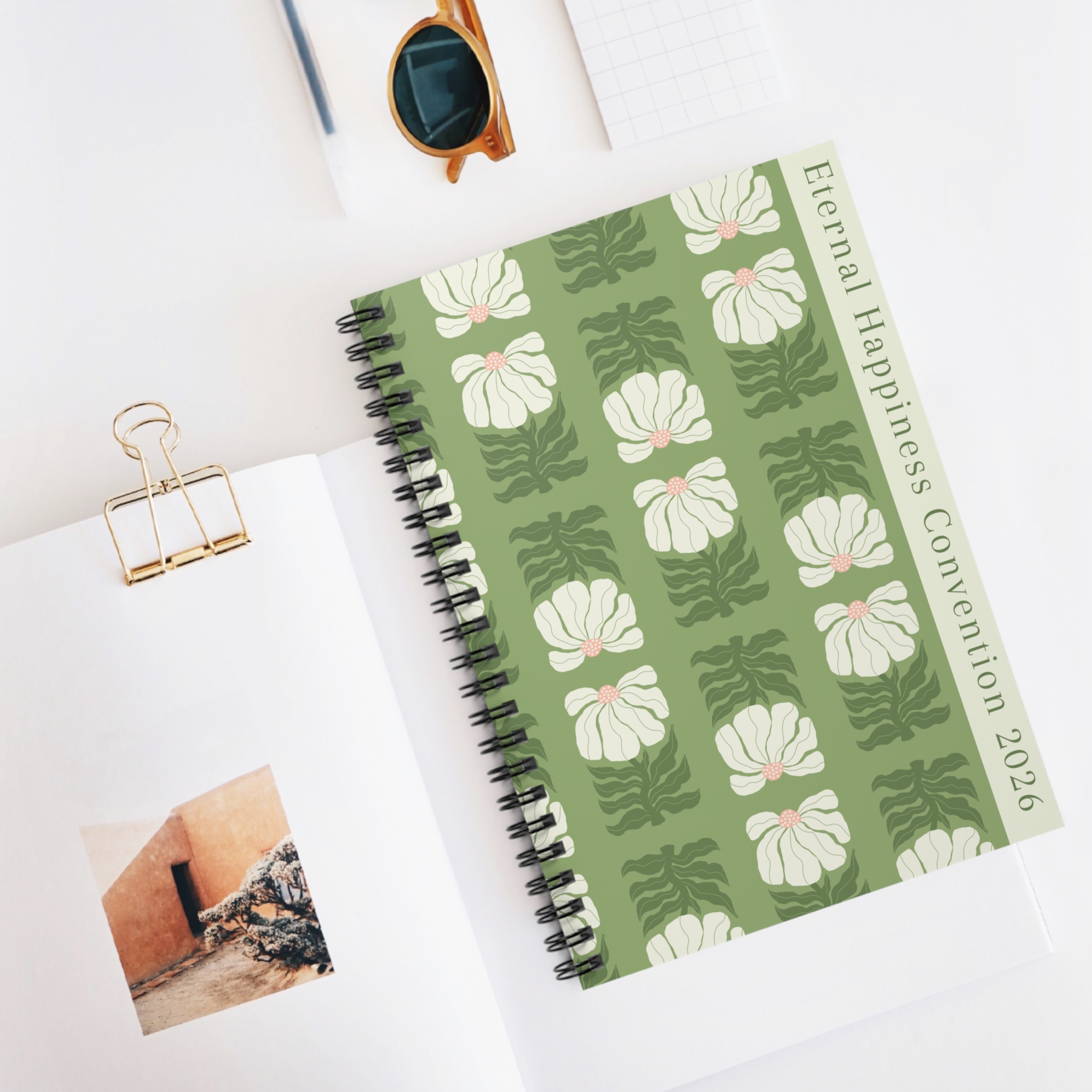 A beautifully retro spiral-bound notebook featuring a preryy green botanical design.
