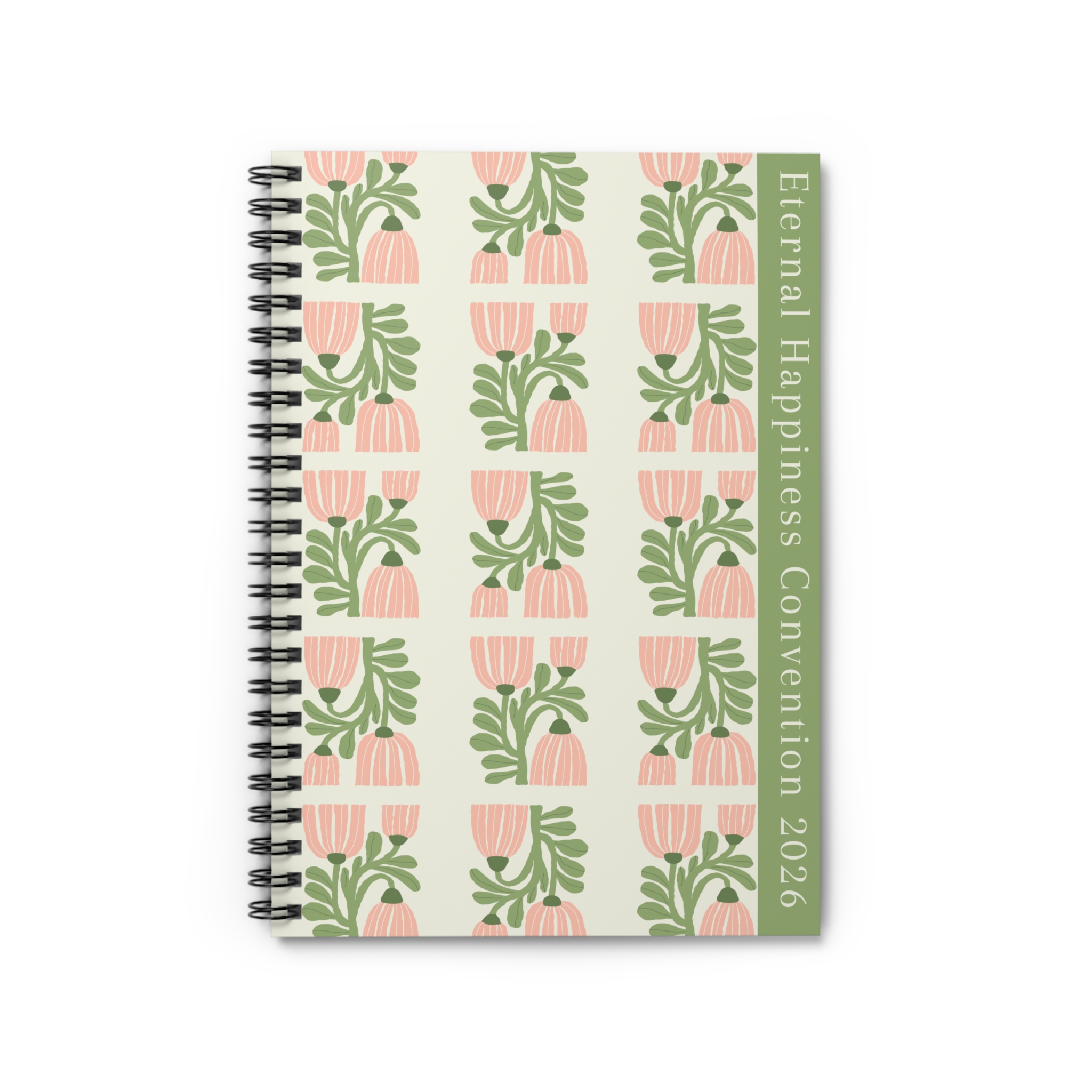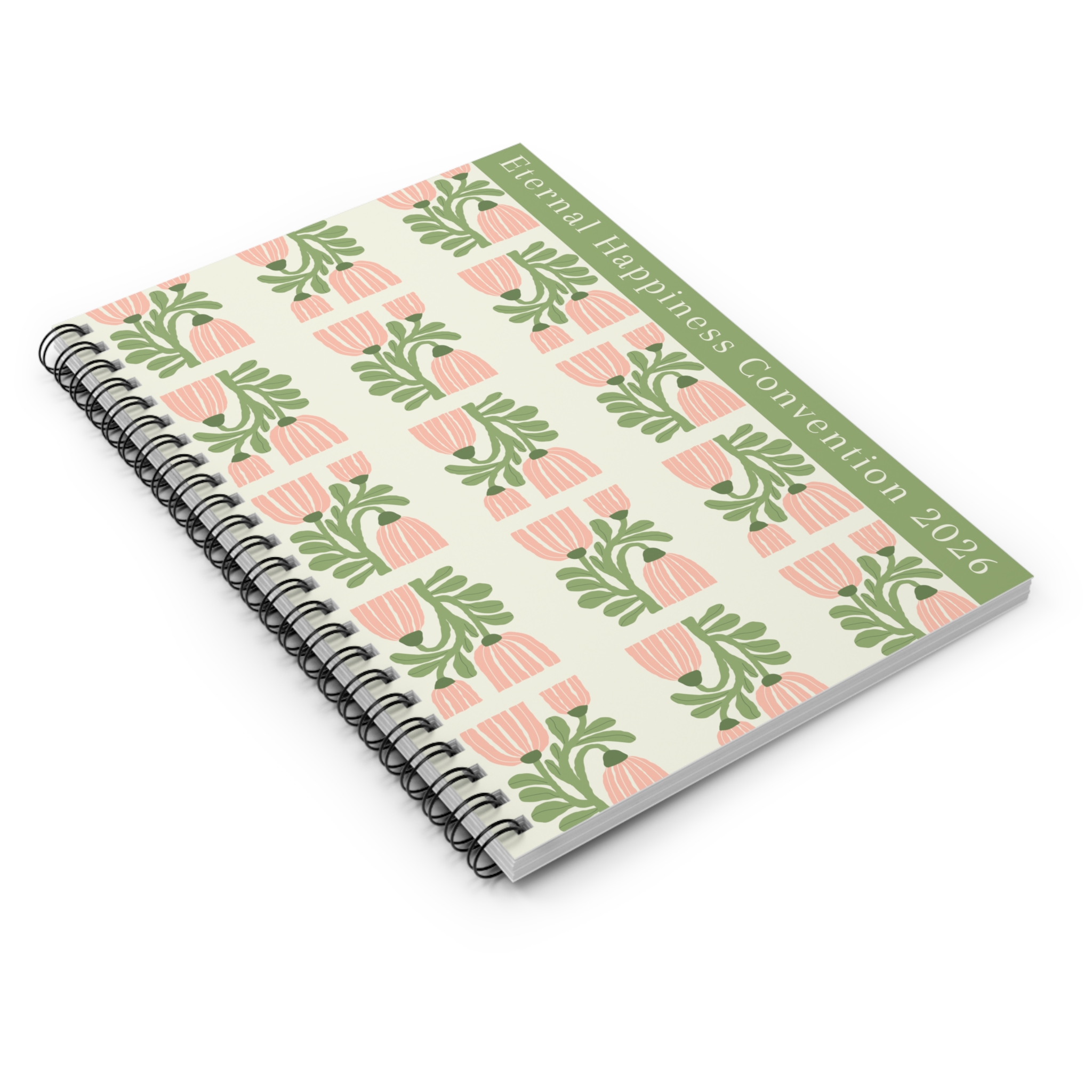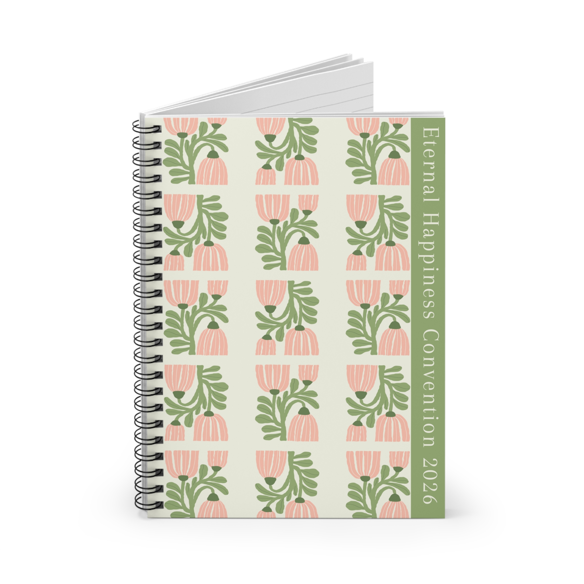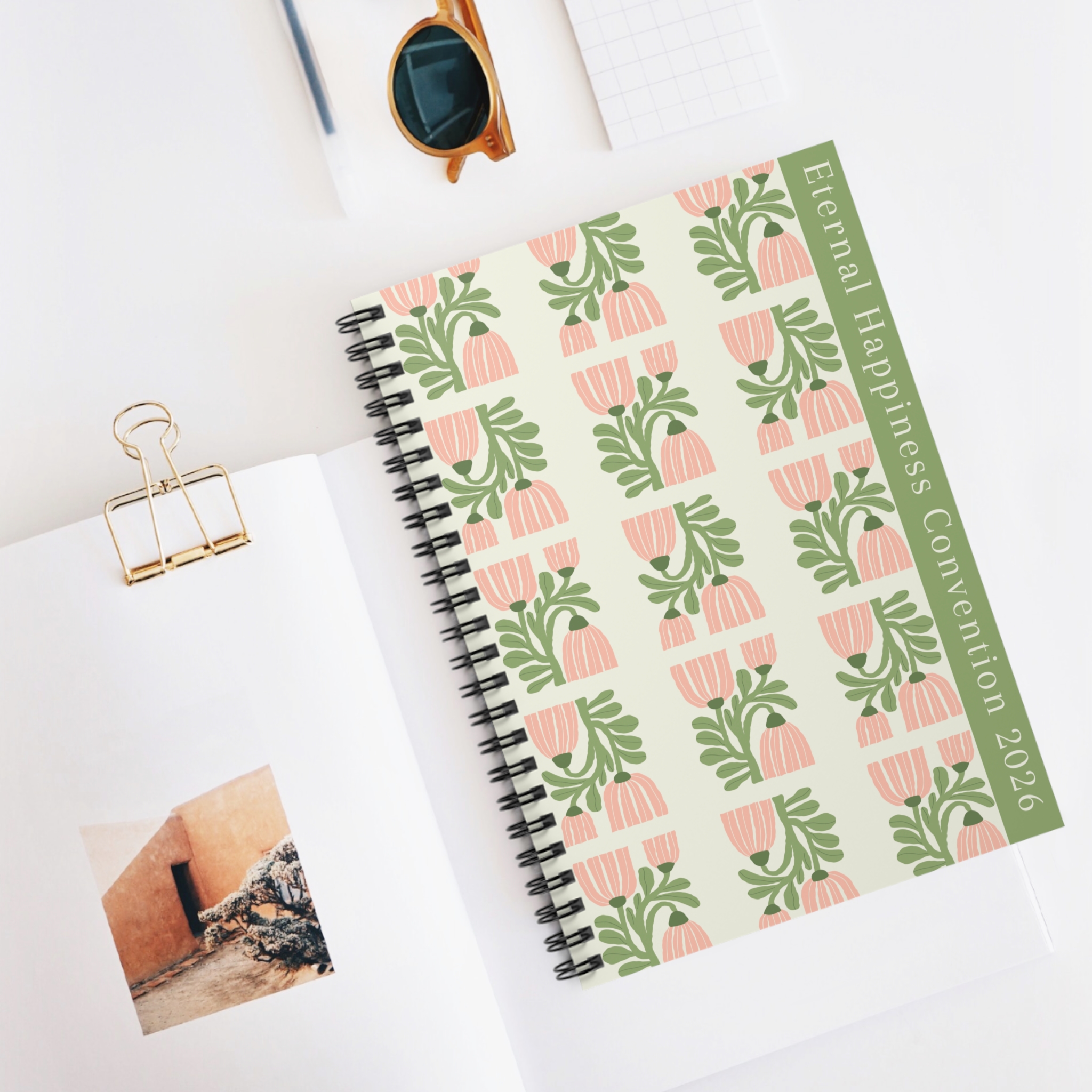 This A5 spiral bound notebook features a soft floral pattern in gentle pink and green tones, inspired by the Eternal Happiness 2026 Regional Convention.