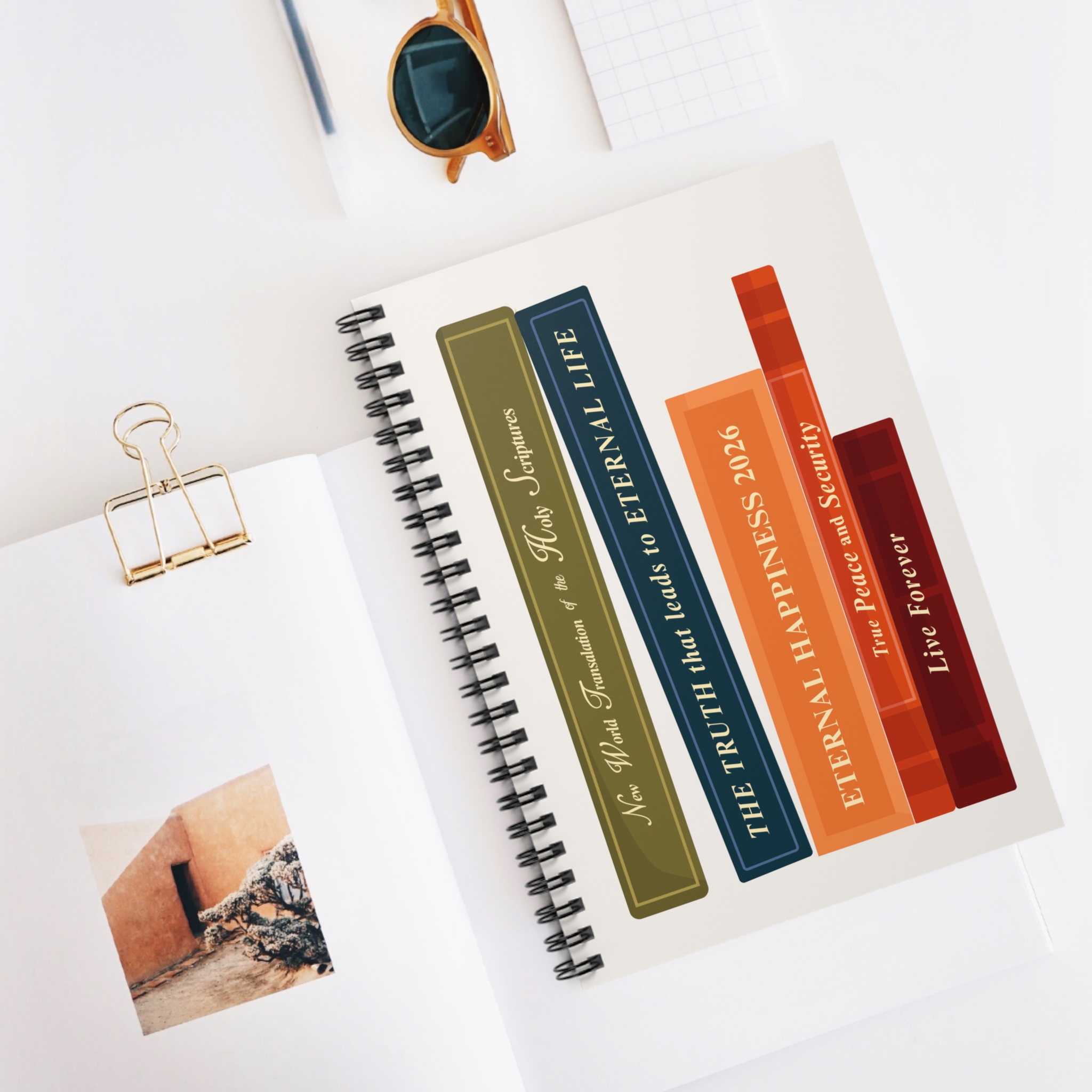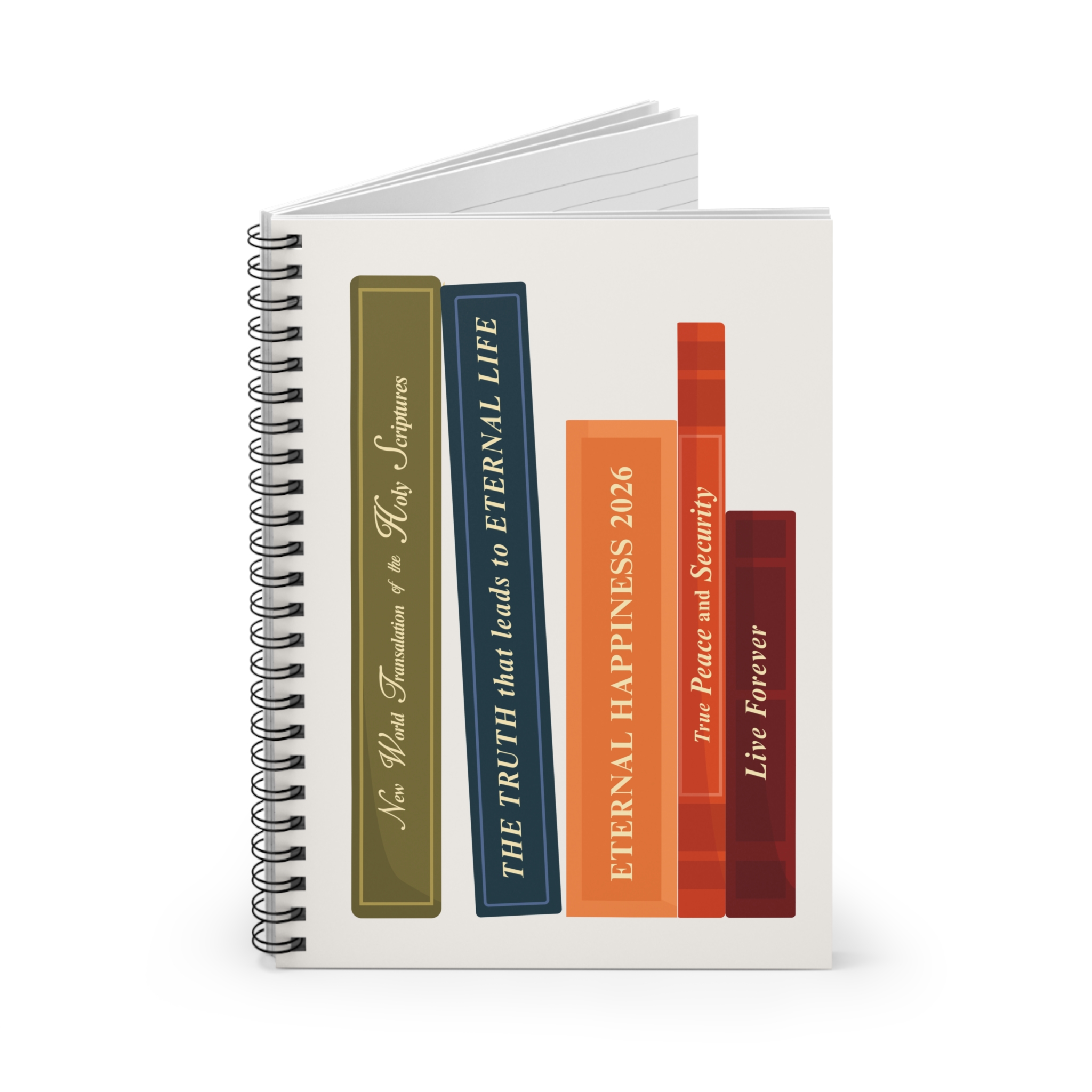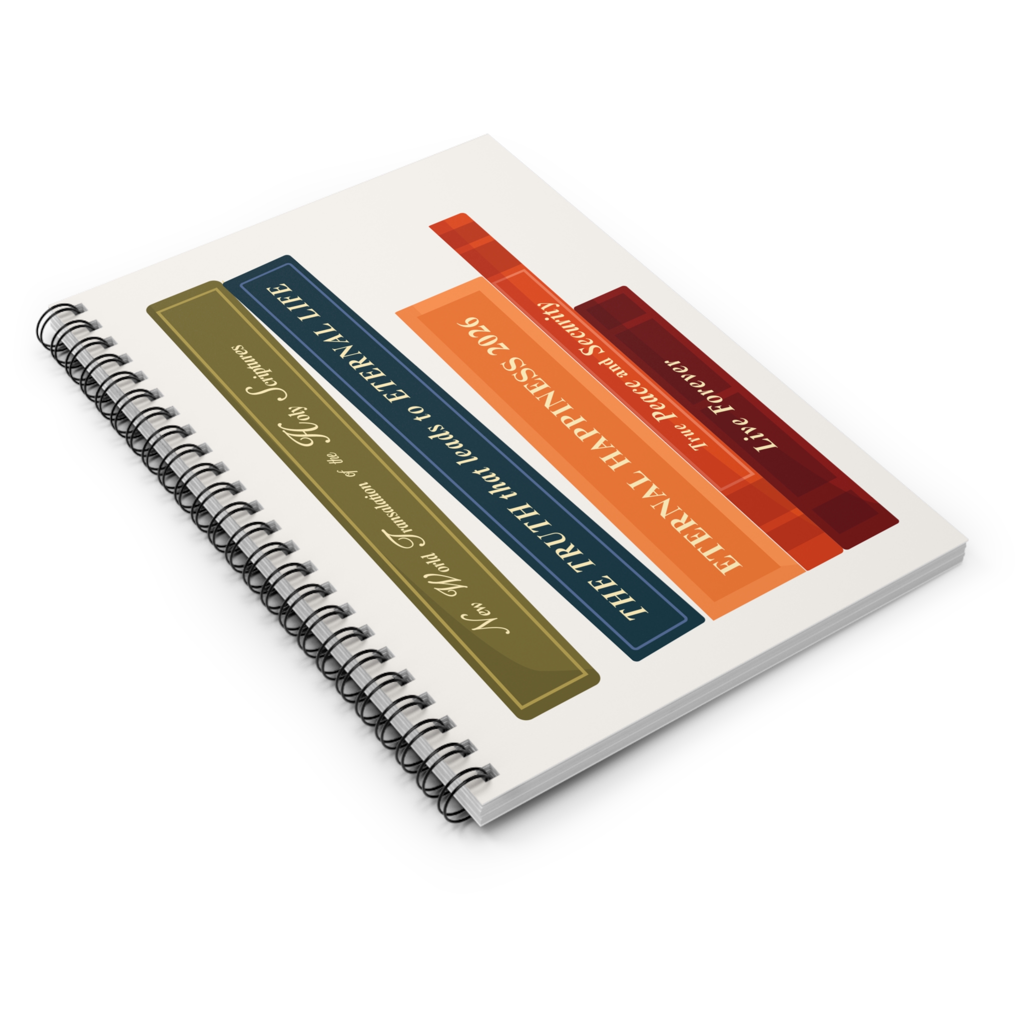 This spiral notebook features a unique book-inspired design, symbolising spiritual growth, study, and the journey toward everlasting life.