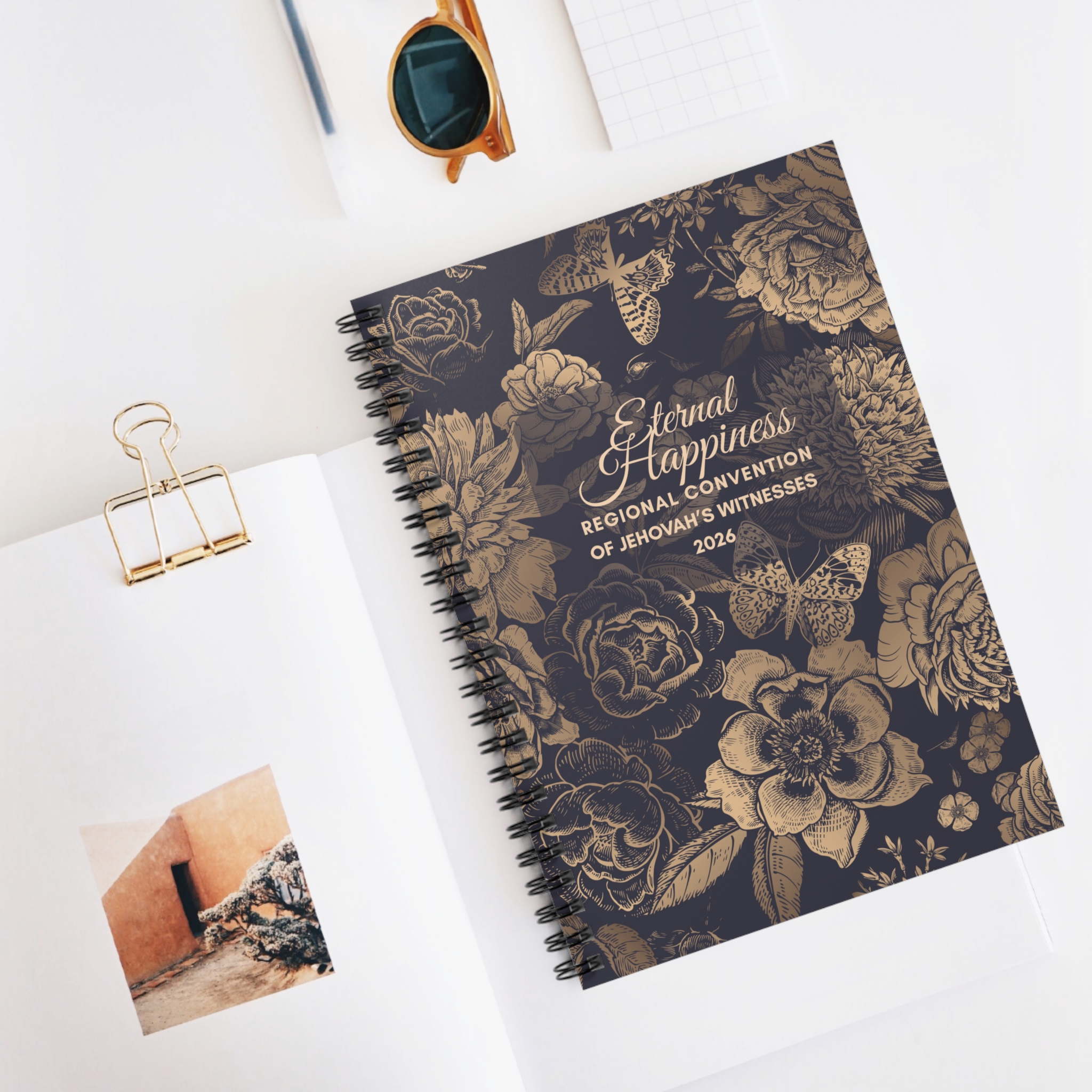 A richly detailed spiral-bound notebook featuring a vintage-inspired floral design with elegant botanical illustrations.
