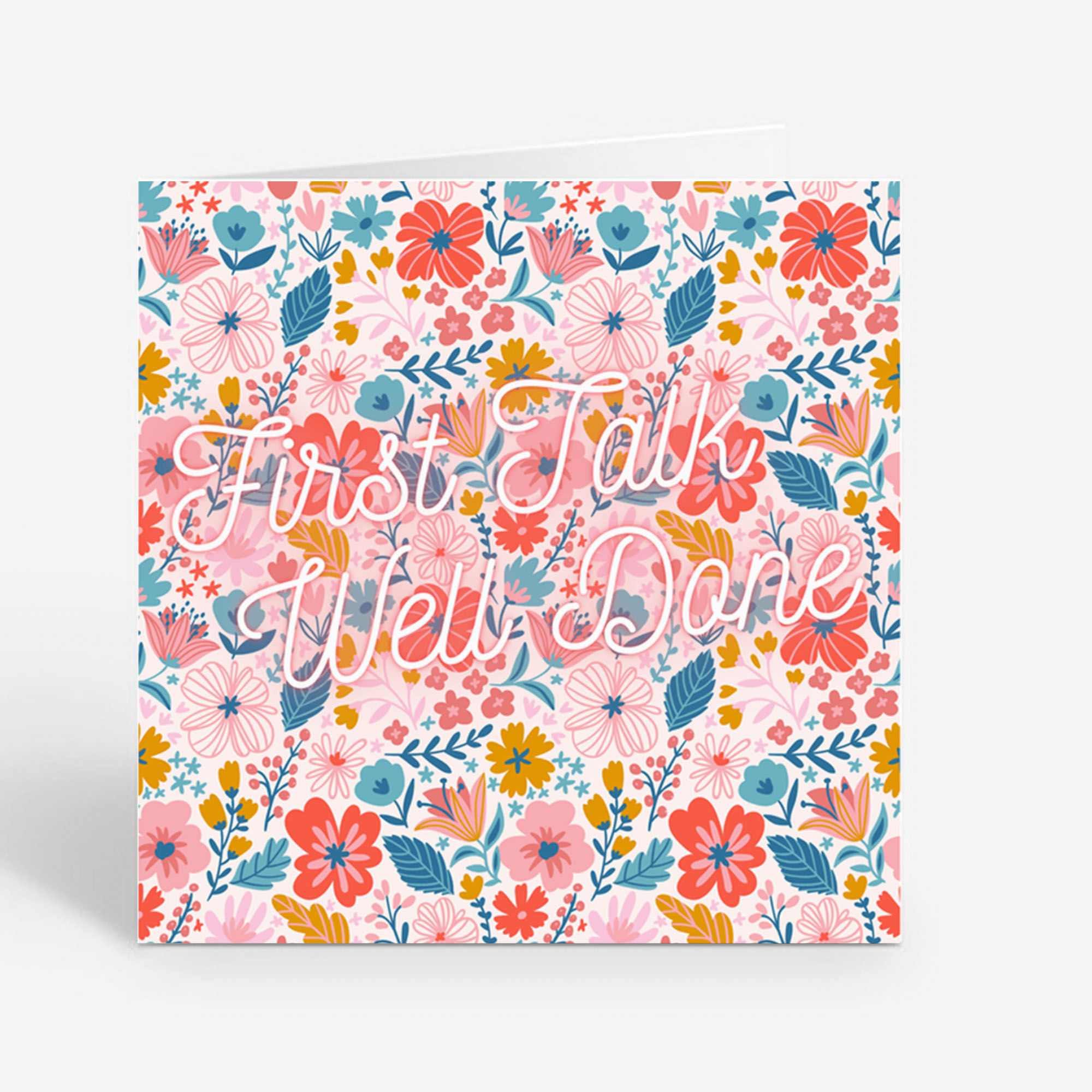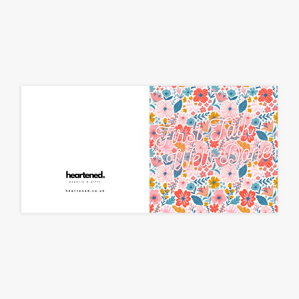 A beautiful square 6×6 congratulations greeting card featuring a colourful floral pattern and the message “First Talk Well Done.”