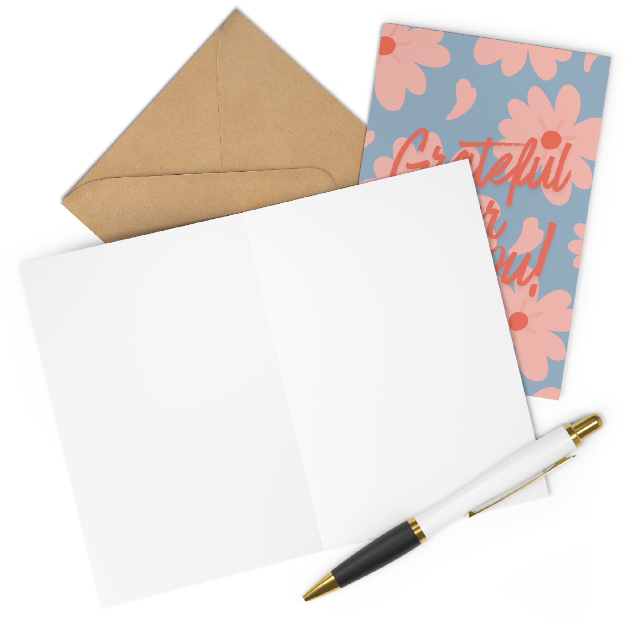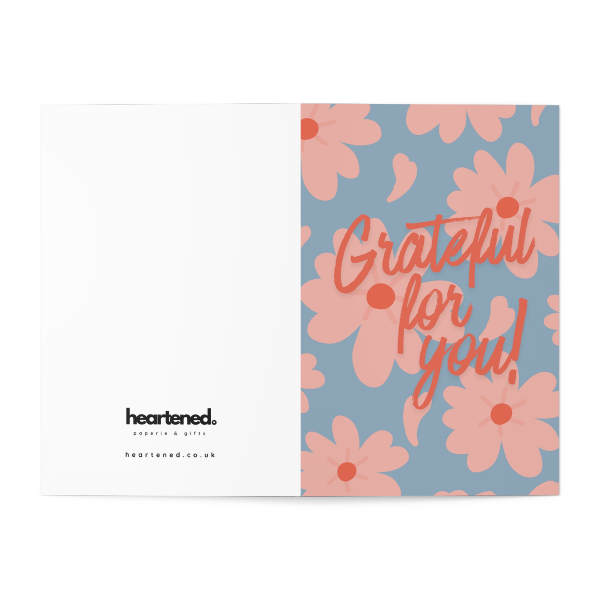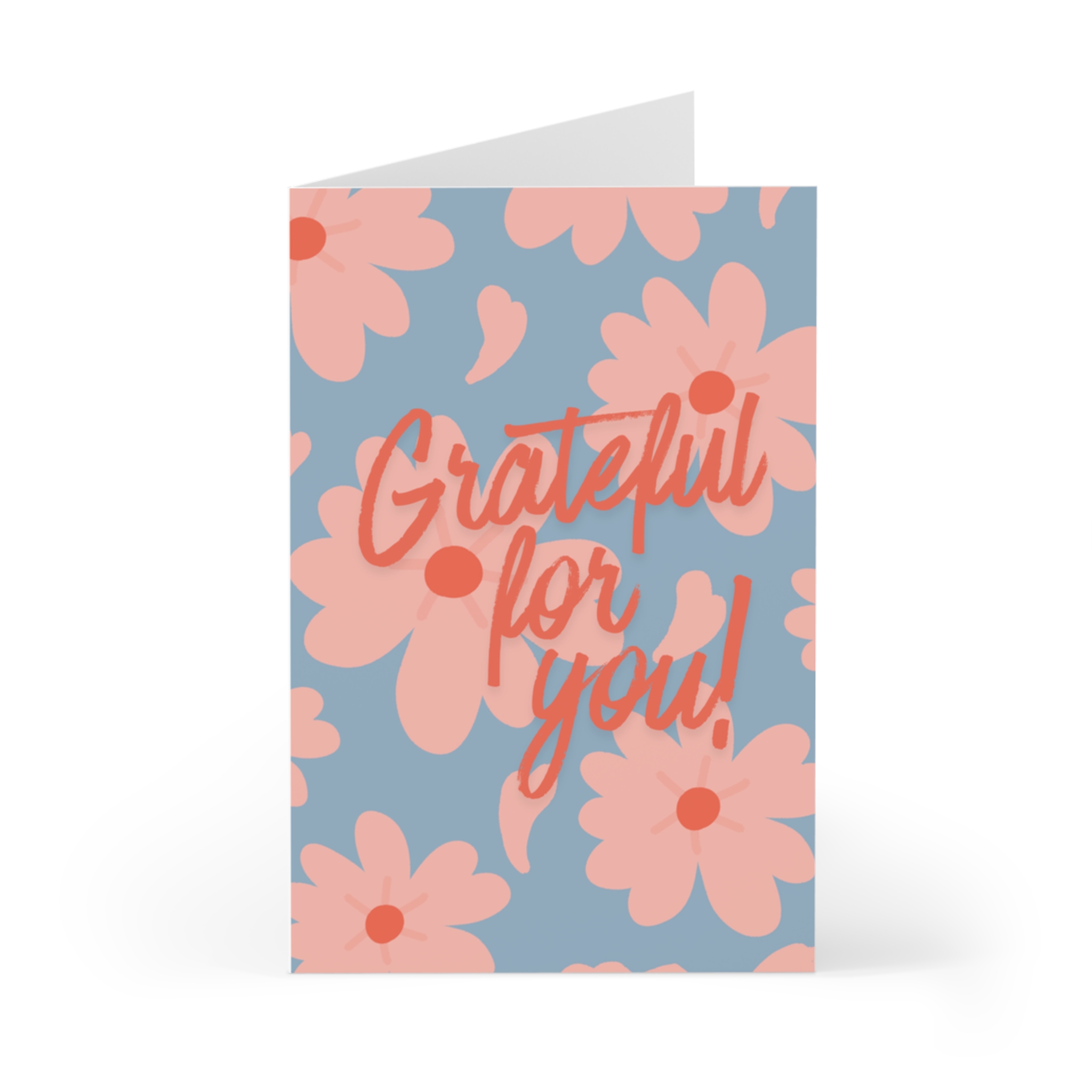 This cheerful greeting card features the message “Grateful for you!” set against a soft floral pattern in warm, uplifting tones.