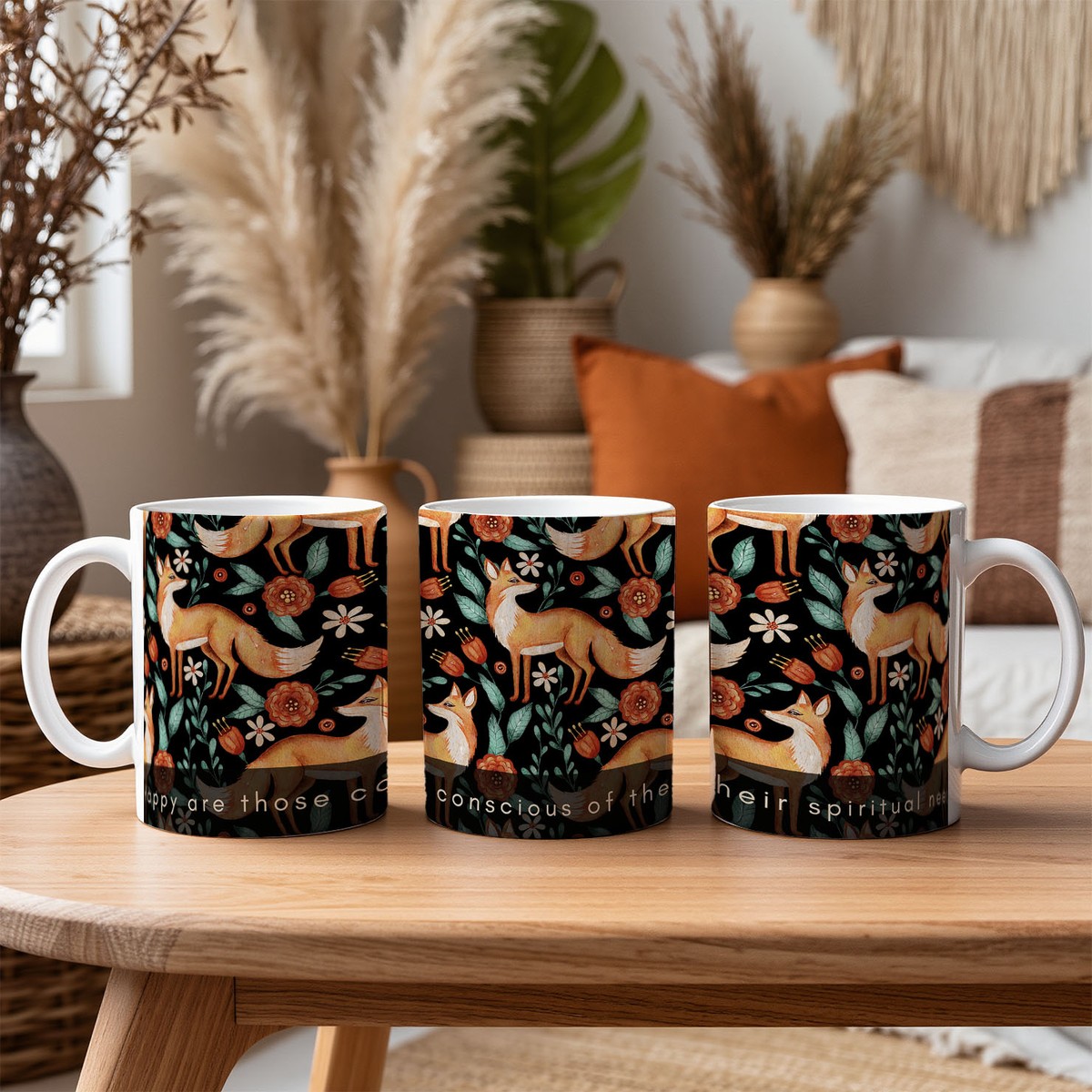 This beautifully designed mug features an elegant pattern of illustrated foxes surrounded by delicate florals and foliage, set against a rich dark background. The warm, nature-inspired artwork is paired with the meaningful words “Happy are those conscious of their spiritual need”, creating a thoughtful and uplifting design.