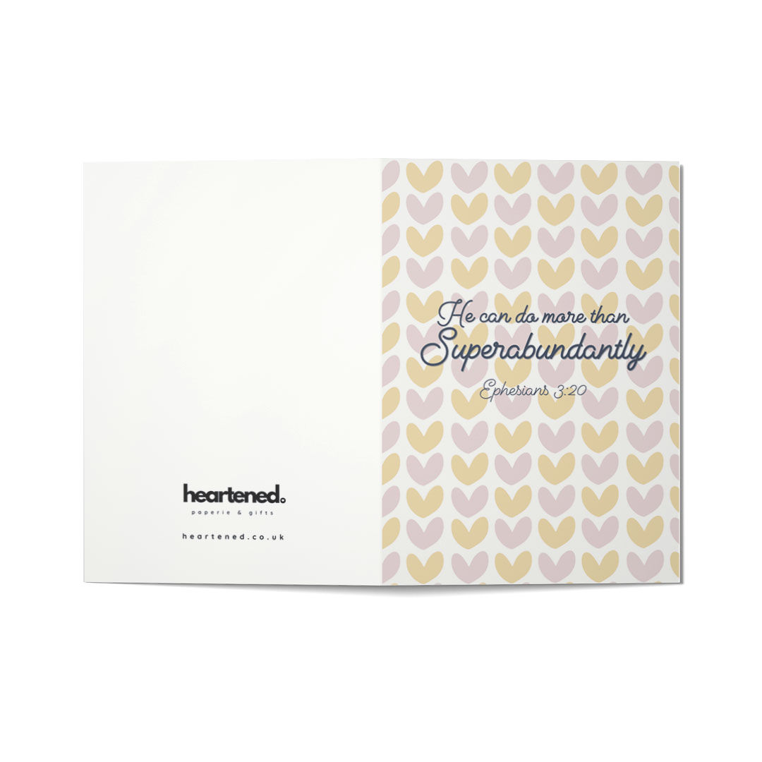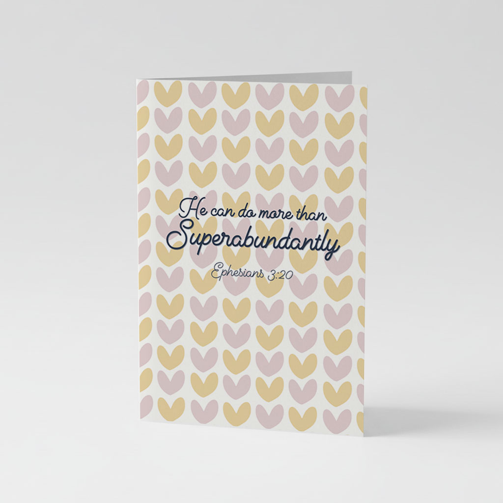 Share a message of faith and encouragement with this uplifting “He Can Do More Than Superabundantly” greeting card. The design features a soft pattern of pastel hearts in warm tones, creating a gentle and hopeful feel.