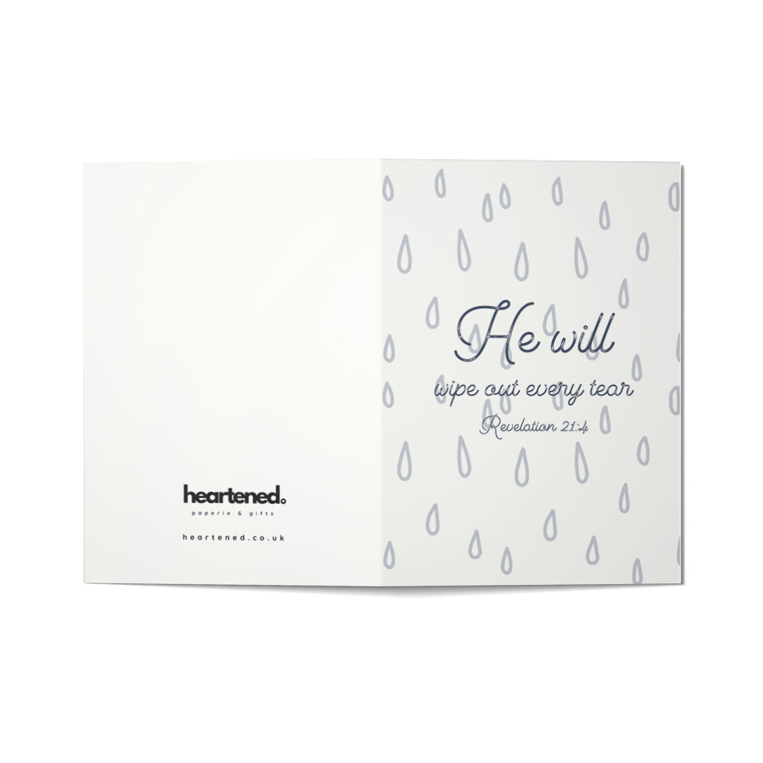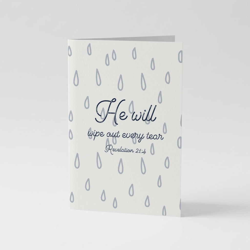 Offer comfort and hope with this meaningful “He Will Wipe Out Every Tear” scripture greeting card. The gentle design features a soft pattern of simple raindrops, symbolising tears that will one day be wiped away, creating a calm and thoughtful aesthetic.