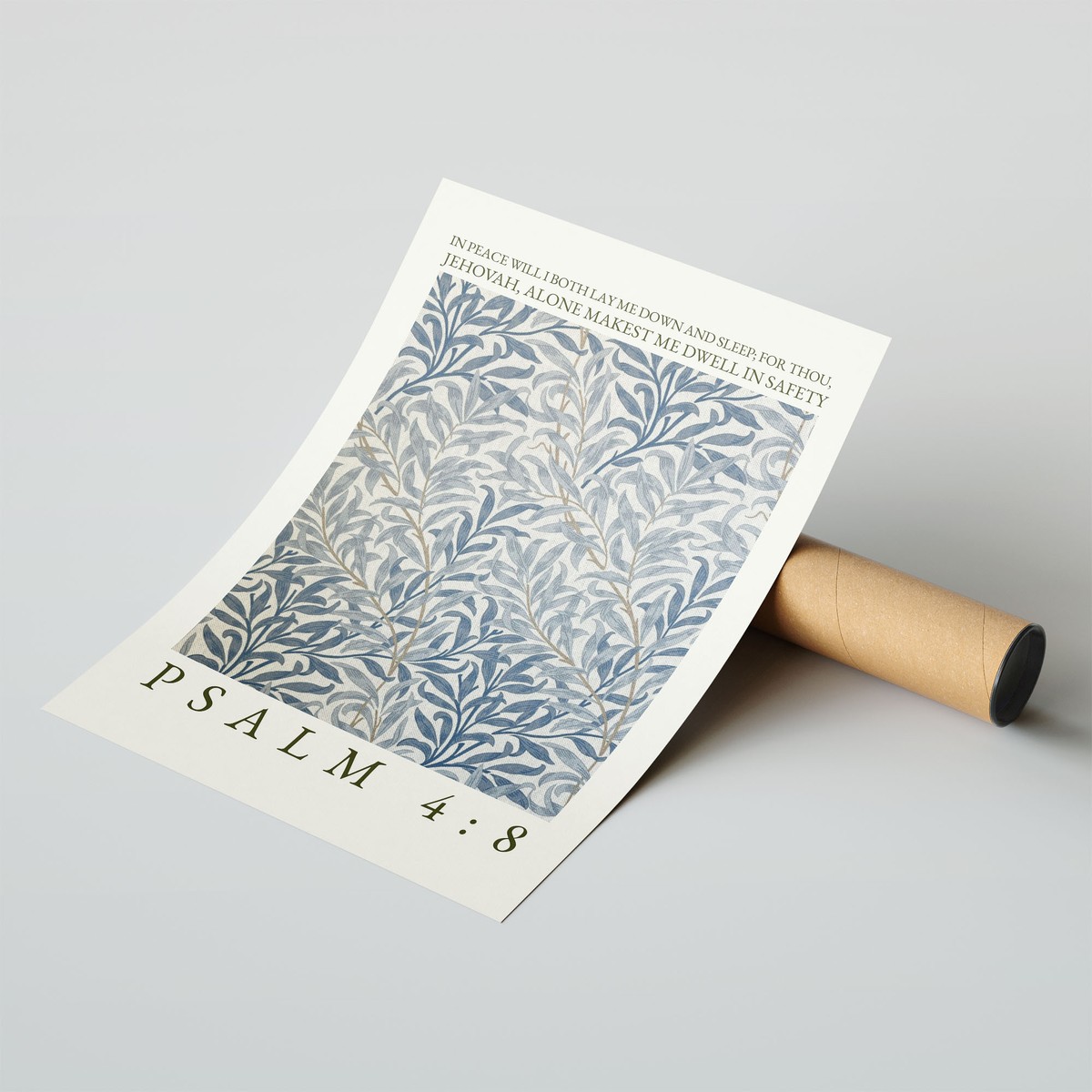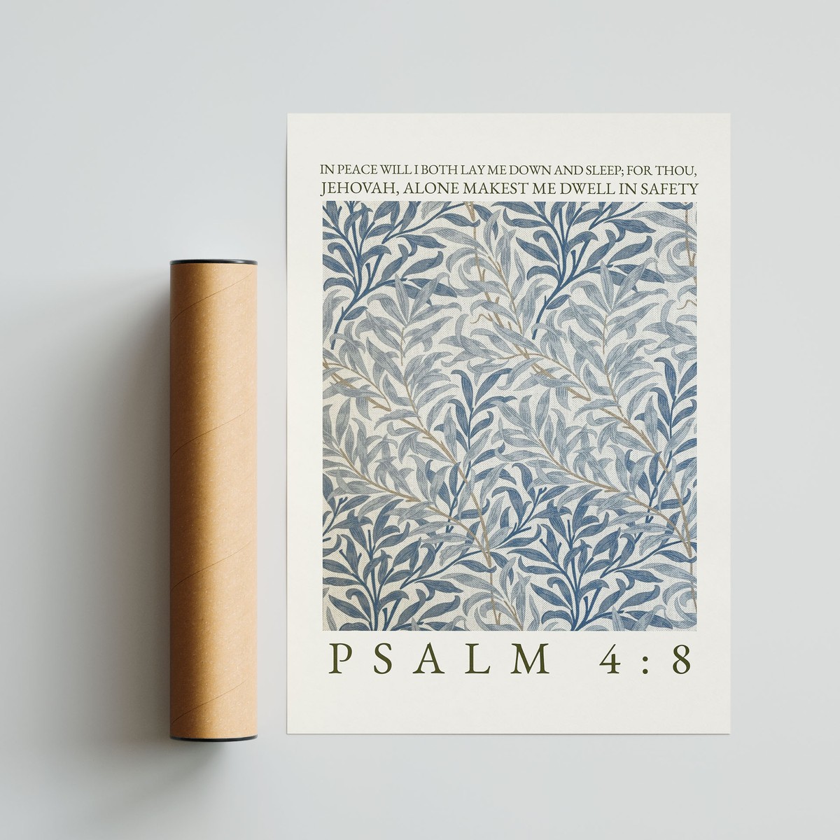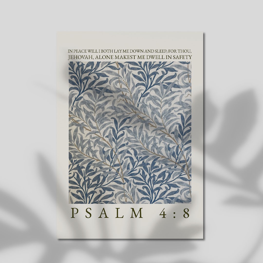 This elegant art print features a beautifully detailed botanical pattern in soft, calming tones of blue, cream, and subtle gold accents, inspired by classic floral designs. Paired with the peaceful words “In peace will I both lay me down and sleep; for thou, Jehovah, alone makest me dwell in safety” – Psalm 4:8, it creates a soothing and comforting piece.