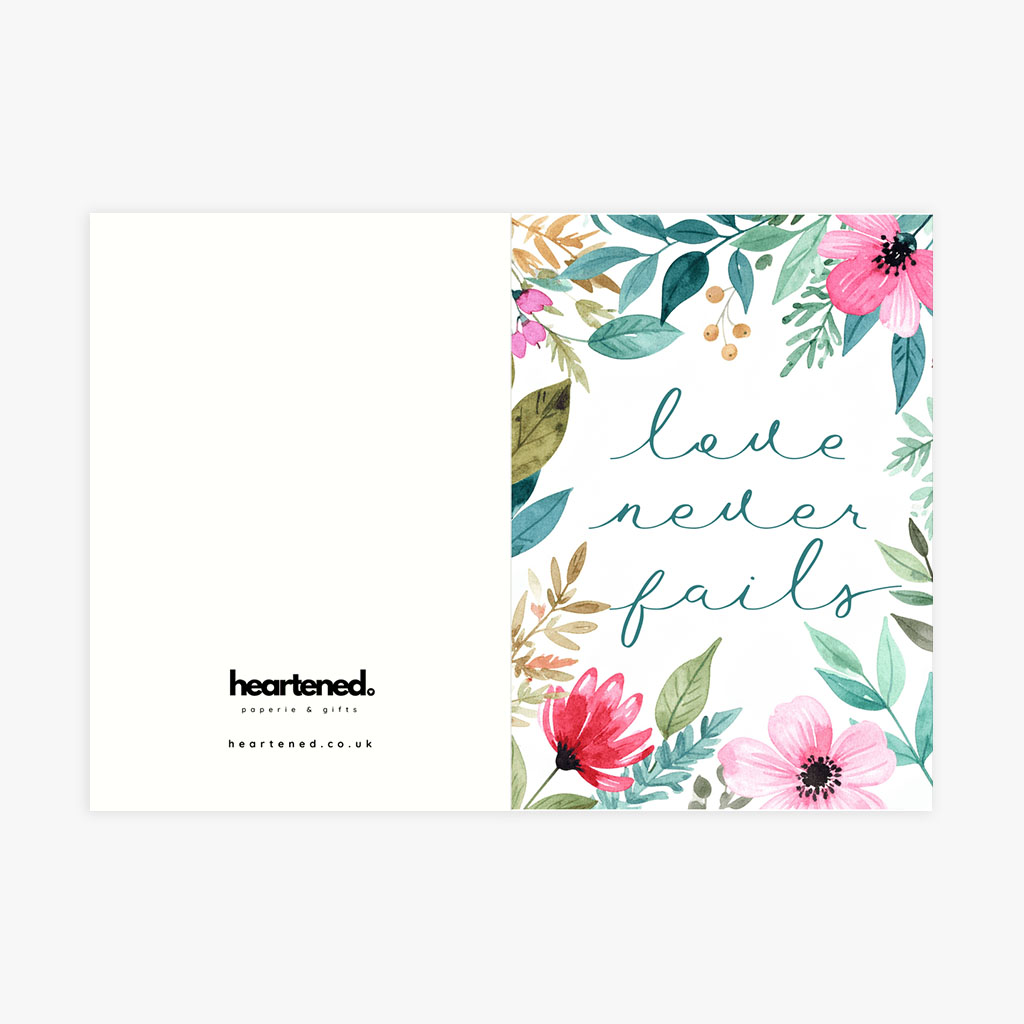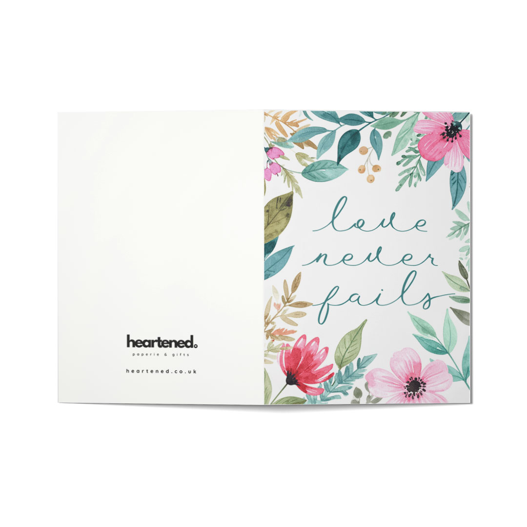 Inspired by 1 Corinthians 13:8, this elegant design is a gentle reminder of the enduring power of love. The soft botanical artwork gives the card a calm and uplifting feel, making it suitable for many occasions.