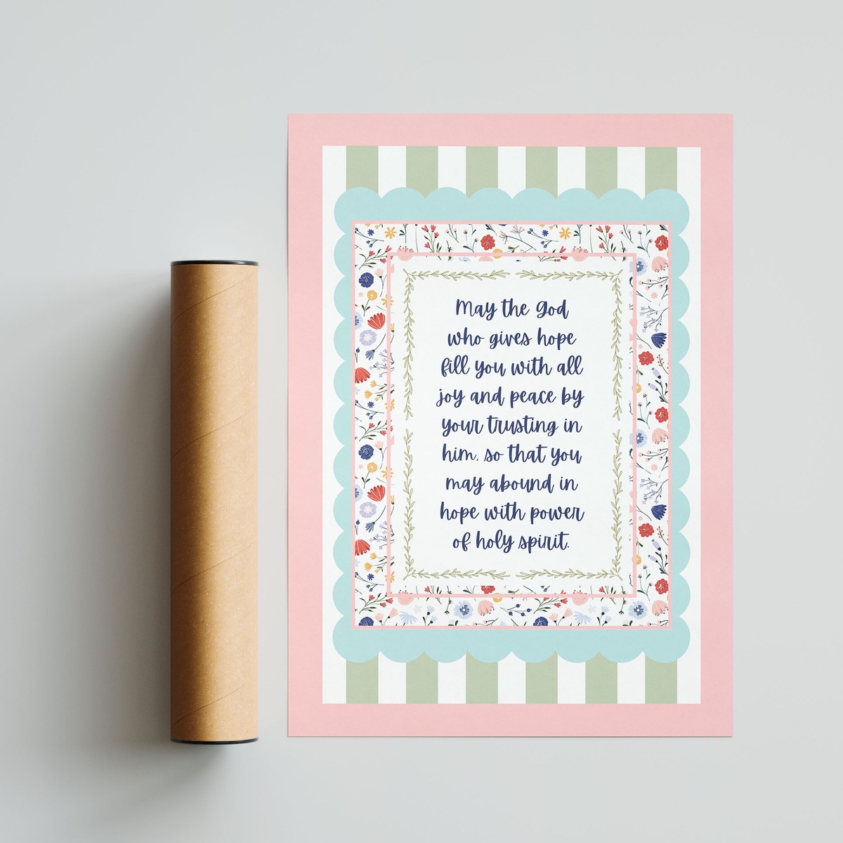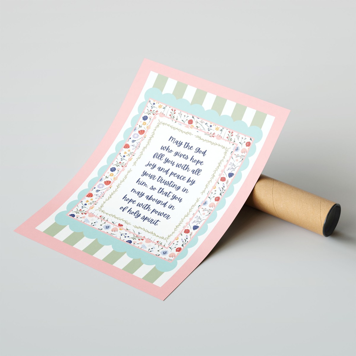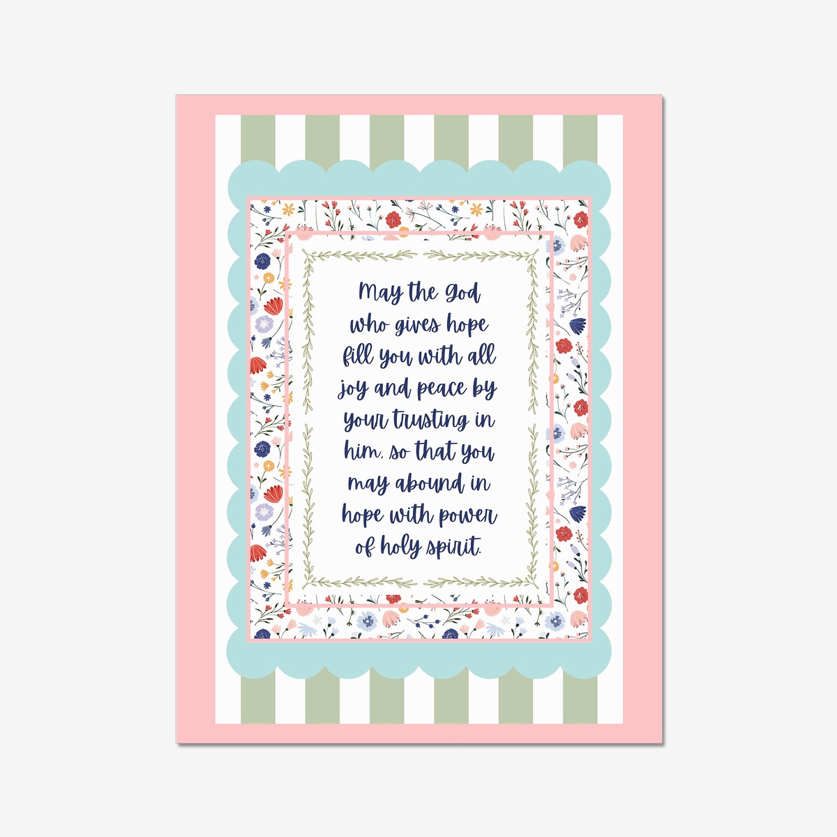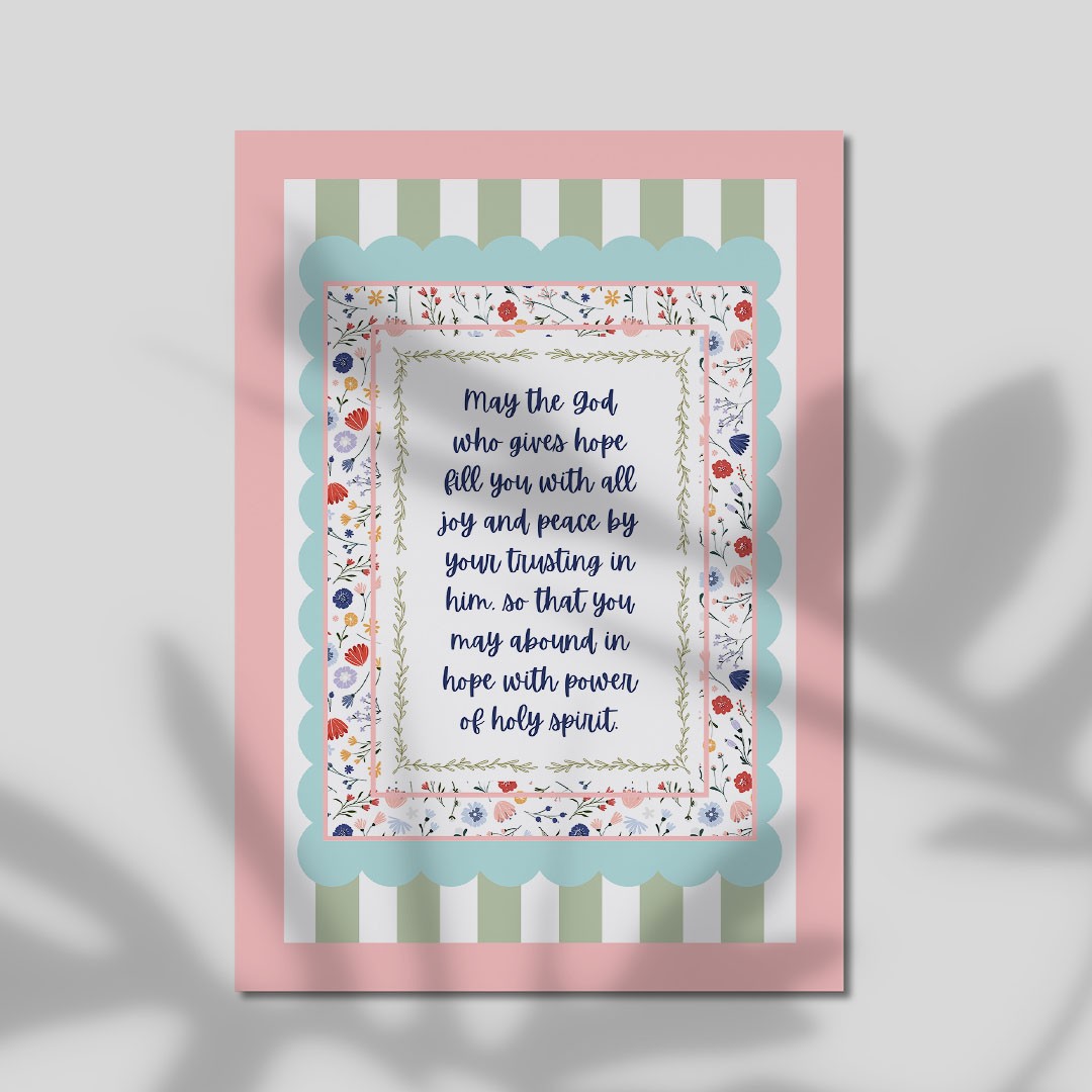 A beautifully framed scripture print featuring the encouraging words “May the God who gives hope fill you with all joy and peace…” – Romans 15:13. Designed with soft florals, delicate patterns, and gentle pastel tones, this piece offers warmth and encouragement in a charming, decorative style.