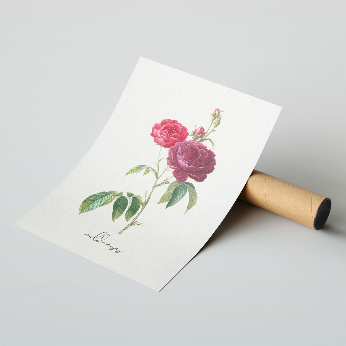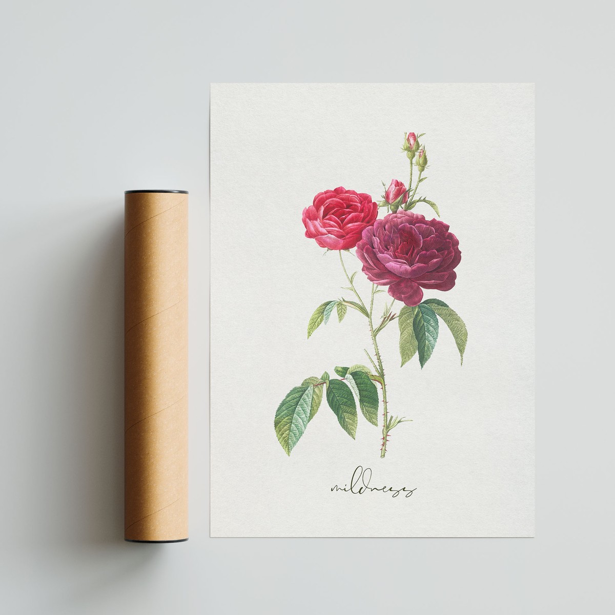 A refined botanical illustration paired with the word “mildness,” offering a quiet and gentle reminder of calm strength.
