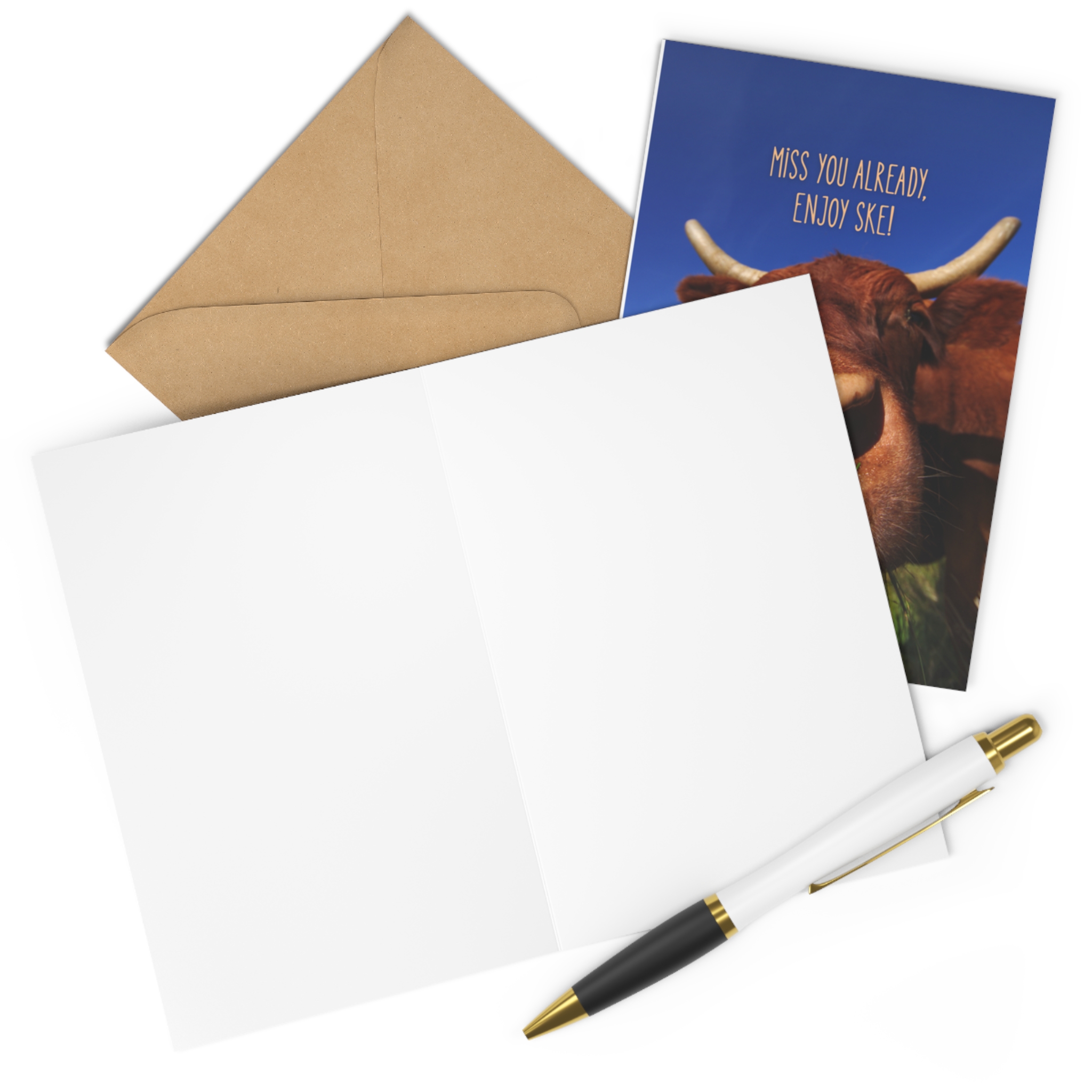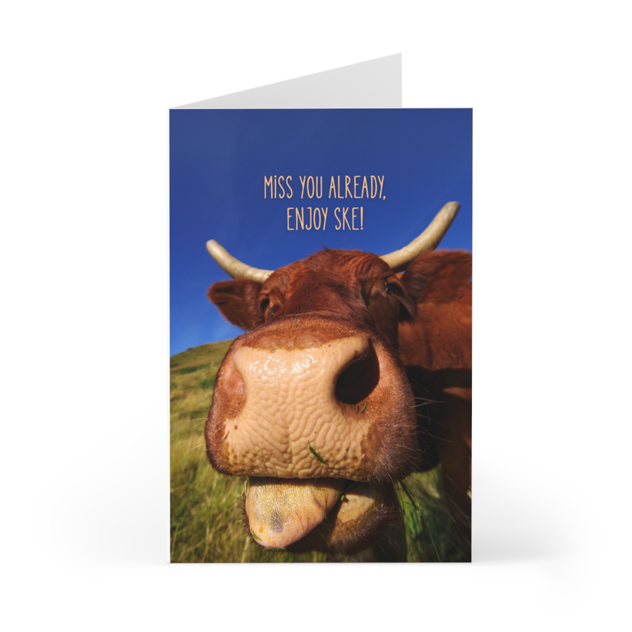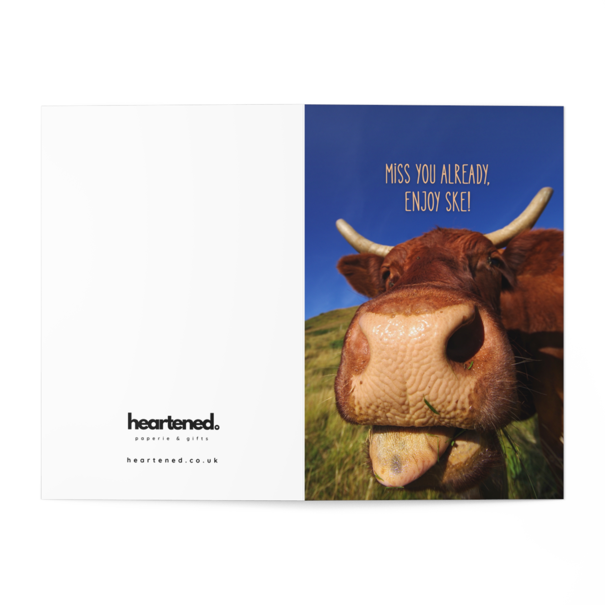 A fun and light-hearted greeting card featuring a close-up cow image and the message: “Miss you already, enjoy SKE!”