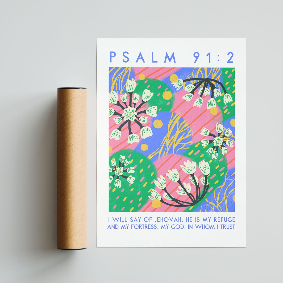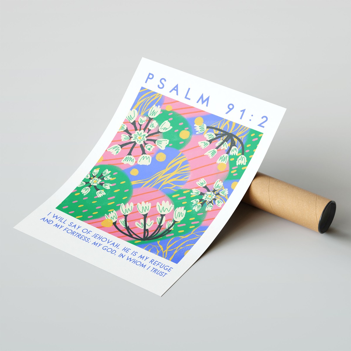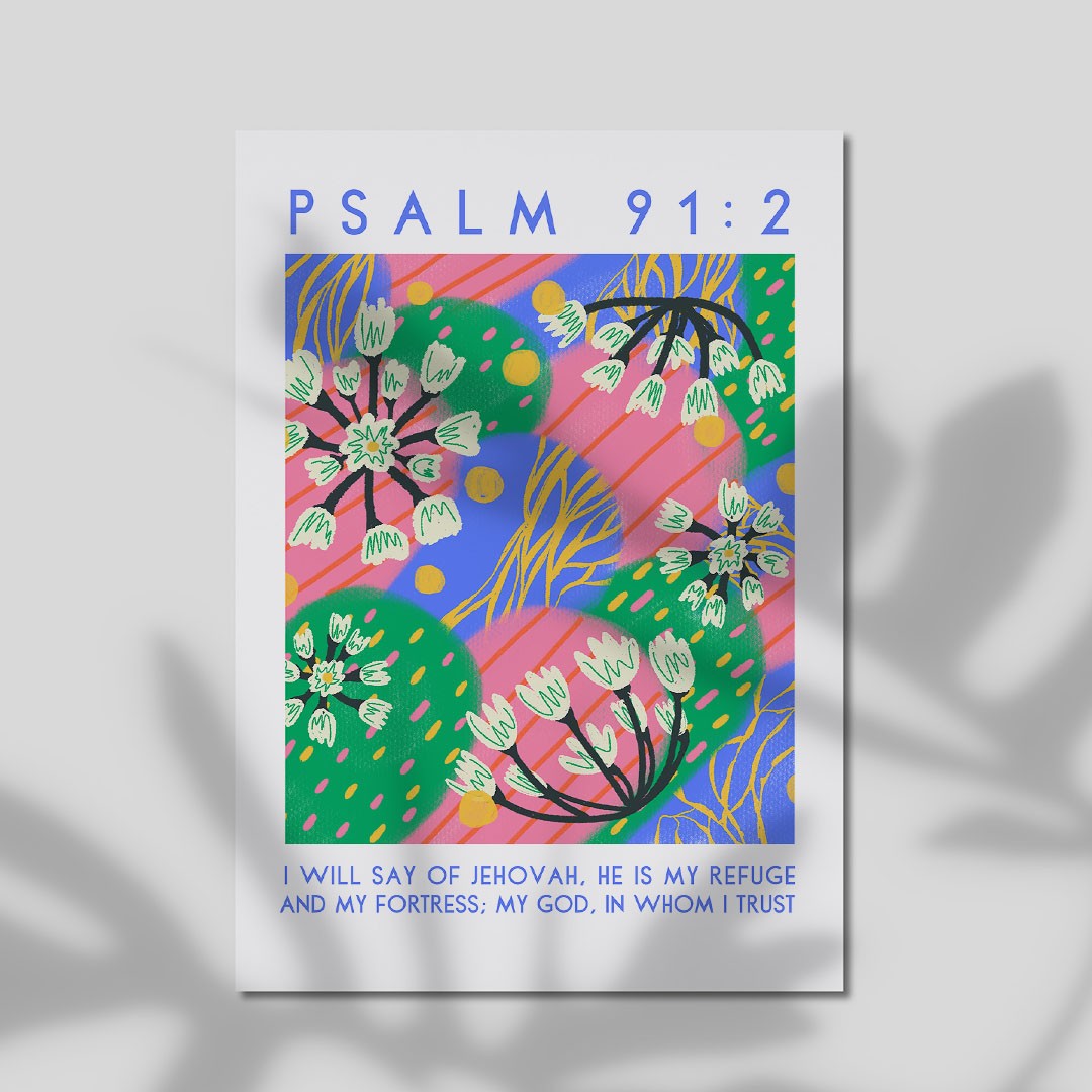 This vibrant art print features a bold and playful botanical design with layered shapes and bright tones of pink, green, blue, and yellow. Paired with the comforting words “I will say of Jehovah, He is my refuge and my fortress; my God, in whom I trust” – Psalm 91:2, it creates a meaningful and reassuring piece.