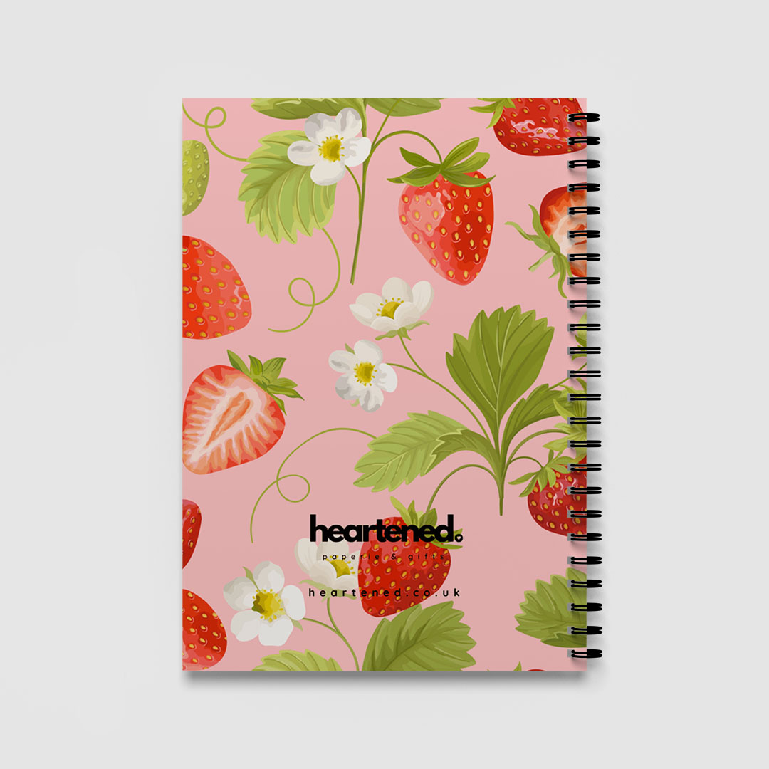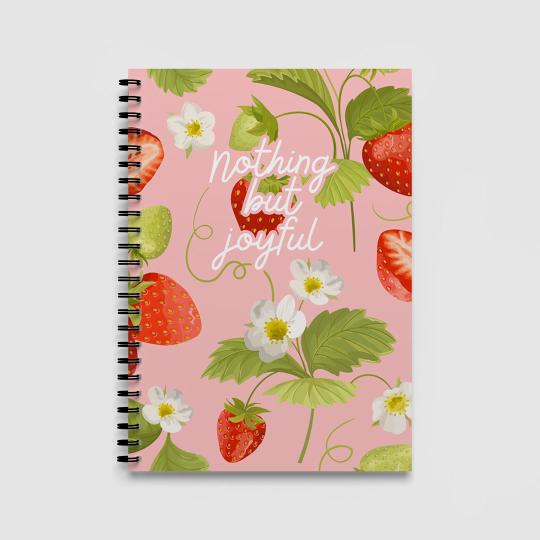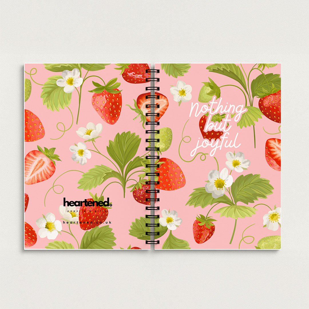 A cheerful A5 spiral notebook featuring a bright strawberry and floral design with the uplifting phrase “Nothing But Joyful.”
