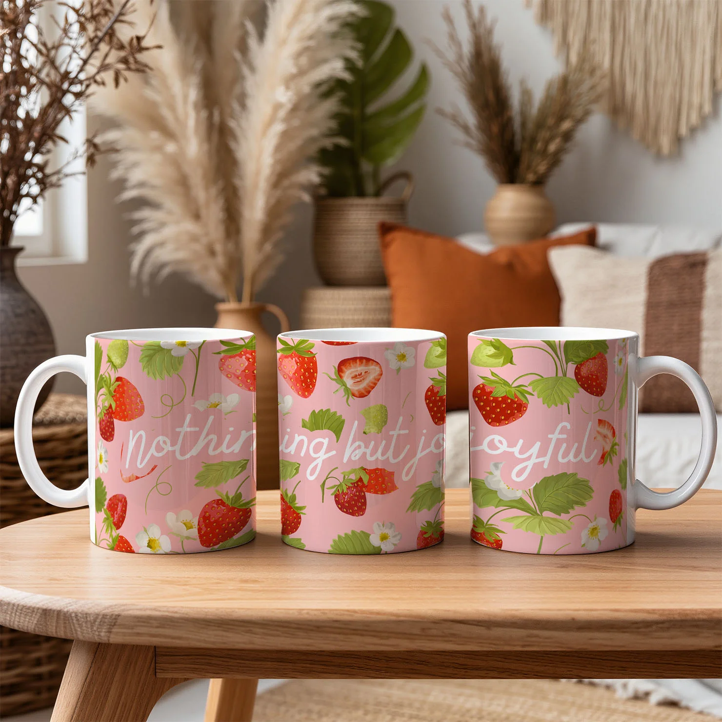 Add a touch of joy to your day with this bright and cheerful “Nothing But Joyful” mug, featuring a playful strawberry pattern and soft pastel colours.