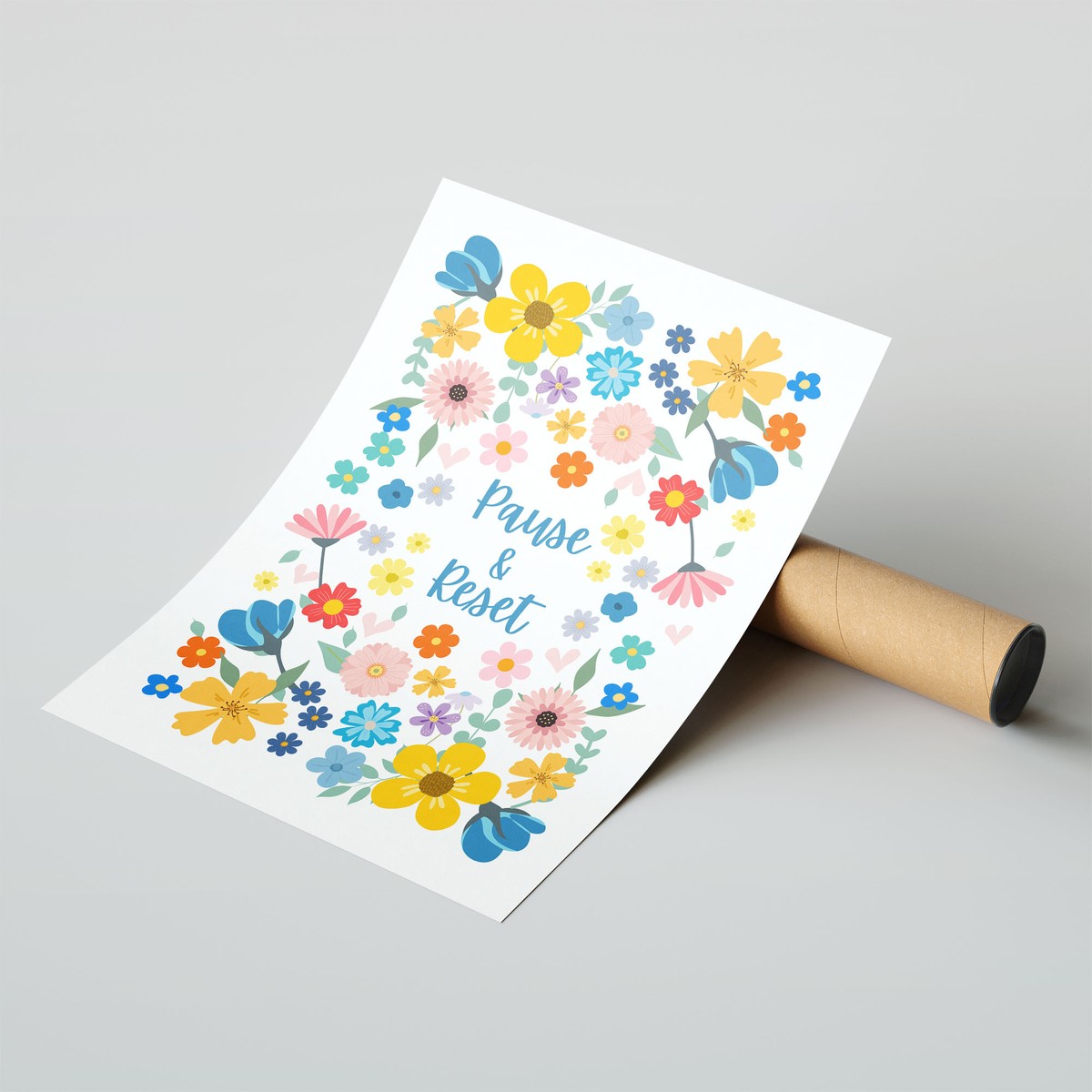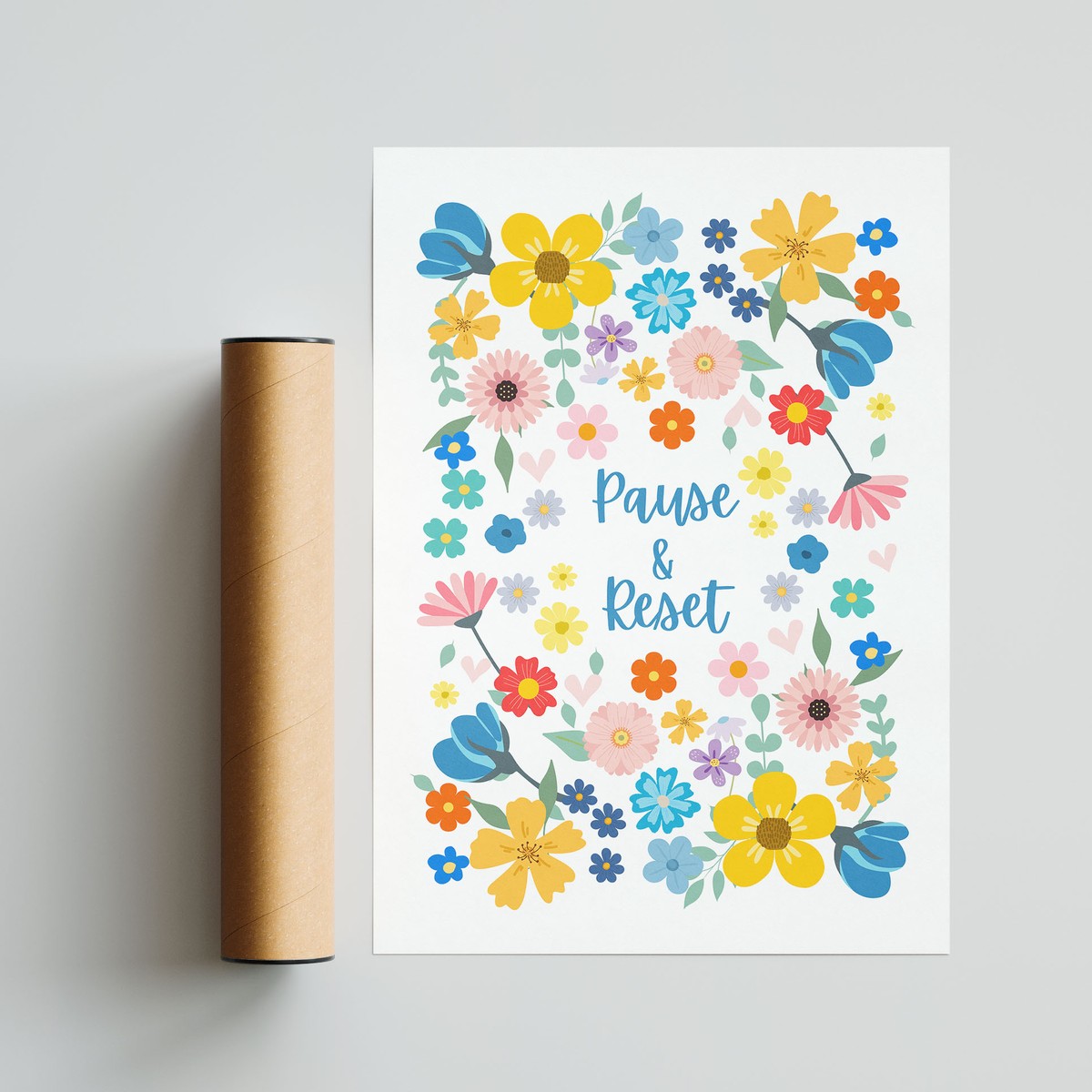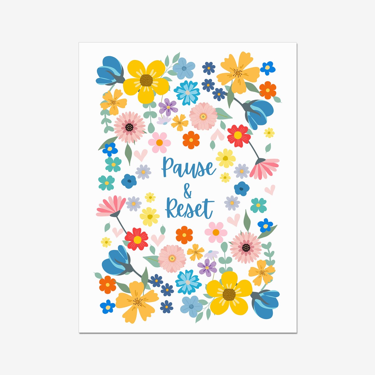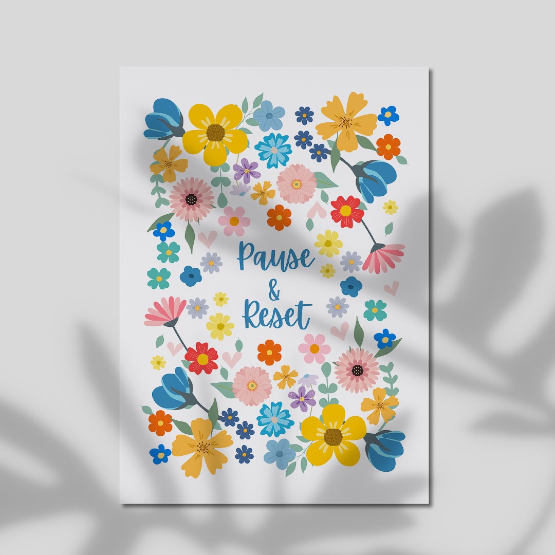 A bright and cheerful floral print featuring the gentle reminder “Pause & Reset.” Designed with colourful blooms and a light, uplifting palette, this piece encourages moments of rest and reflection in everyday life.