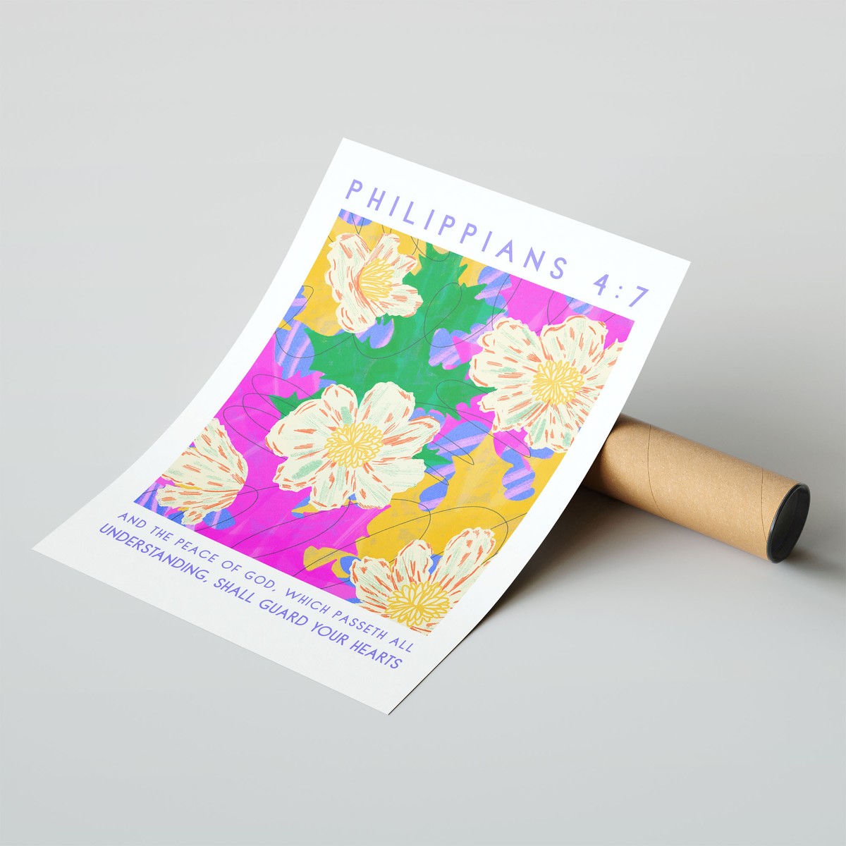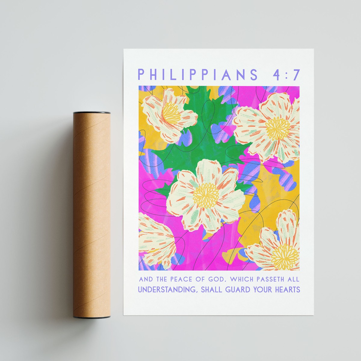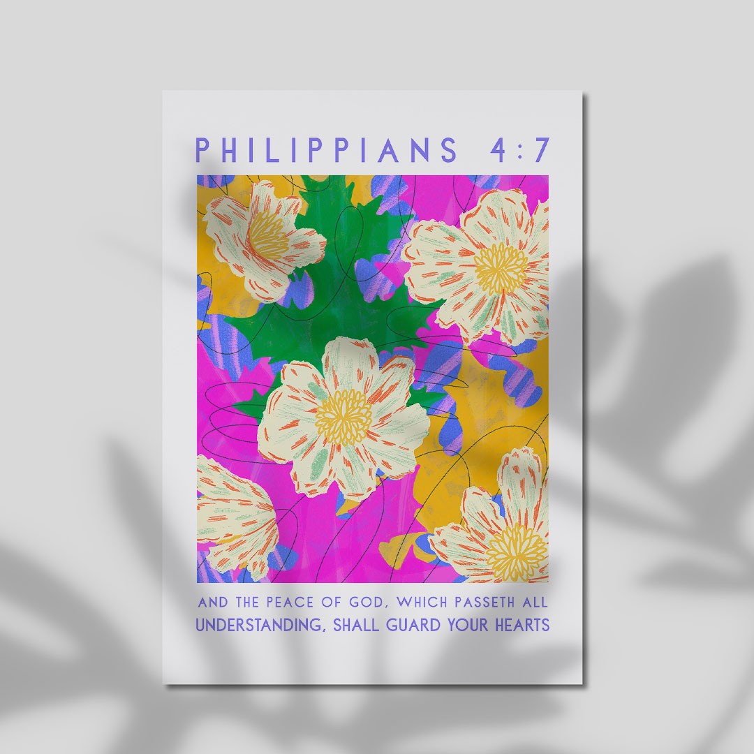 This vibrant art print features a bold floral composition with bright tones of pink, yellow, green, and purple, creating a lively and contemporary design. Paired with the reassuring words “And the peace of God, which passeth all understanding, shall guard your hearts” – Philippians 4:7, it offers a message of comfort and peace.