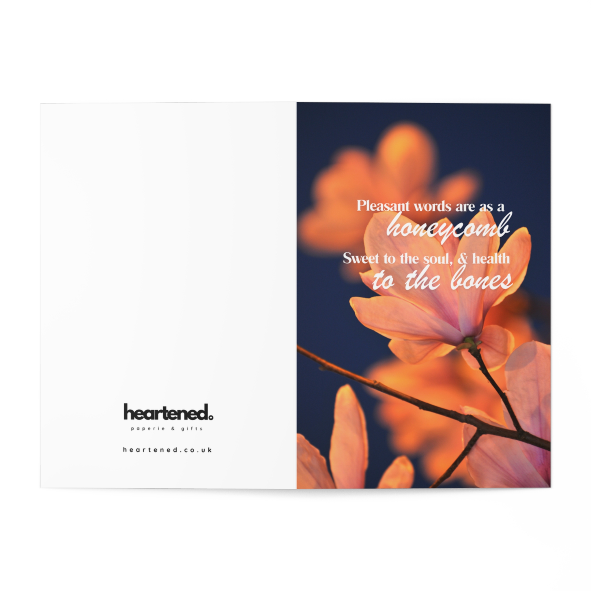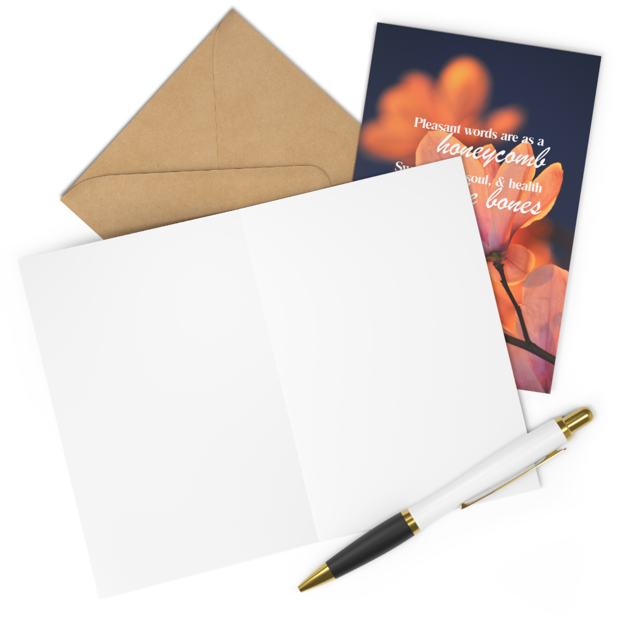 This elegant greeting card features the beautiful words from Proverbs 16:24: “Pleasant words are as a honeycomb, sweet to the soul and health to the bones.”