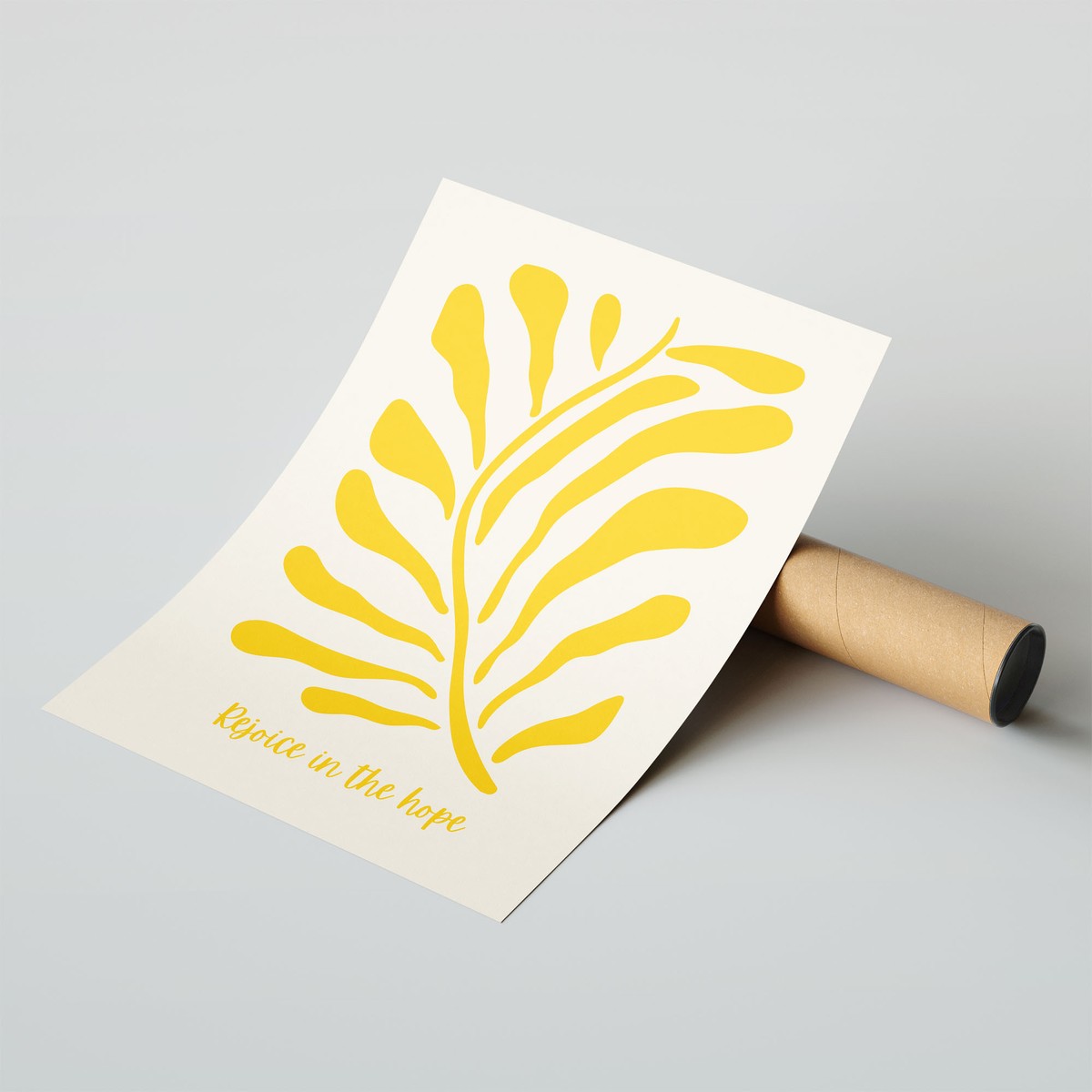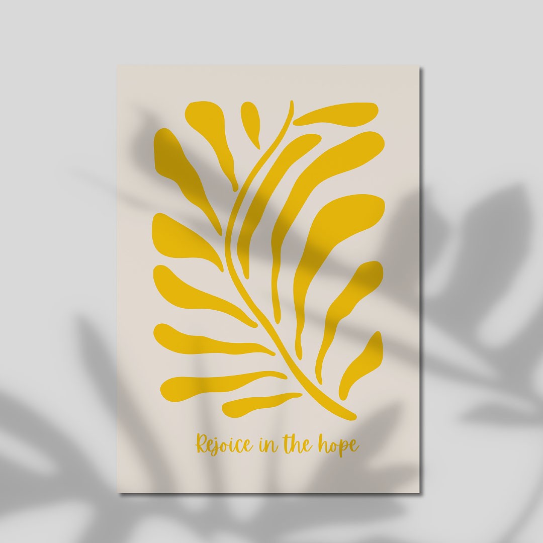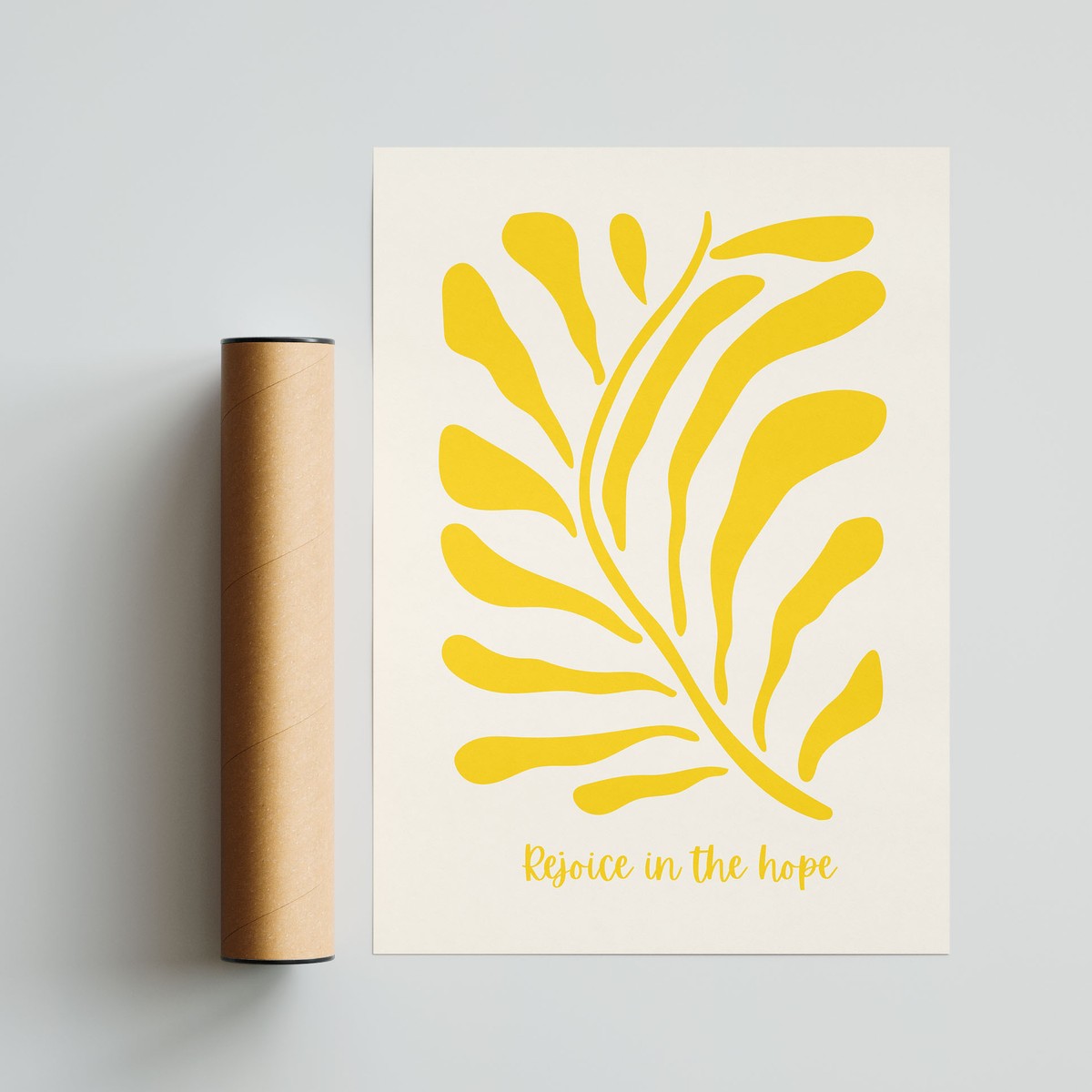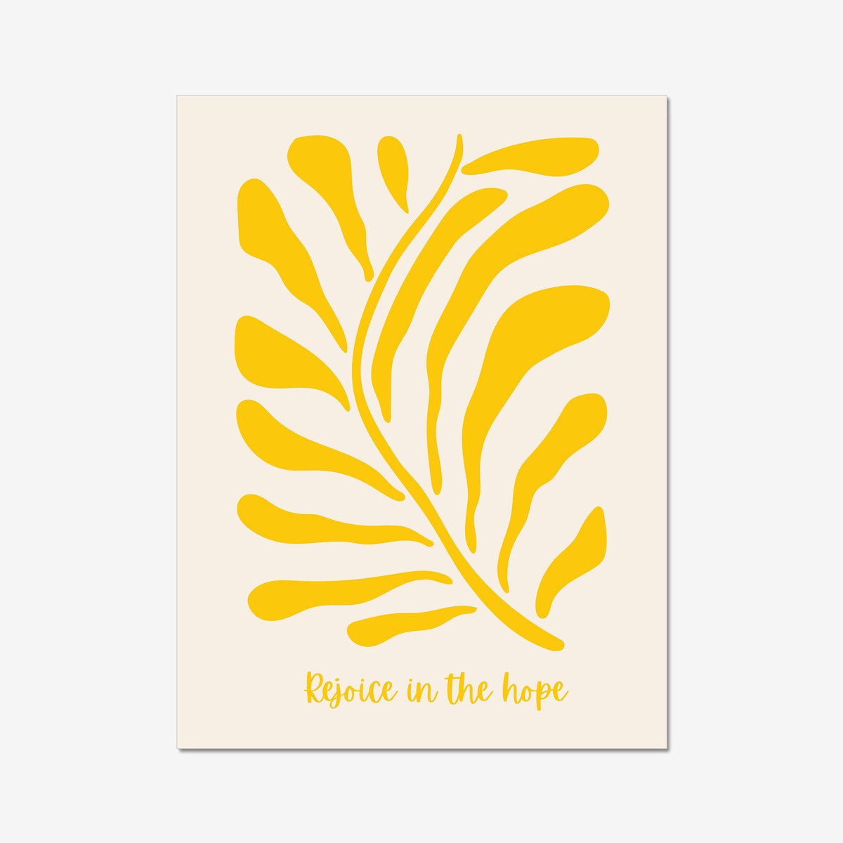 A bright and uplifting abstract botanical print featuring soft flowing shapes and the encouraging words “rejoice in the hope.” Inspired by Romans 12:12, this design brings warmth, positivity, and quiet joy into your home.