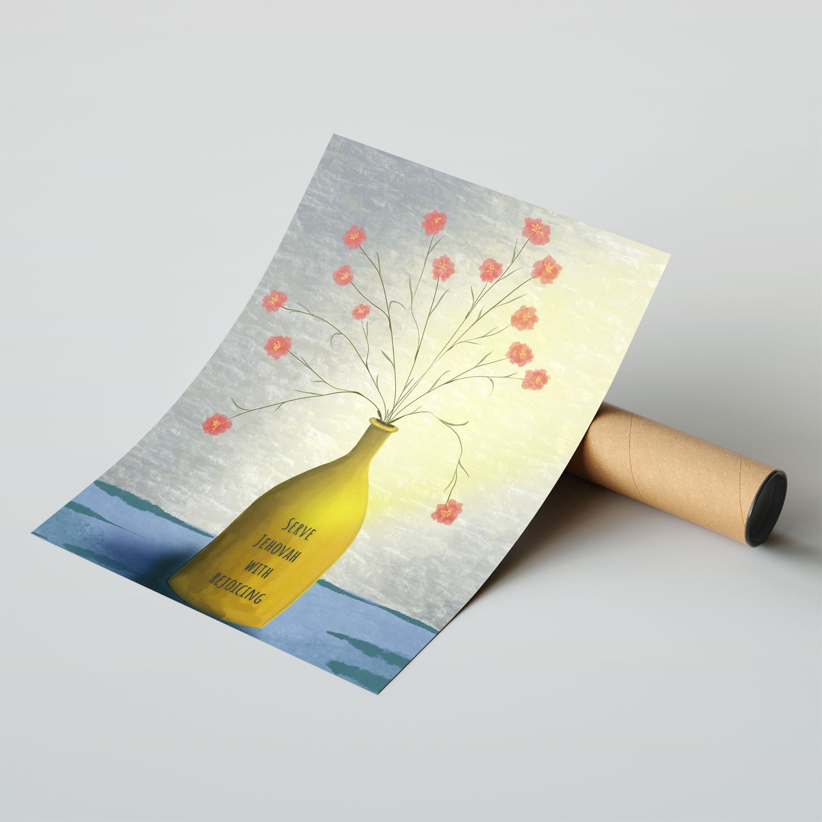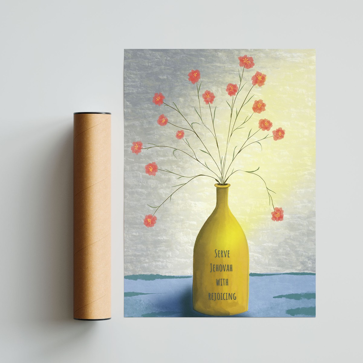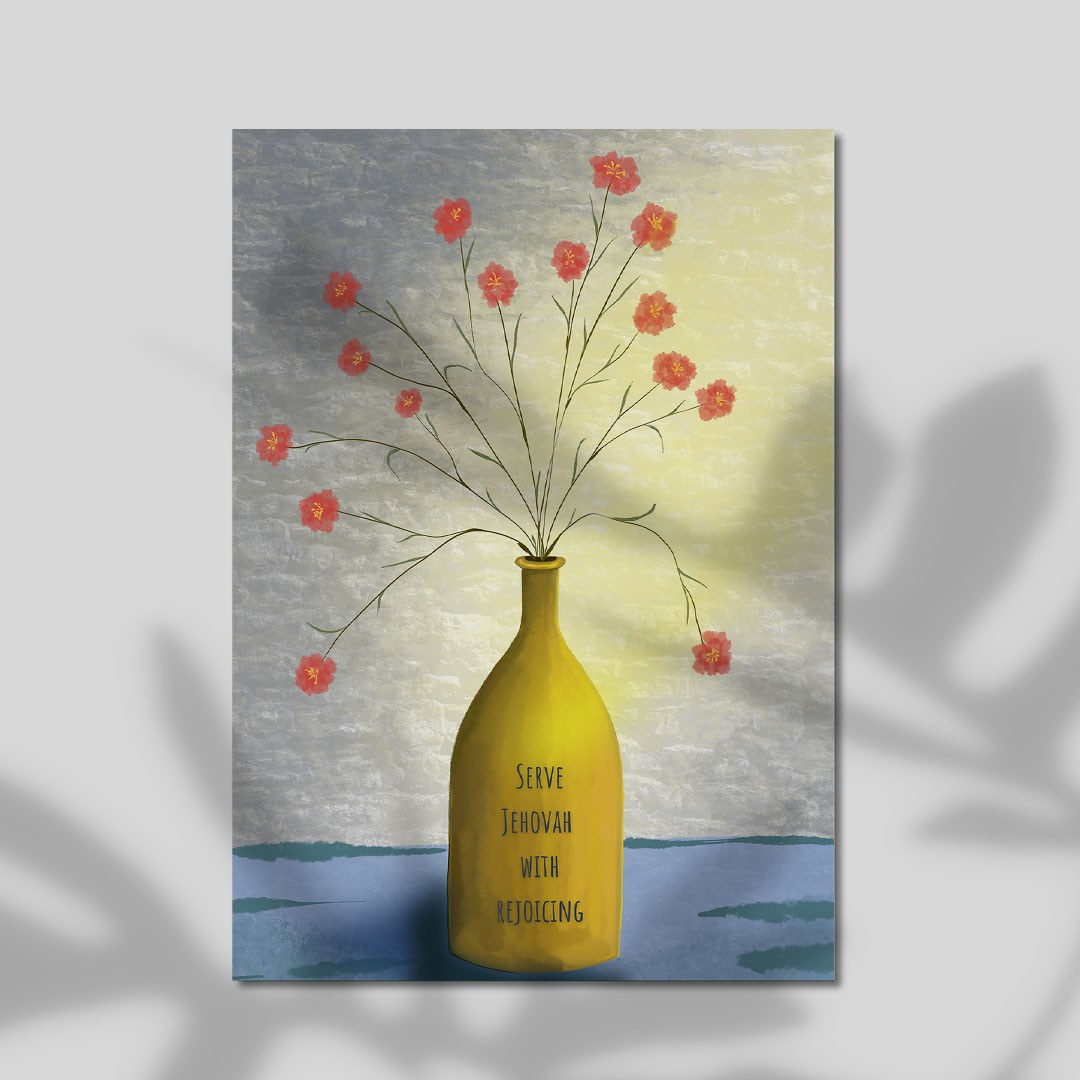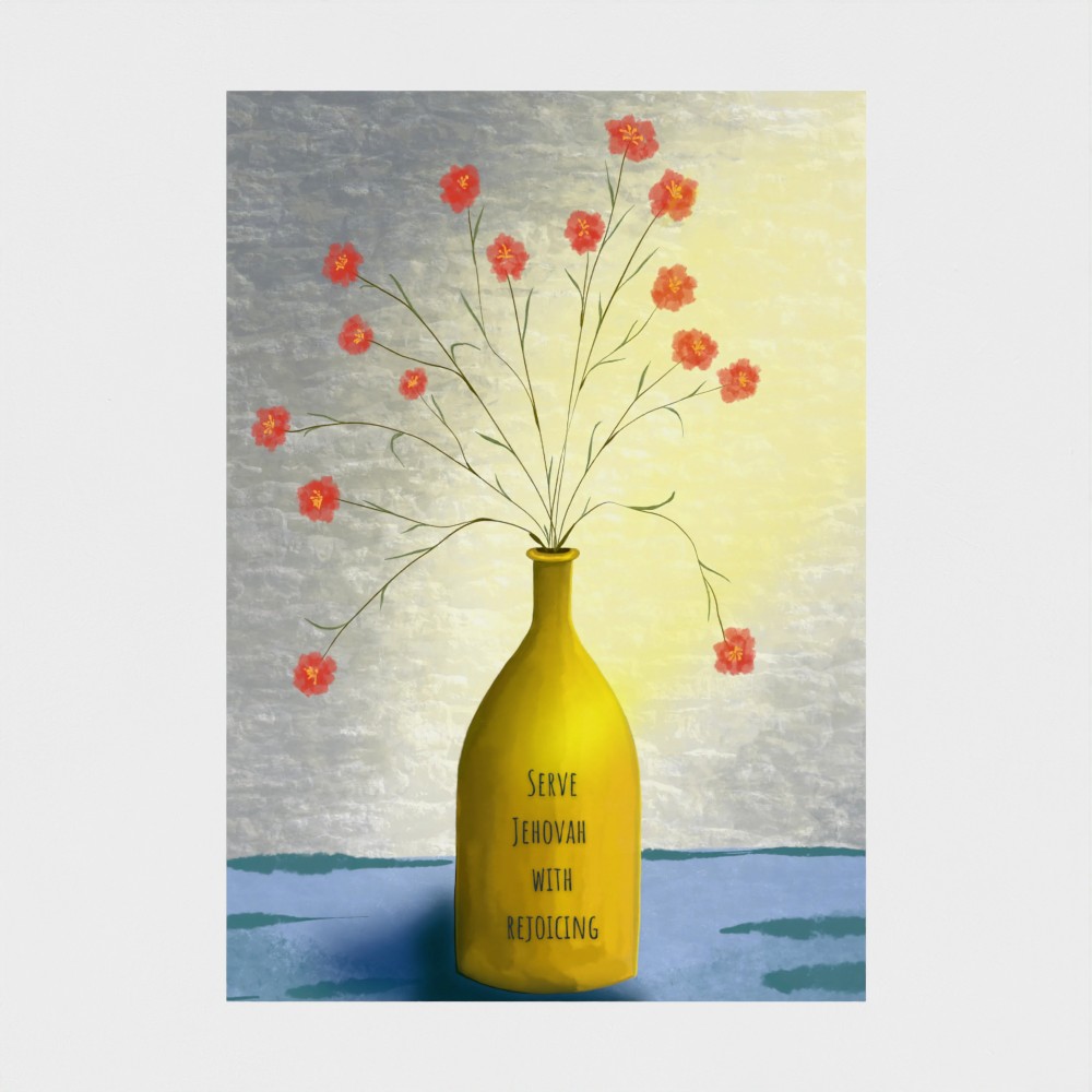 A soft painterly design of delicate flowers arranged in a vase with scripture “Serve Jehovah with rejoiceing” typography, bringing warmth and a gentle artistic feel to any room.