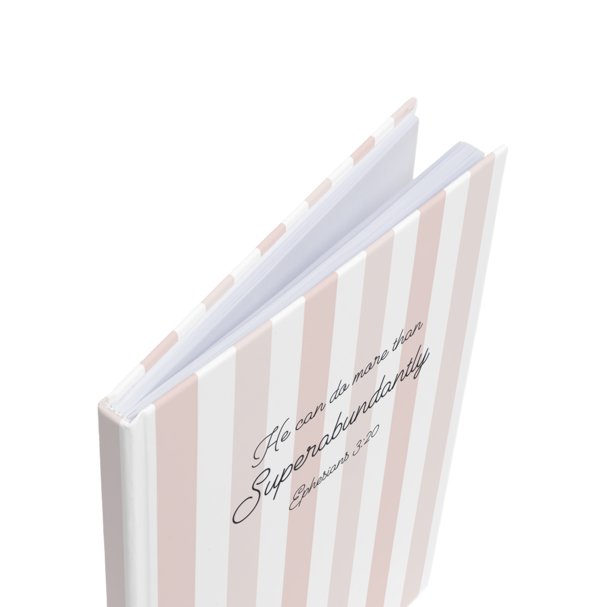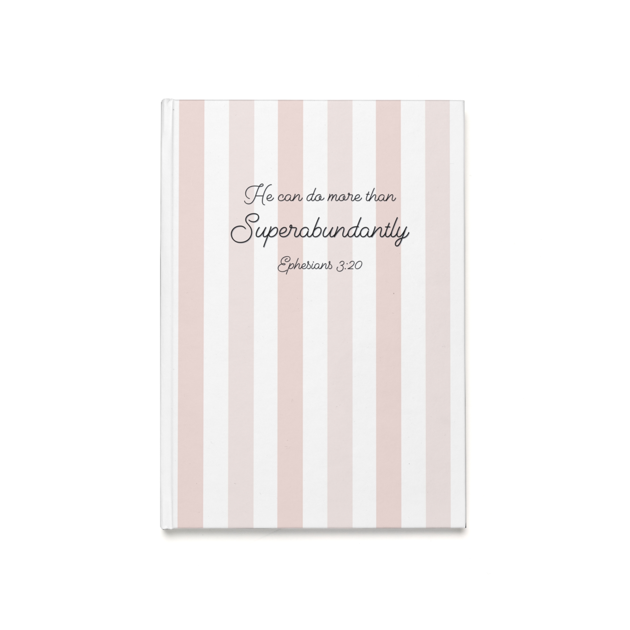 This A5 hardback journal features a simple striped design with the encouraging words “He can do more than superabundantly” from Ephesians 3:20 on the cover, making it a practical and uplifting notebook for everyday use.