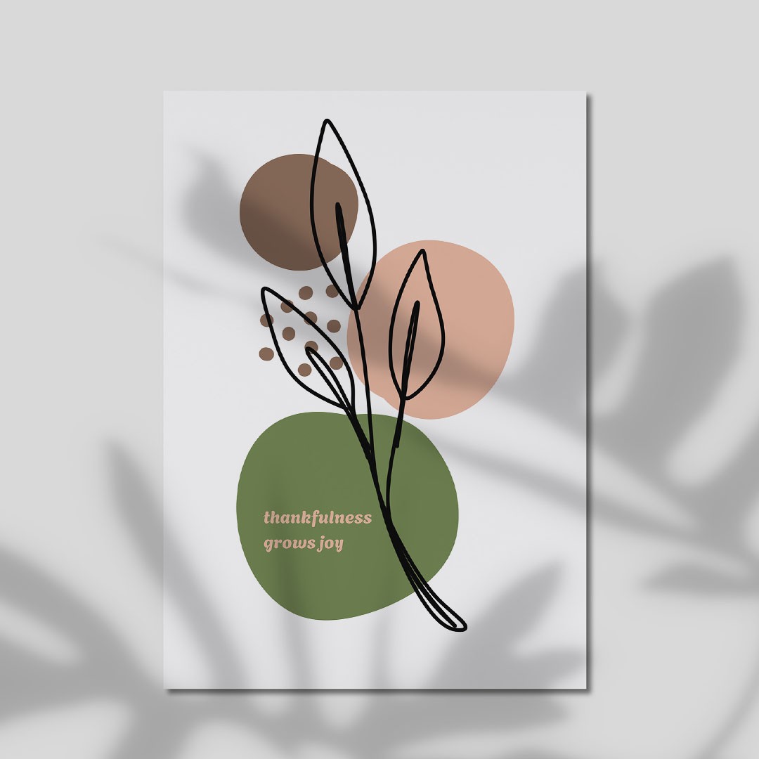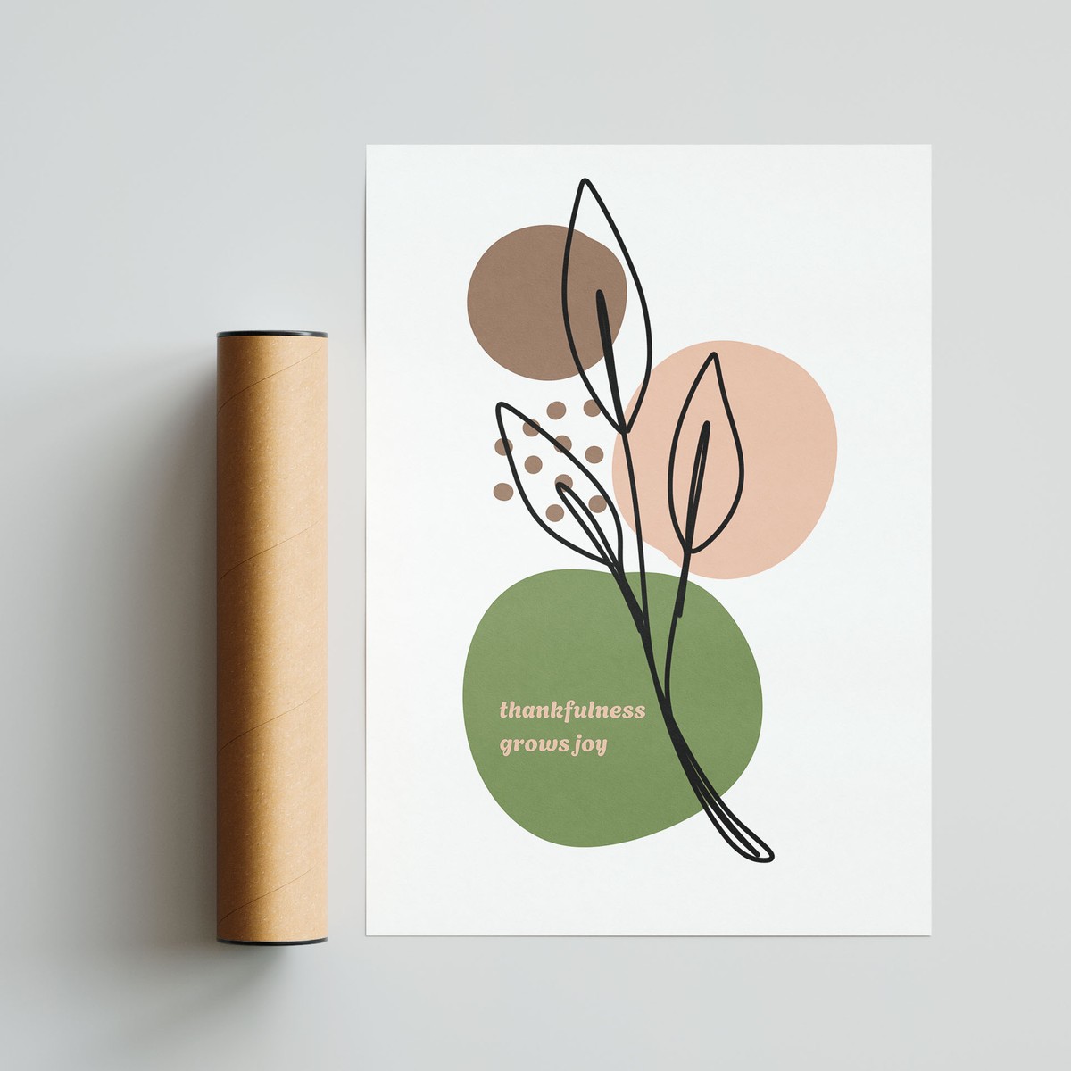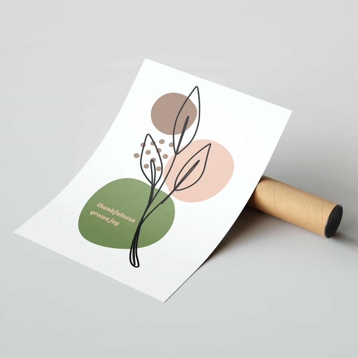 A soft, neutral-toned botanical print with abstract shapes and delicate line art, featuring the gentle phrase “thankfulness grows joy.” Designed to inspire gratitude and quiet reflection in everyday life.