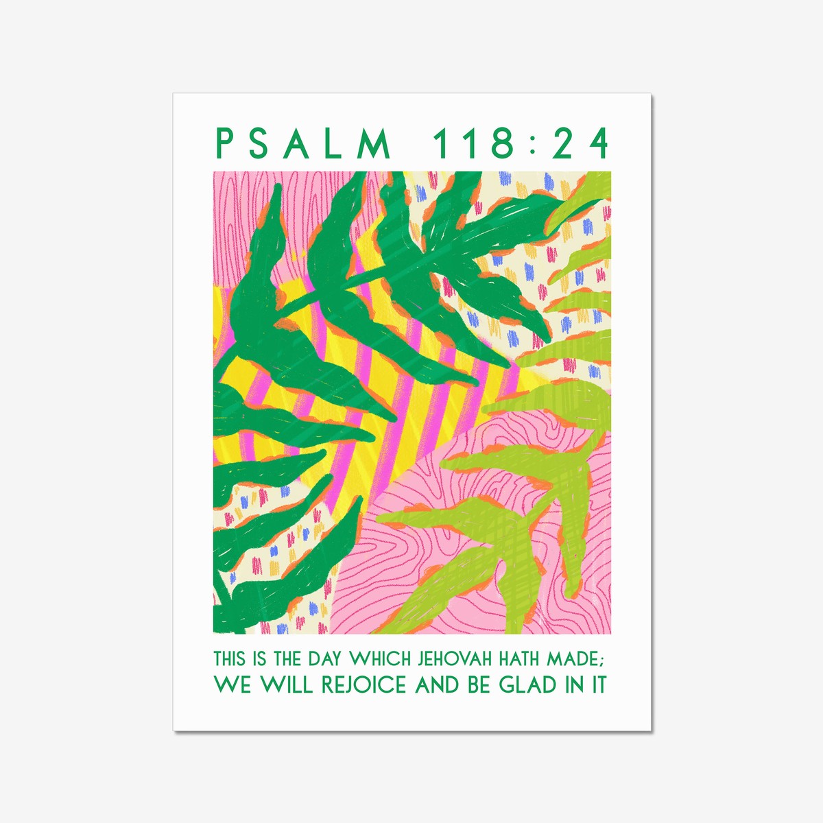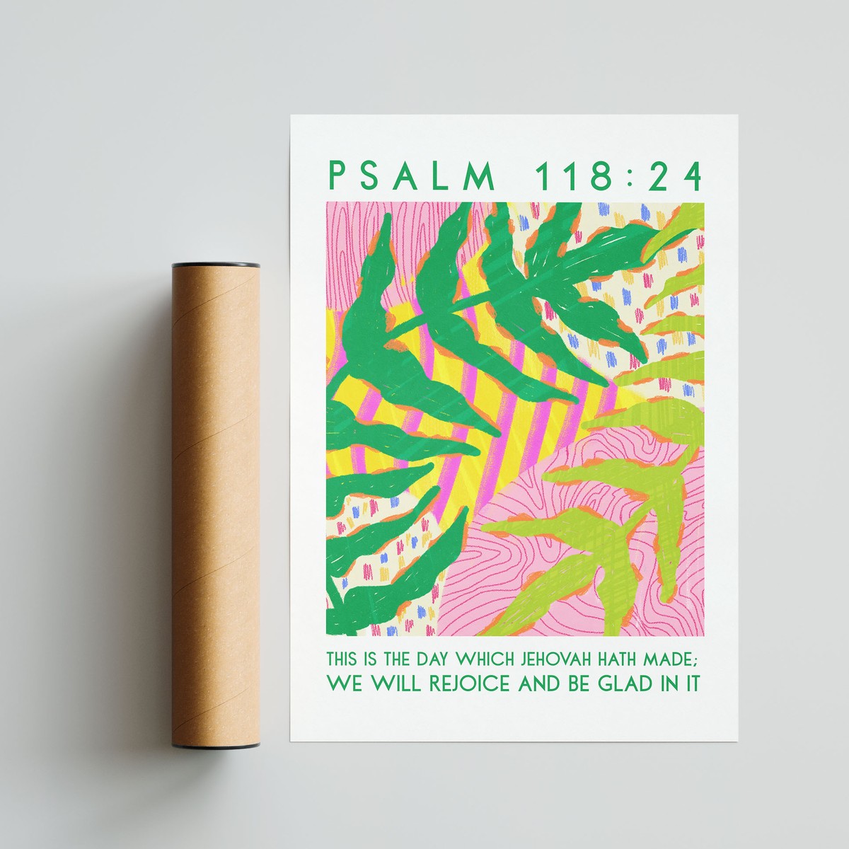 This vibrant art print features a bold and expressive botanical design, combining bright tones of green, pink, and yellow in a playful, modern composition. Paired with the uplifting words “This is the day which Jehovah hath made; we will rejoice and be glad in it” – Psalm 118:24, it creates a joyful and encouraging piece.