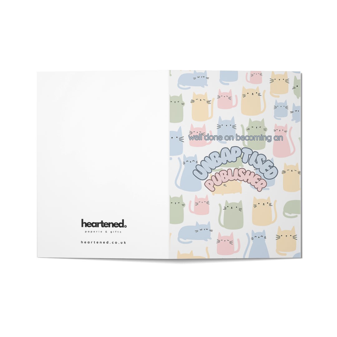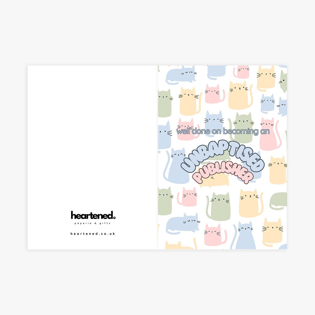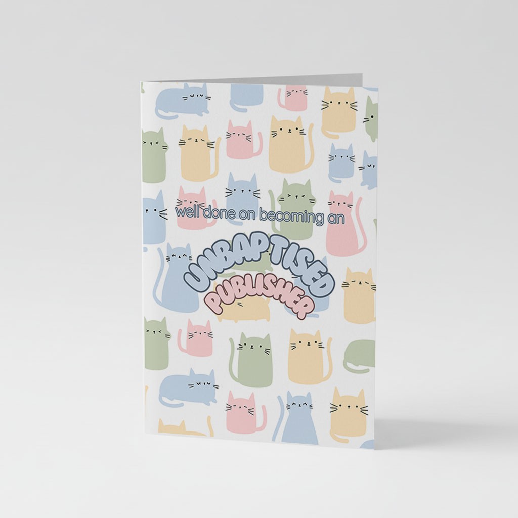 This fun A6 greeting card features a playful pattern of colourful, illustrated cats in soft pastel tones, creating a light and cheerful design. Paired with the message “well done on becoming an unbaptised publisher”, it’s a joyful way to celebrate this special spiritual milestone.