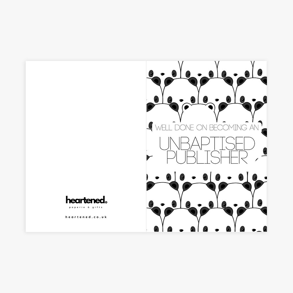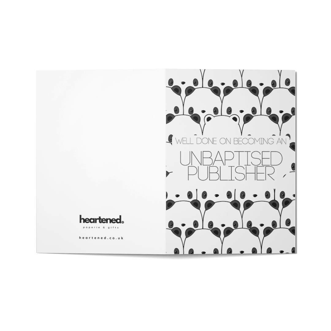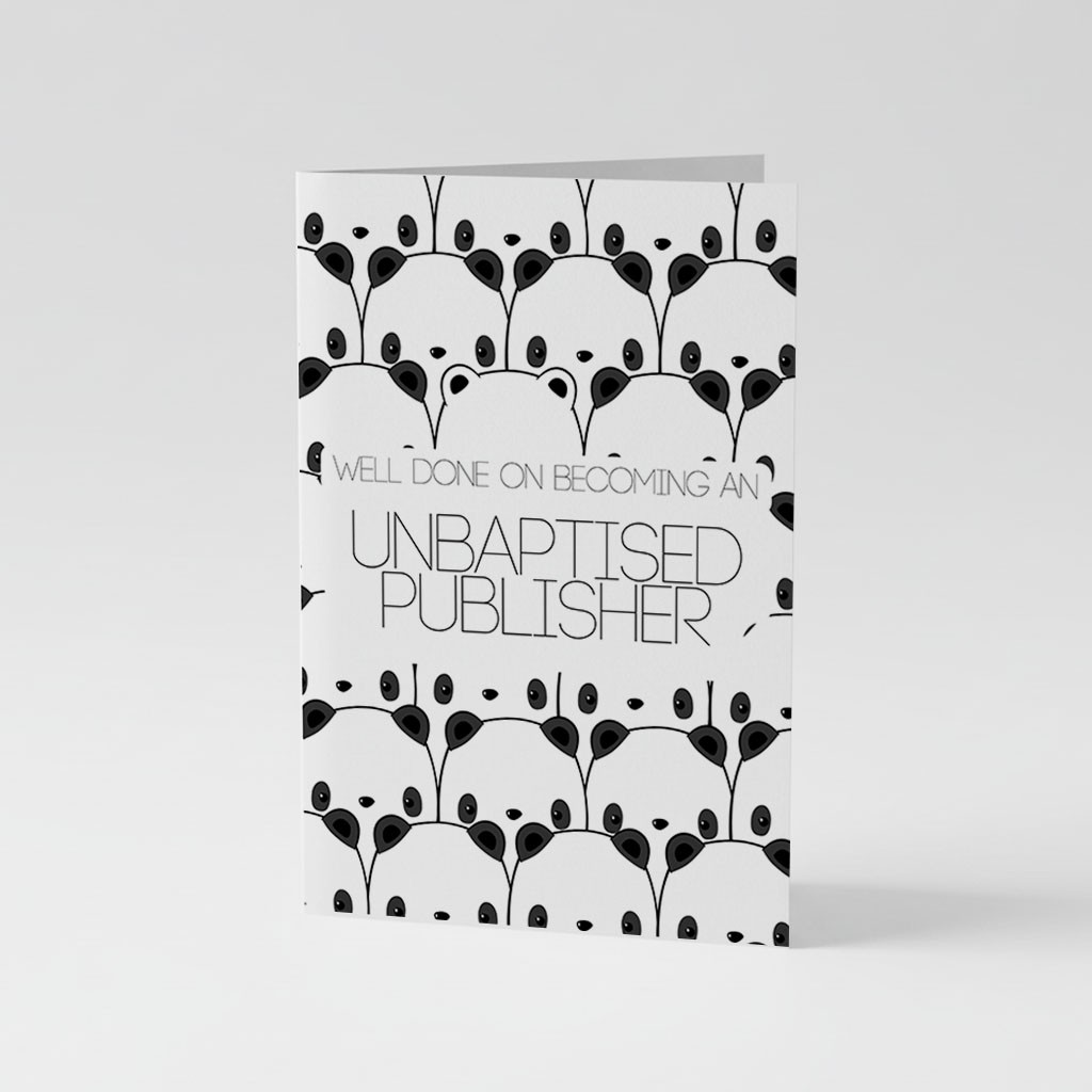 This stylish A6 greeting card features a playful pattern of illustrated panda faces in a simple black and white design, creating a modern and eye-catching look. The message “well done on becoming an unbaptised publisher” is presented in a clean, minimal font, making it a thoughtful way to celebrate this special milestone.