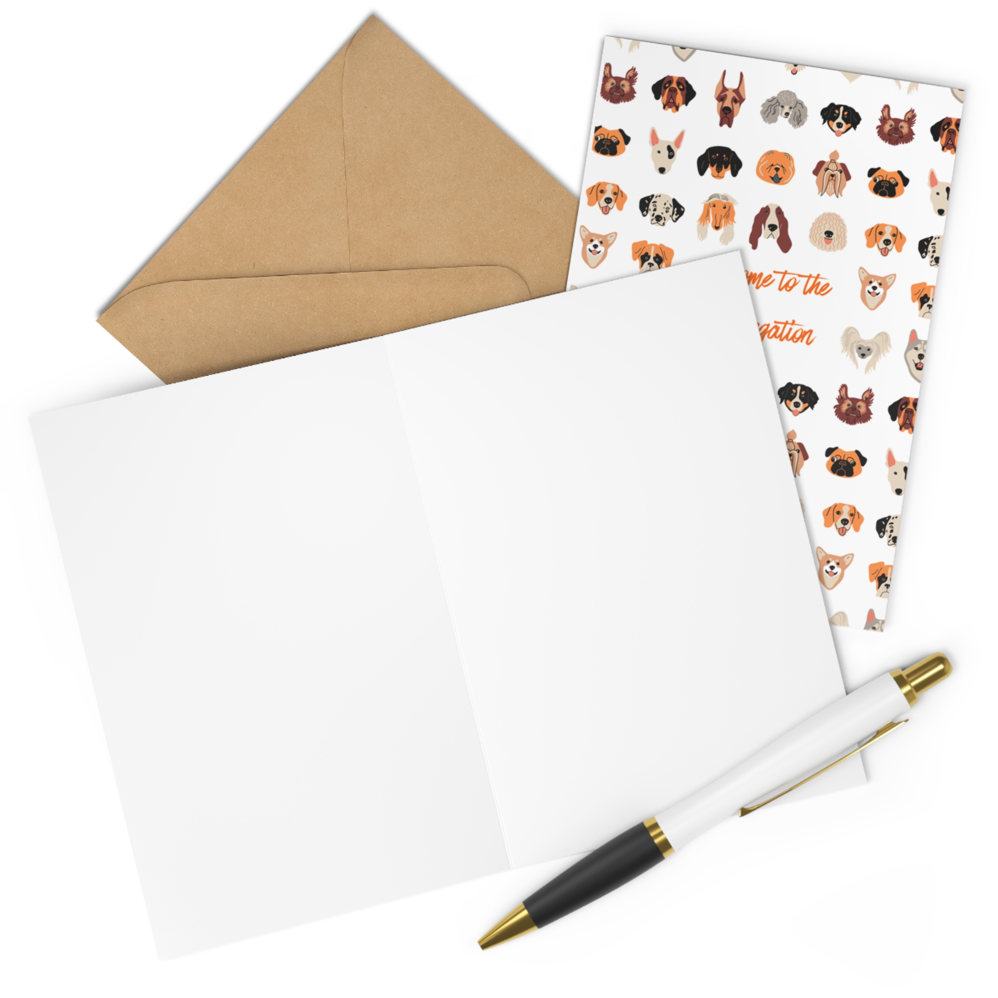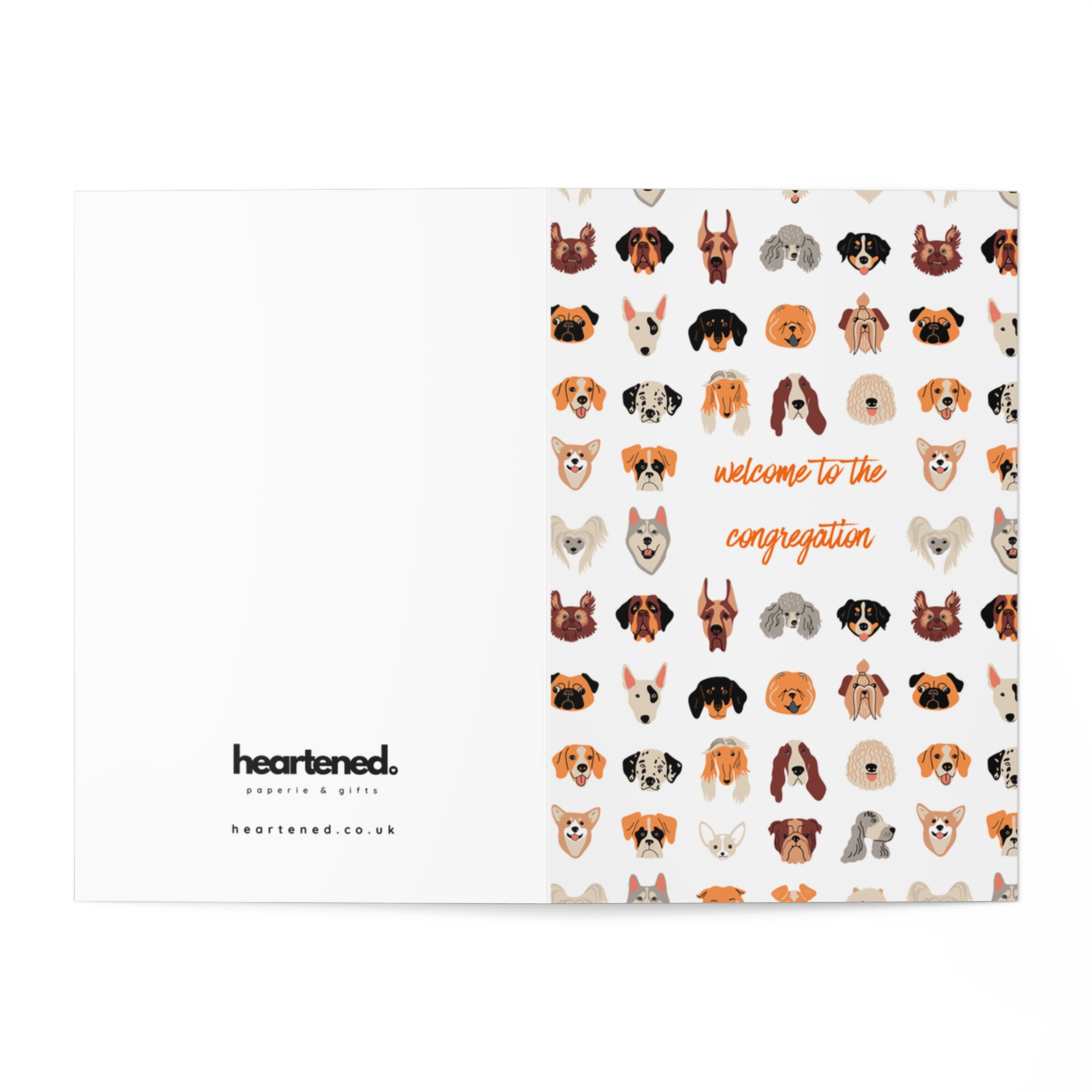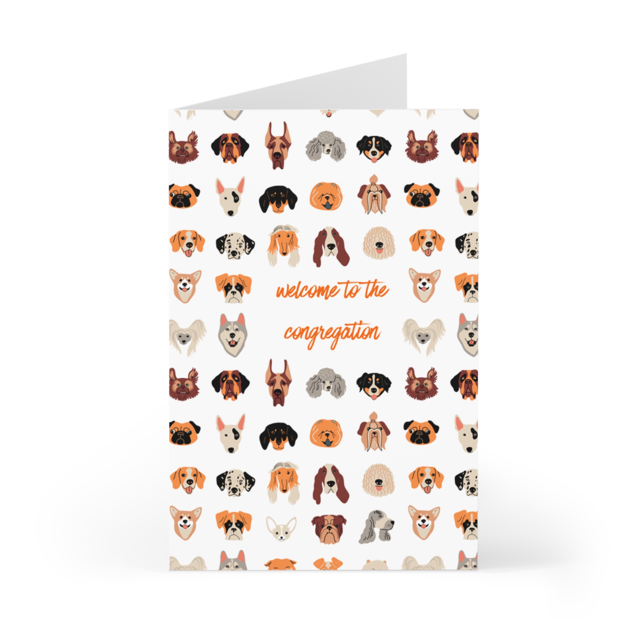 This playful greeting card features a fun dog illustration pattern with the message: “Welcome to the congregation.”