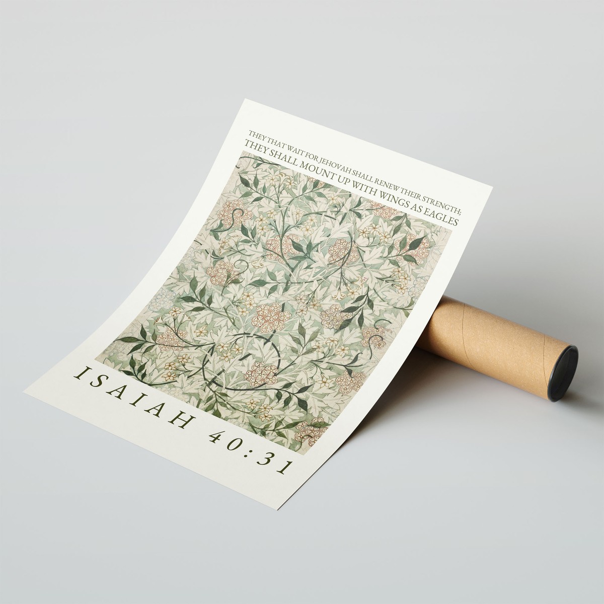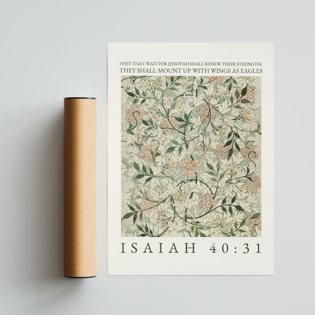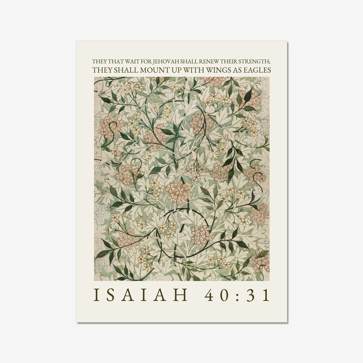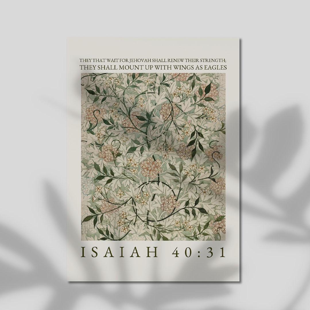 This elegant art print features a beautifully detailed floral pattern in soft, calming tones of sage green, cream, and muted blush, inspired by classic botanical designs. Paired with the uplifting words “They that wait for Jehovah shall renew their strength; they shall mount up with wings as eagles” – Isaiah 40:31, it creates a meaningful and encouraging piece.