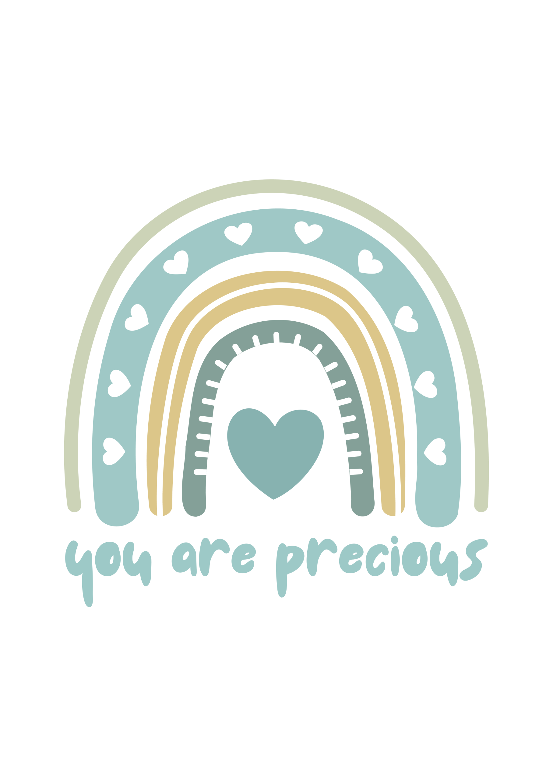 A beautifully soft rainbow design with delicate heart details, paired with the reassuring words “You are precious.”