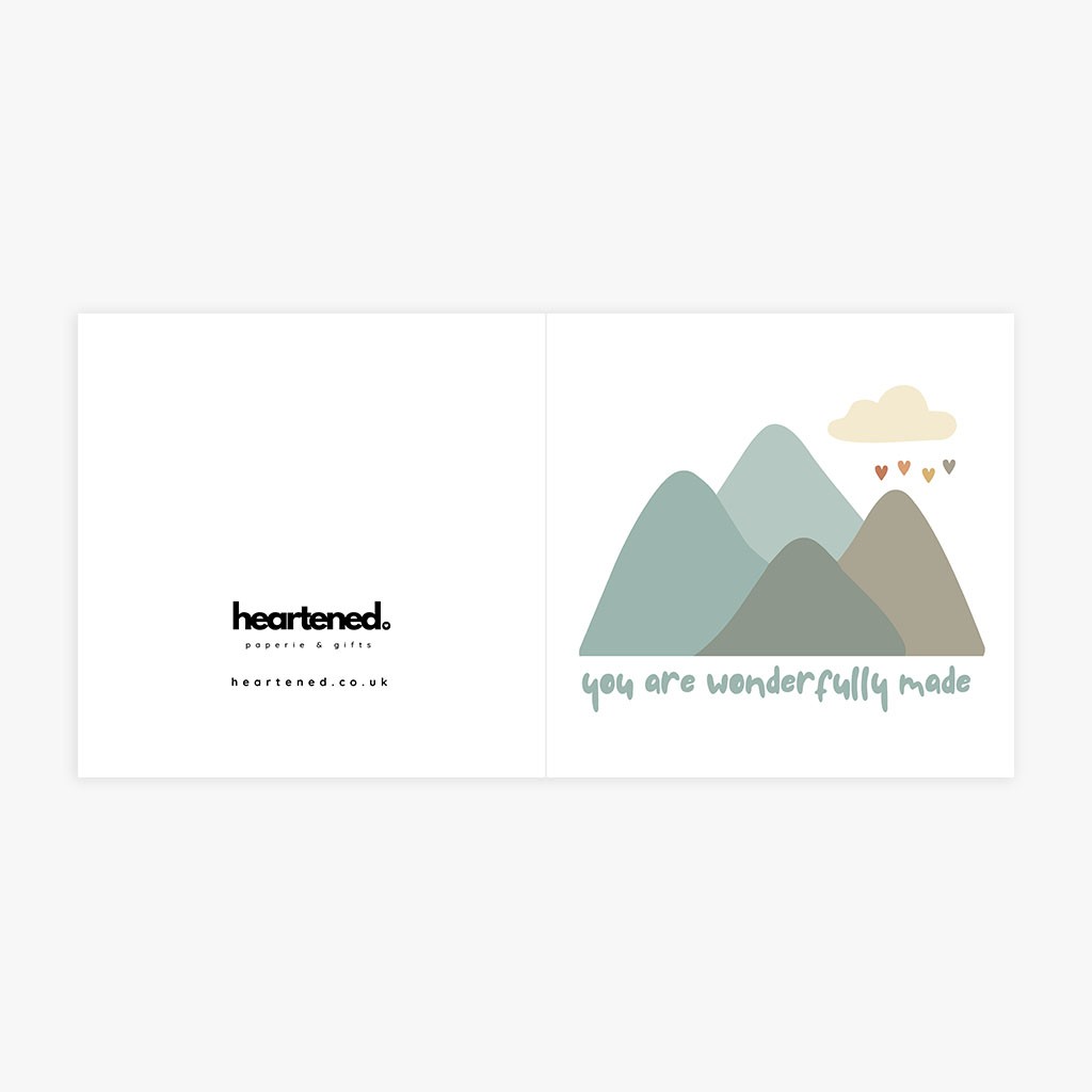 A soft and calming mountain design paired with the uplifting message “You are wonderfully made.”